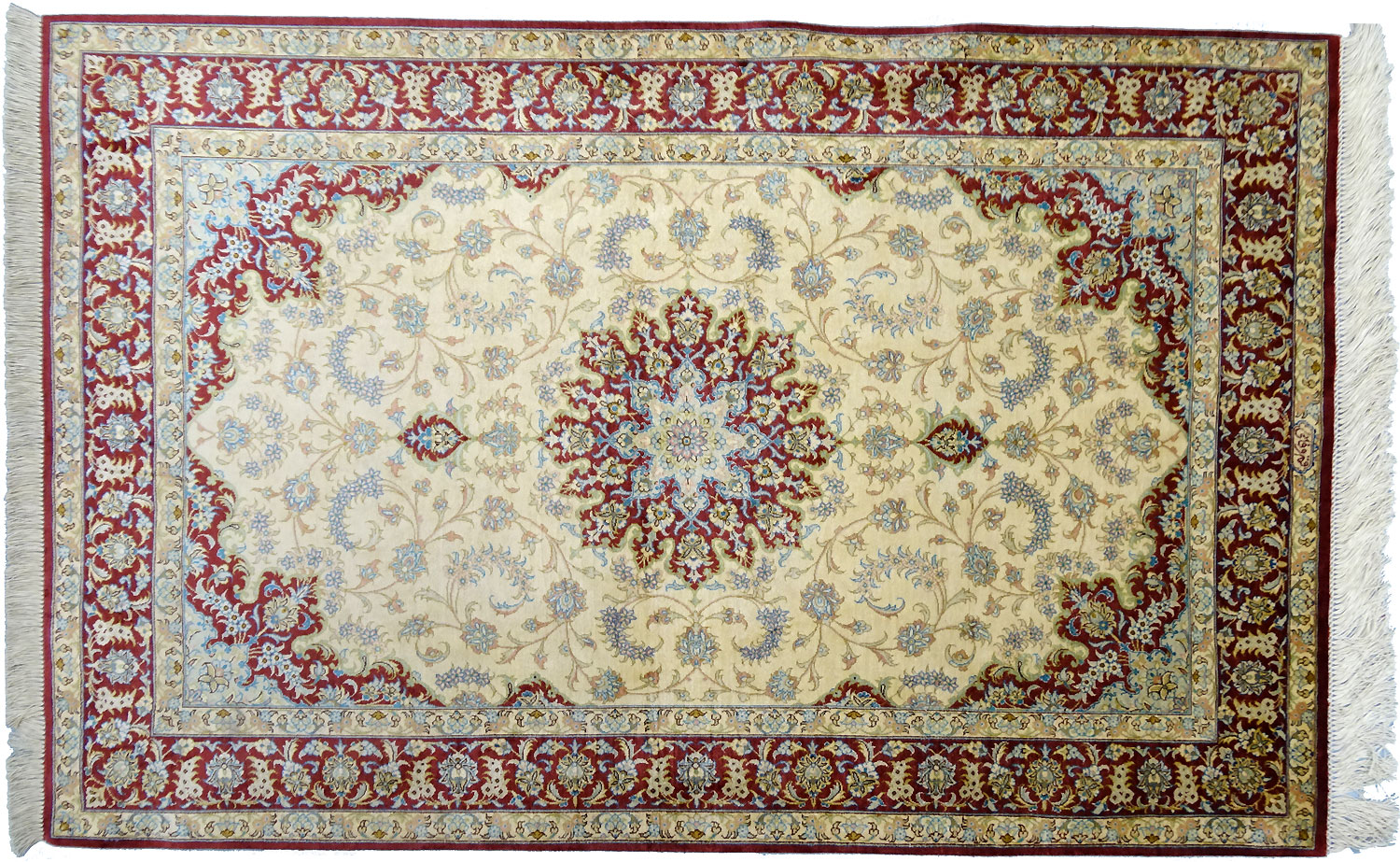 Dimensions : 140 x 97 cm -soie- Pays Iran - Épaisseur : 3 mm - Densité de nouage : 1.000.000 Nœuds au m² - Surface : 1.36 m² - Poids : 2.72 Kgs - Age : contemporain - Confection : Noué main - Forme : Tapis de chambre - Type : Tapis persan