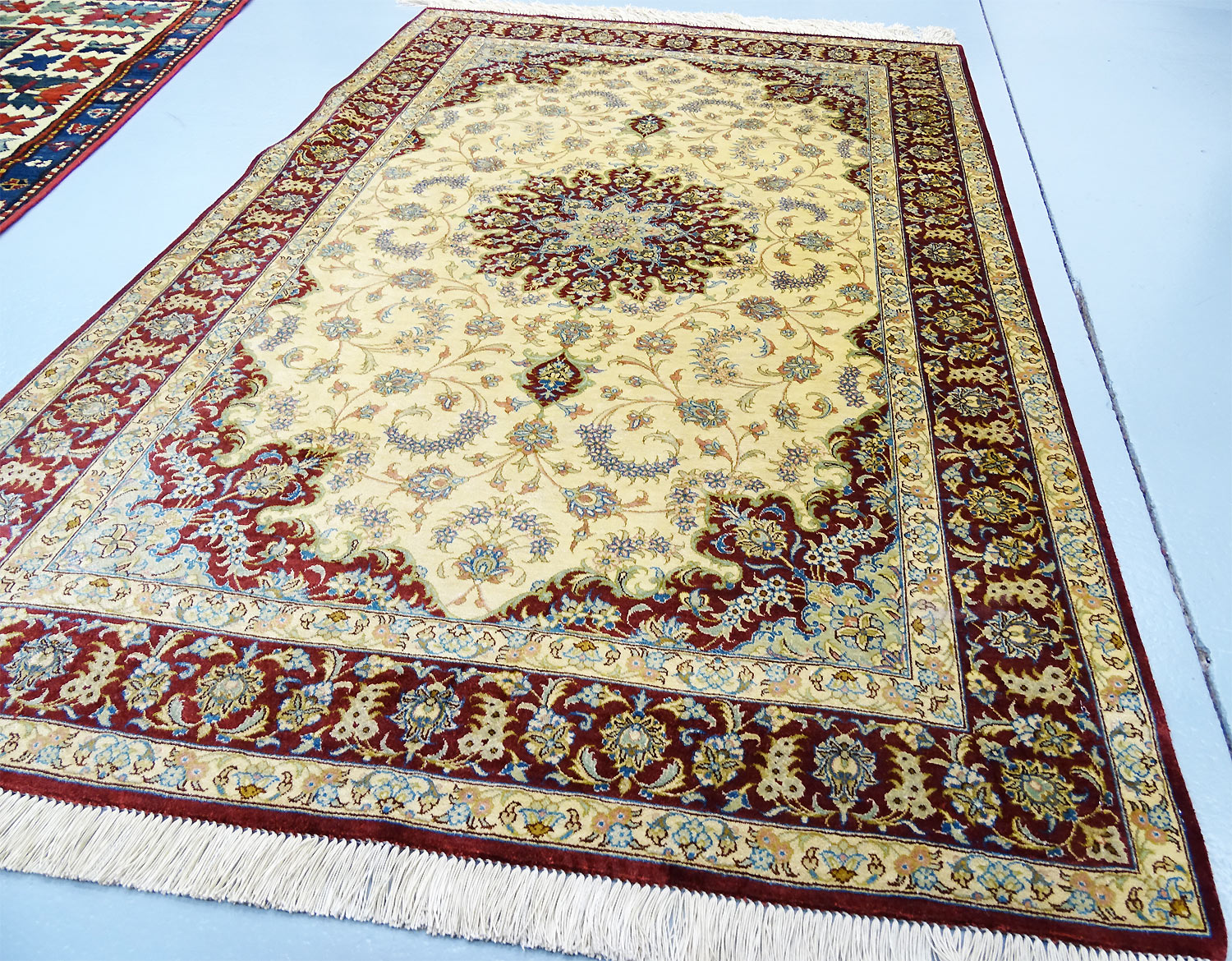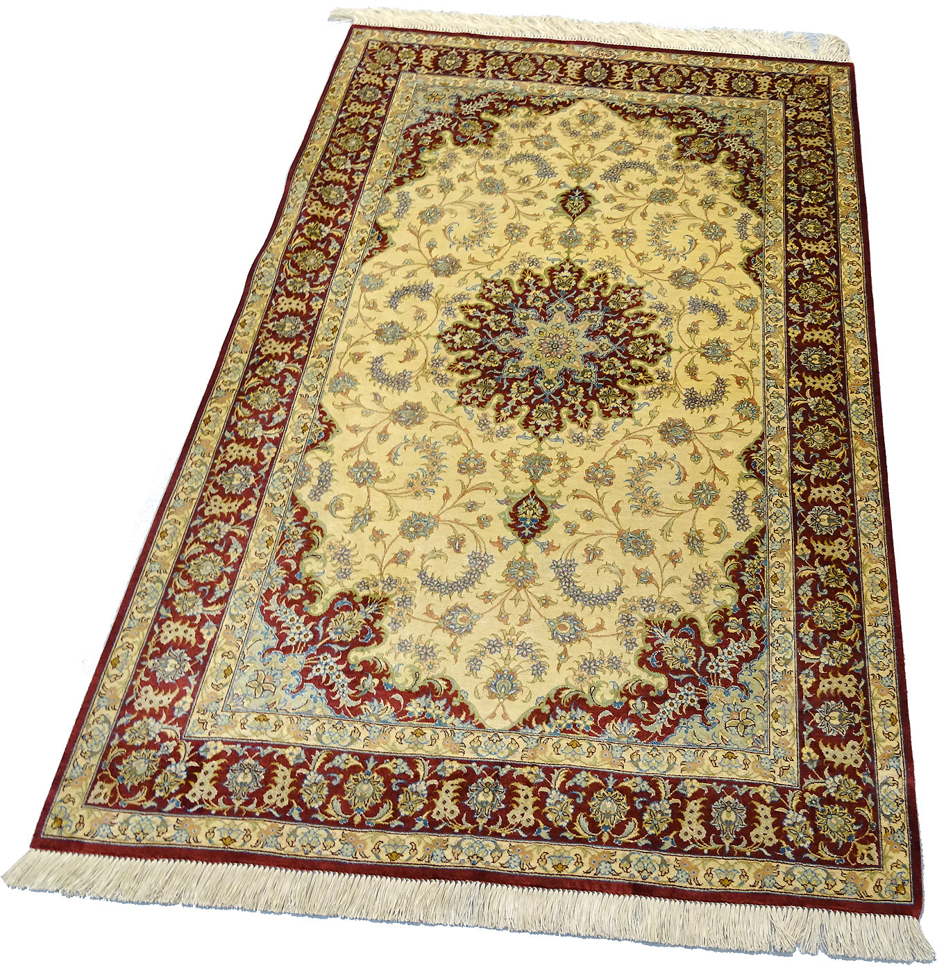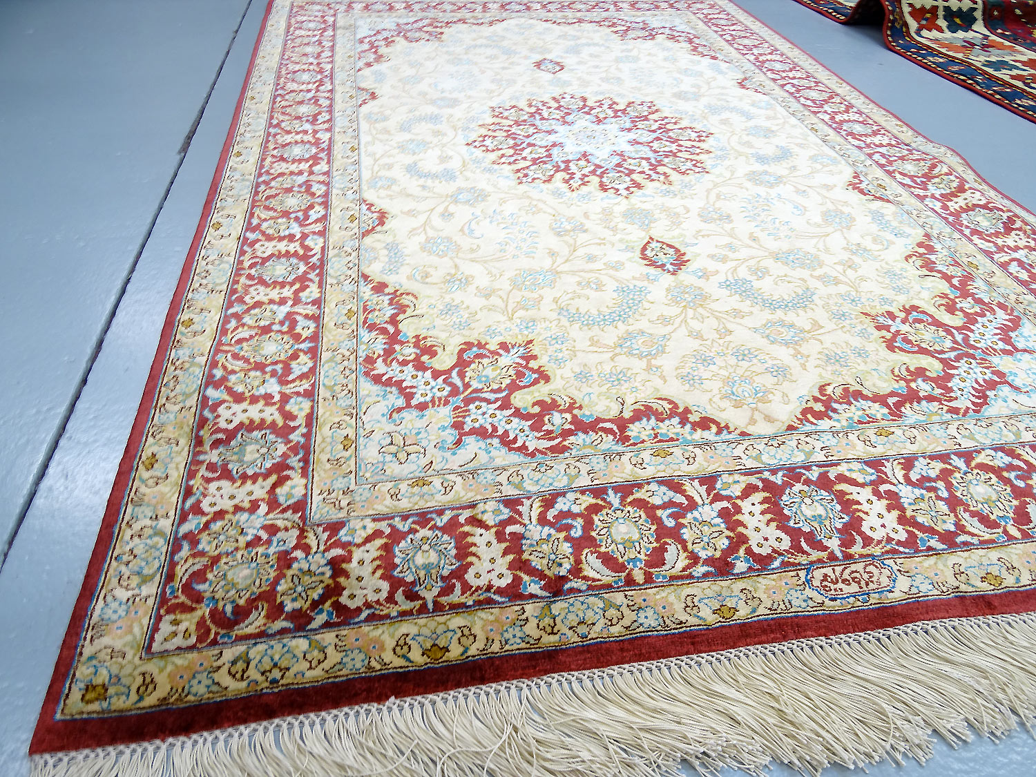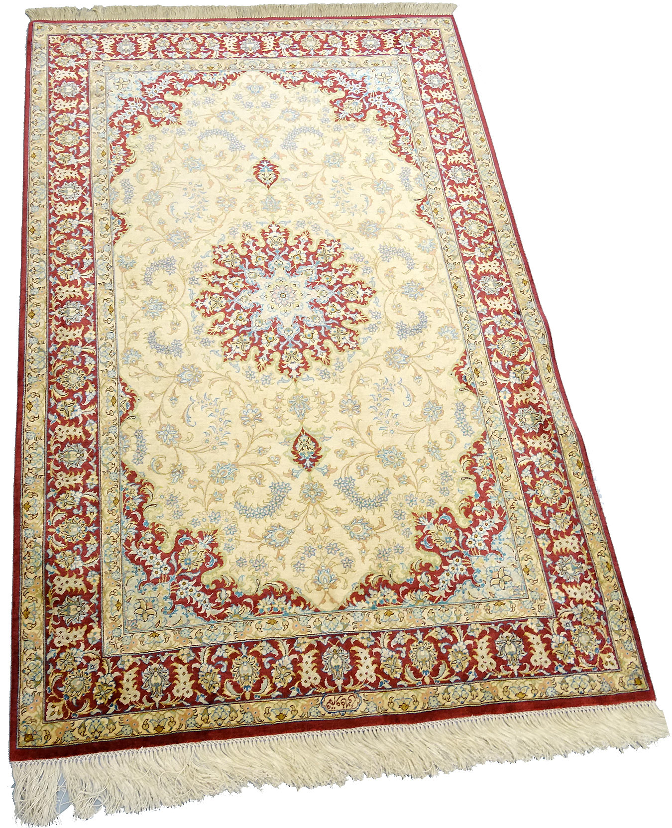 Dimensions : 148 x 98 cm -soie- Pays Iran - Épaisseur : 3 mm - Densité de nouage : 1.000.000 Nœuds au m² - Surface : 1.45 m² - Poids : 2.9 Kgs - Age : contemporain - Confection : Noué main - Forme : Tapis de chambre - Type : Tapis persan