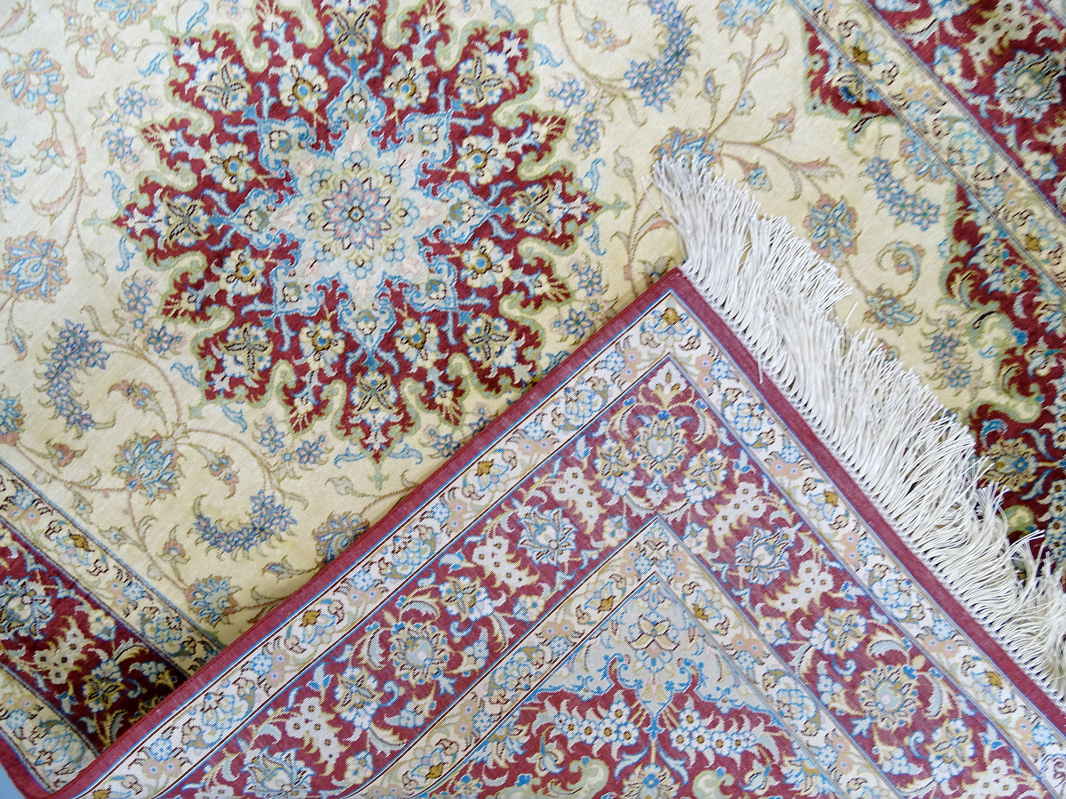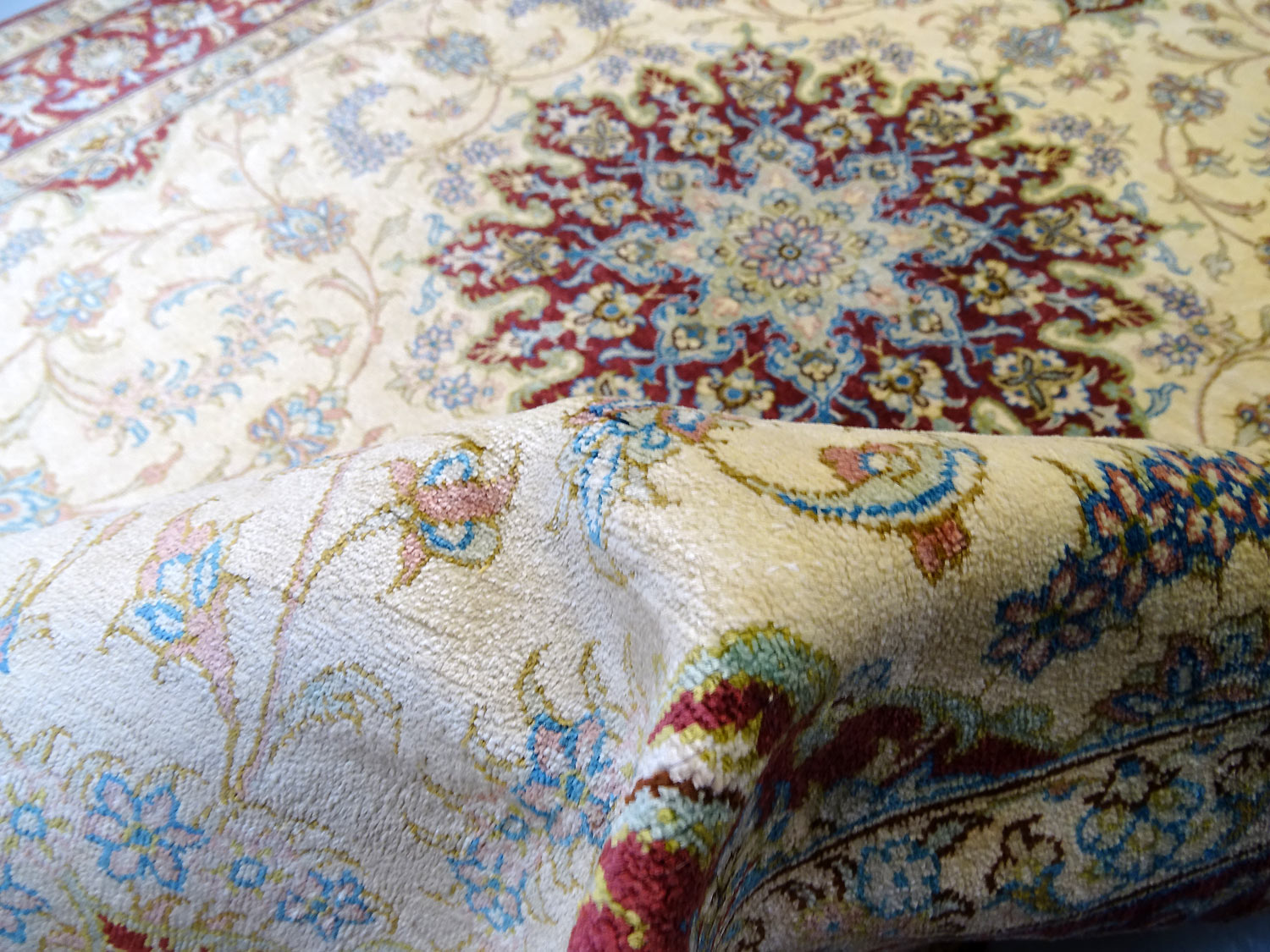 Dimensions : 150 x 100 cm -soie- Pays Iran - Épaisseur : 3 mm - Densité de nouage : 1.000.000 Nœuds au m² - Surface : 1.5 m² - Poids : 3 Kgs - Age : contemporain - Confection : Noué main - Forme : Tapis de chambre - Type : Tapis persan