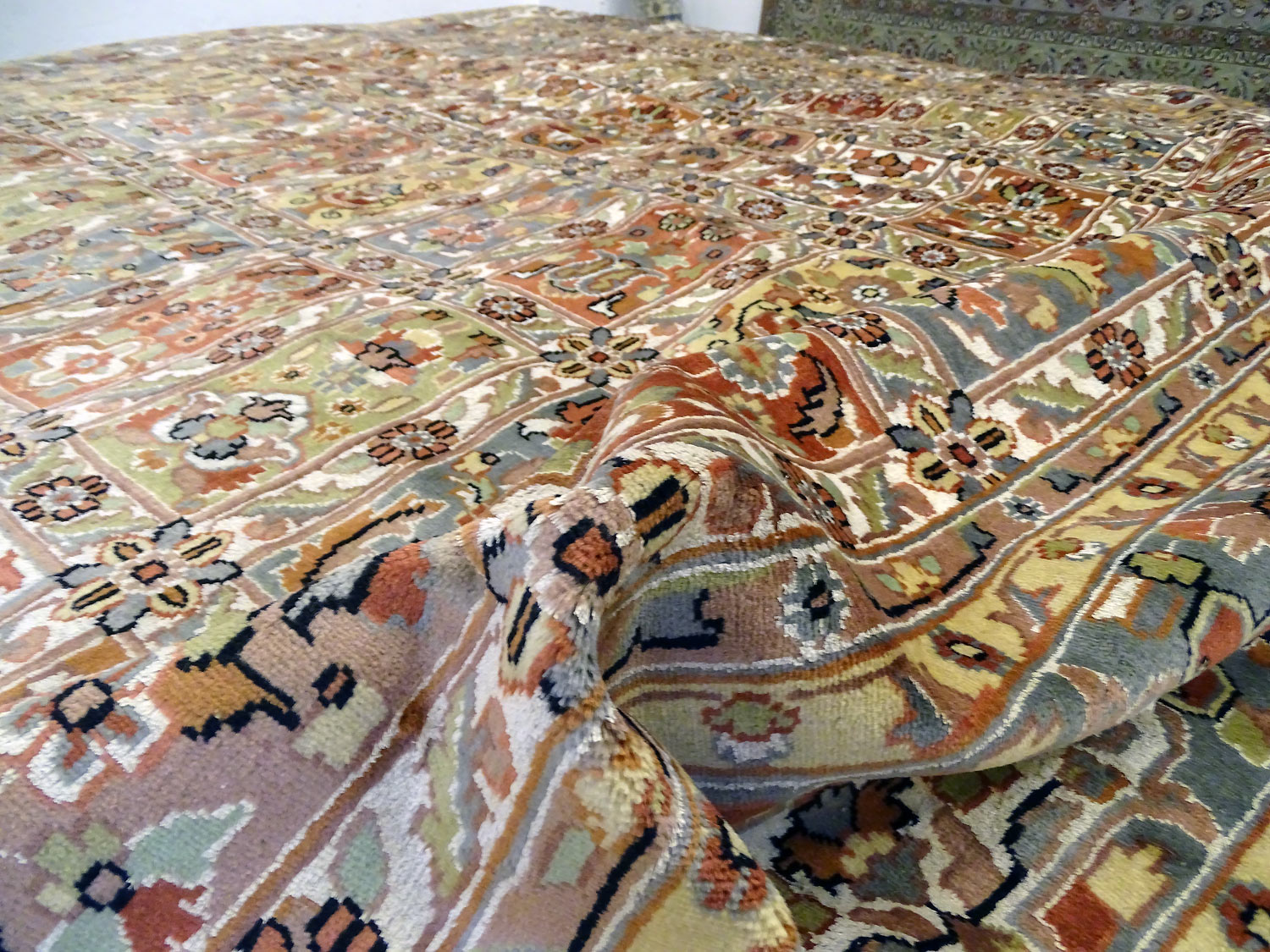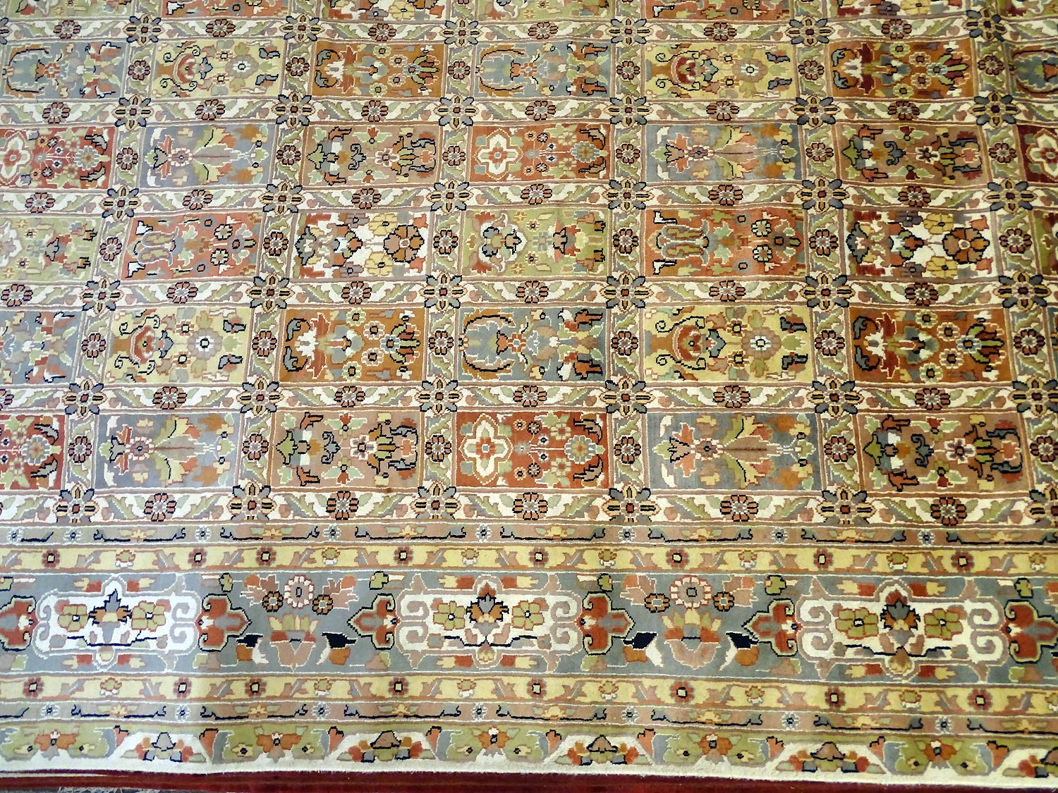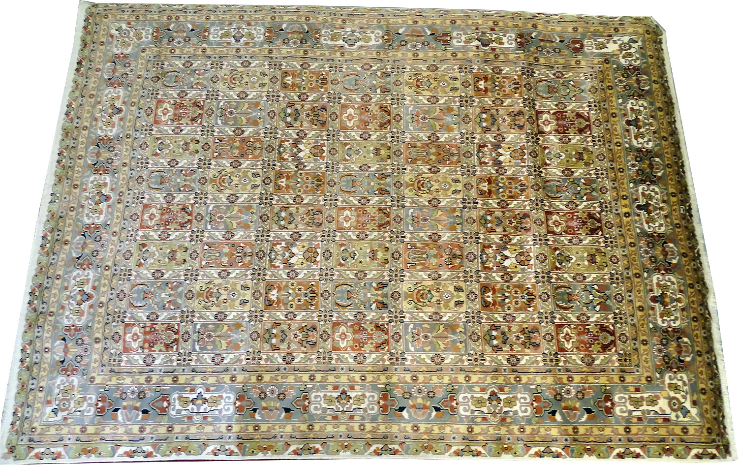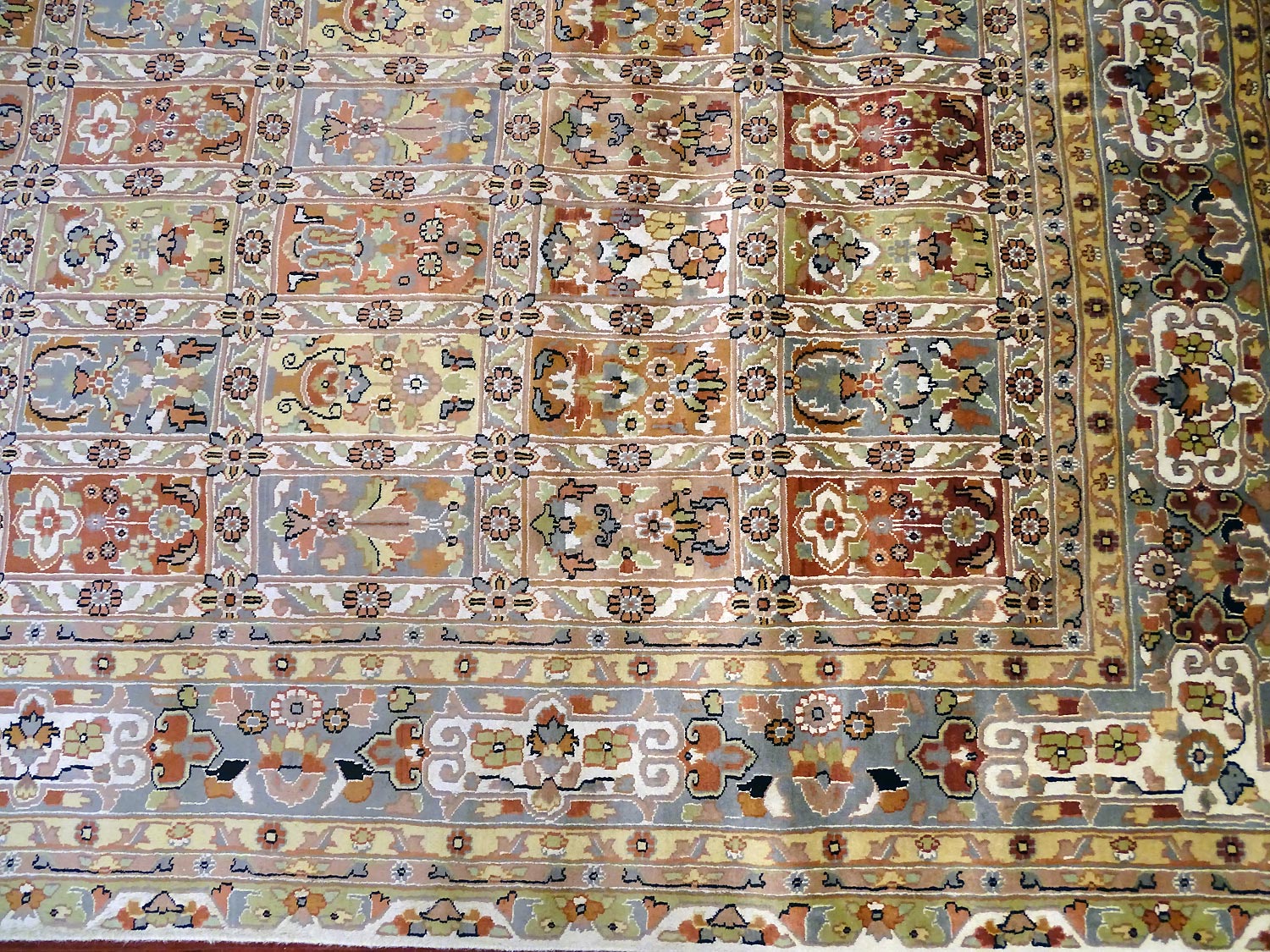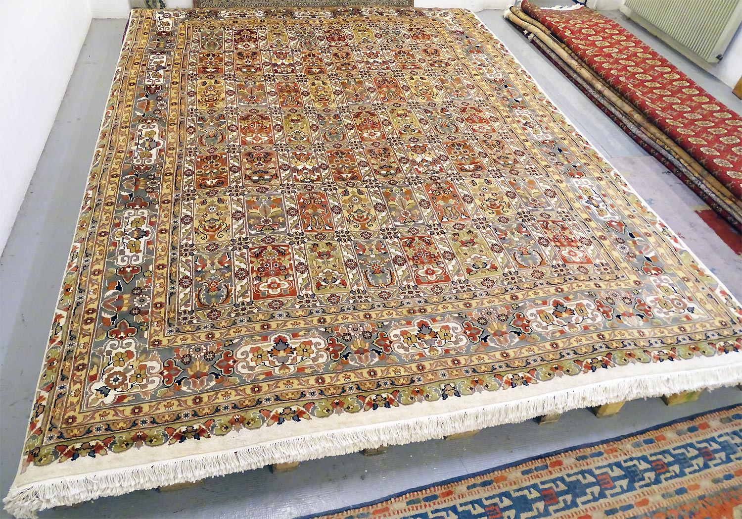Dimensions : 376 x 283 cm -laine et soie- Pays Pakistan - Épaisseur : 7 mm - Densité de nouage : 200.000 Nœuds au m² - Surface : 10.64 m² - Poids : 26.6 Kgs - Age : contemporain - Confection : Noué main - Forme : Tapis de salon - Type : Tapis Oriental