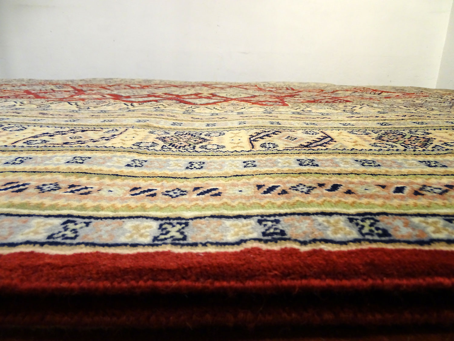 Dimensions : 374 x 274 cm -laine- Pays Pakistan - Épaisseur : 7 mm - Densité de nouage : 250.000 Nœuds au m² - Surface : 10.25 m² - Poids : 20.5 Kgs - Age : contemporain - Confection : Noué main - Forme : Tapis de salon - Type : Tapis Oriental
