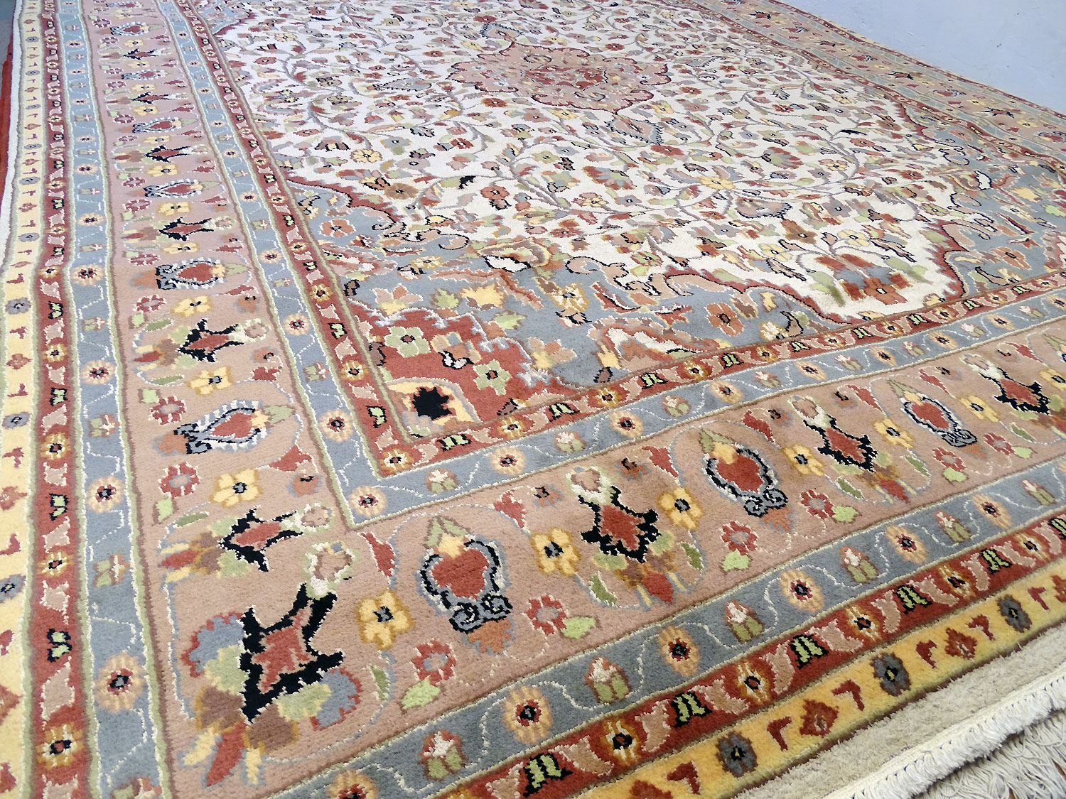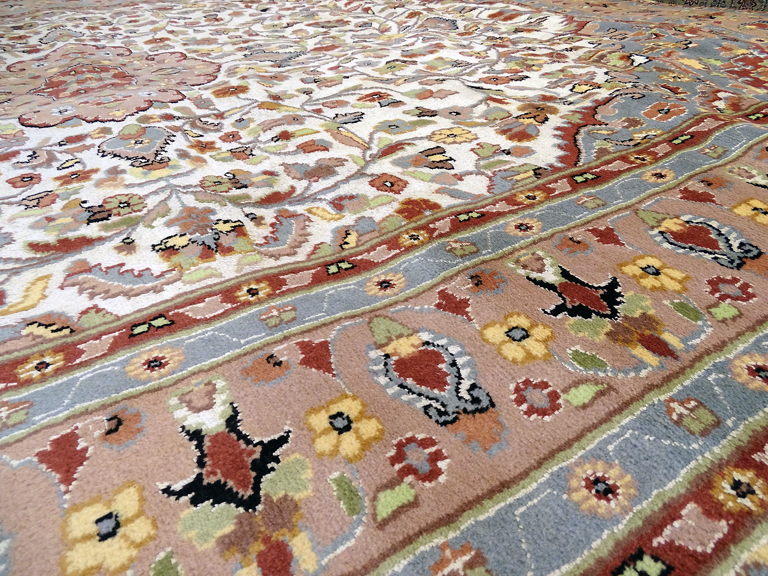 Dimensions : 352 x 253 cm -laine et soie- Pays Pakistan - Épaisseur : 7 mm - Densité de nouage : 200.000 Nœuds au m² - Surface : 8.91 m² - Poids : 22.26 Kgs - Age : contemporain - Confection : Noué main - Forme : Tapis de salon - Type : Tapis Oriental