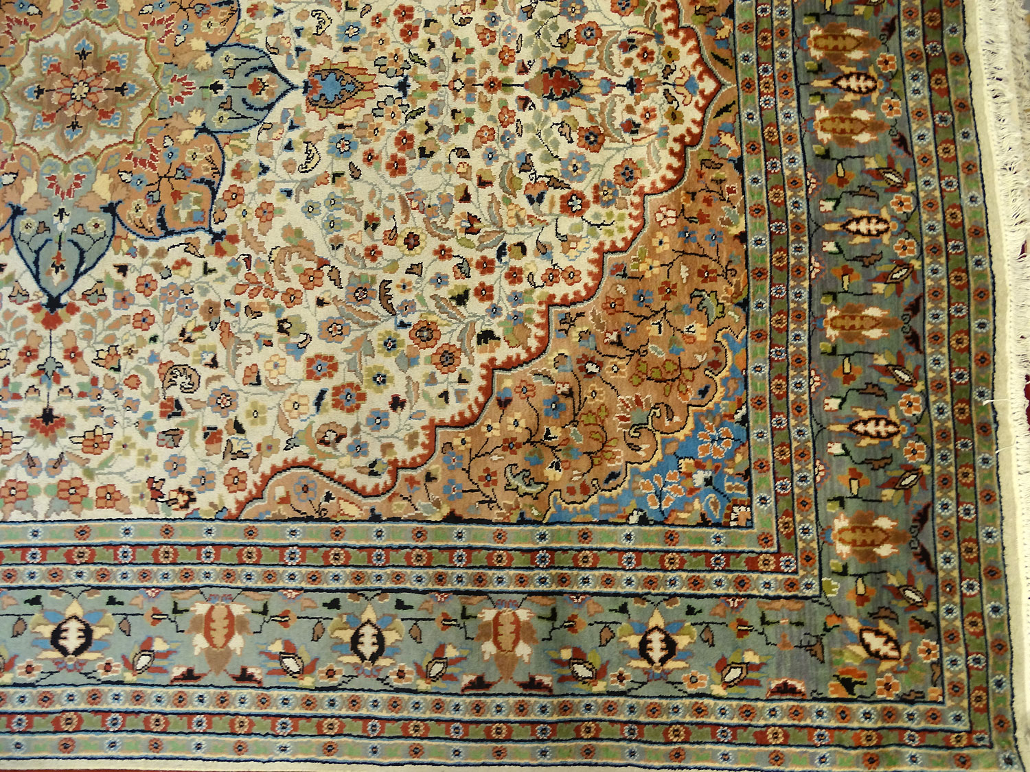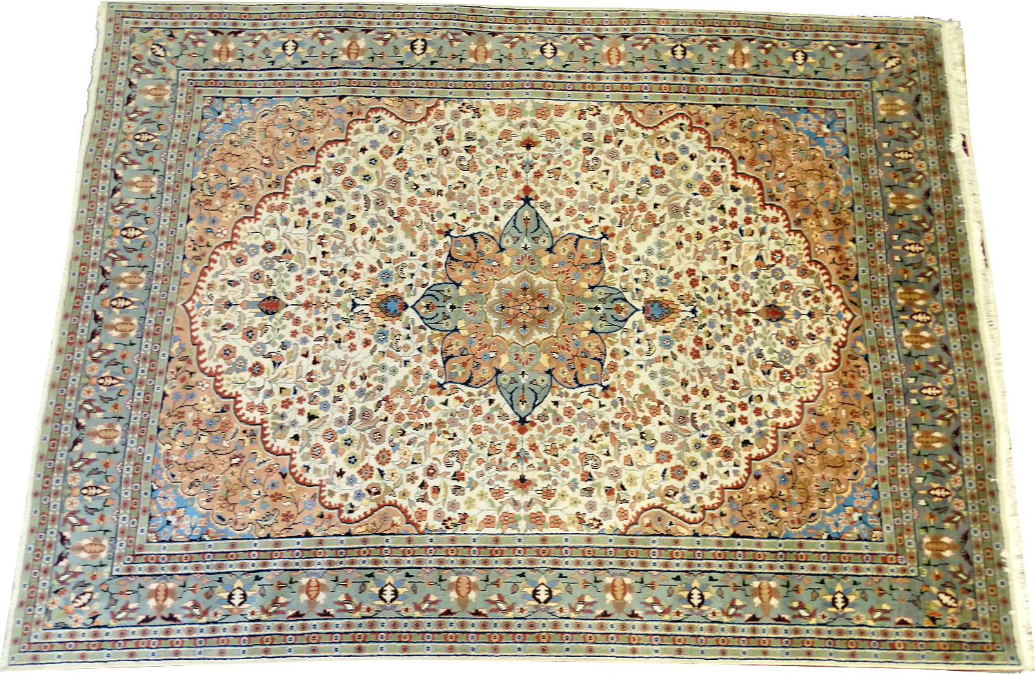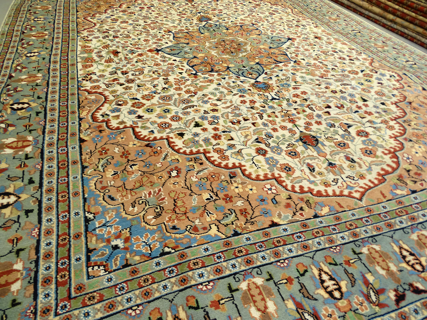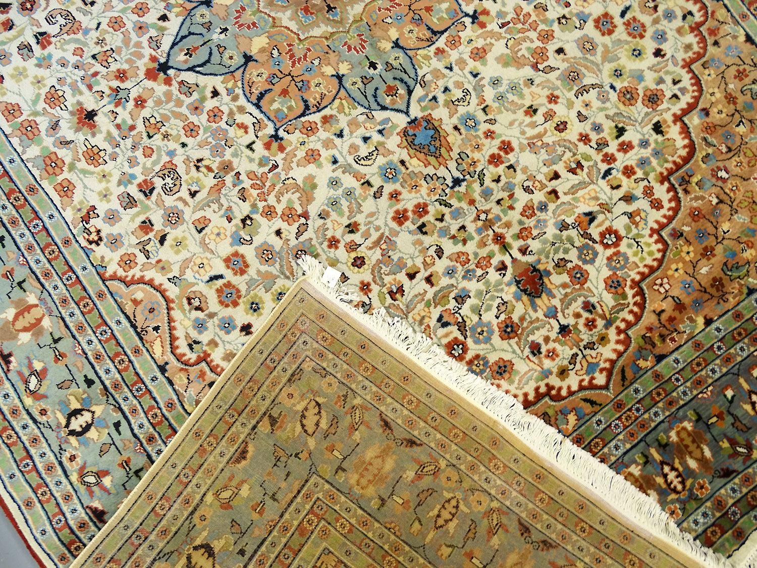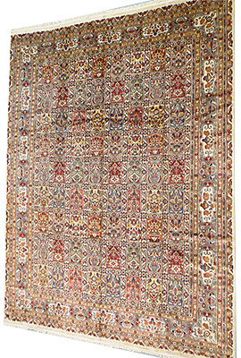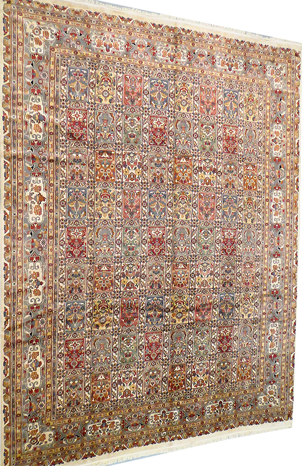 Dimensions : 375 x 284 cm -laine et soie- Pays Pakistan - Épaisseur : 7 mm - Densité de nouage : 200.000 Nœuds au m² - Surface : 10.65 m² - Poids : 26.63 Kgs - Age : contemporain - Confection : Noué main - Forme : Tapis de salon - Type : Tapis Oriental