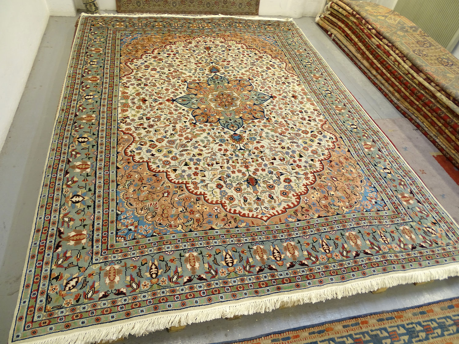 Dimensions : 376 x 283 cm -laine et soie- Pays Pakistan - Épaisseur : 7 mm - Densité de nouage : 200.000 Nœuds au m² - Surface : 10.64 m² - Poids : 26.6 Kgs - Age : contemporain - Confection : Noué main - Forme : Tapis de salon - Type : Tapis Oriental