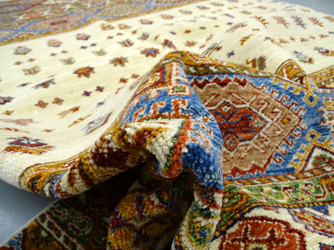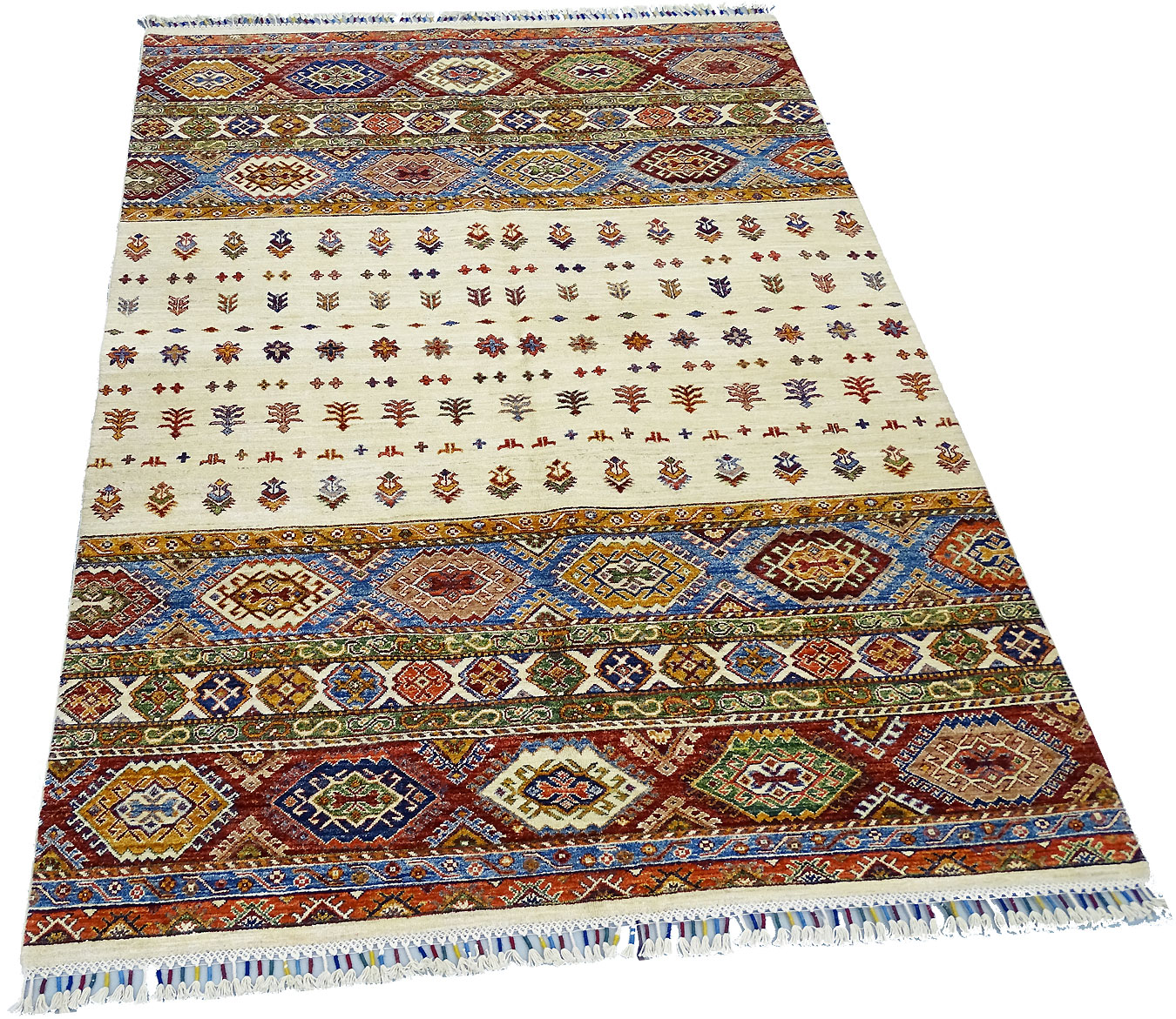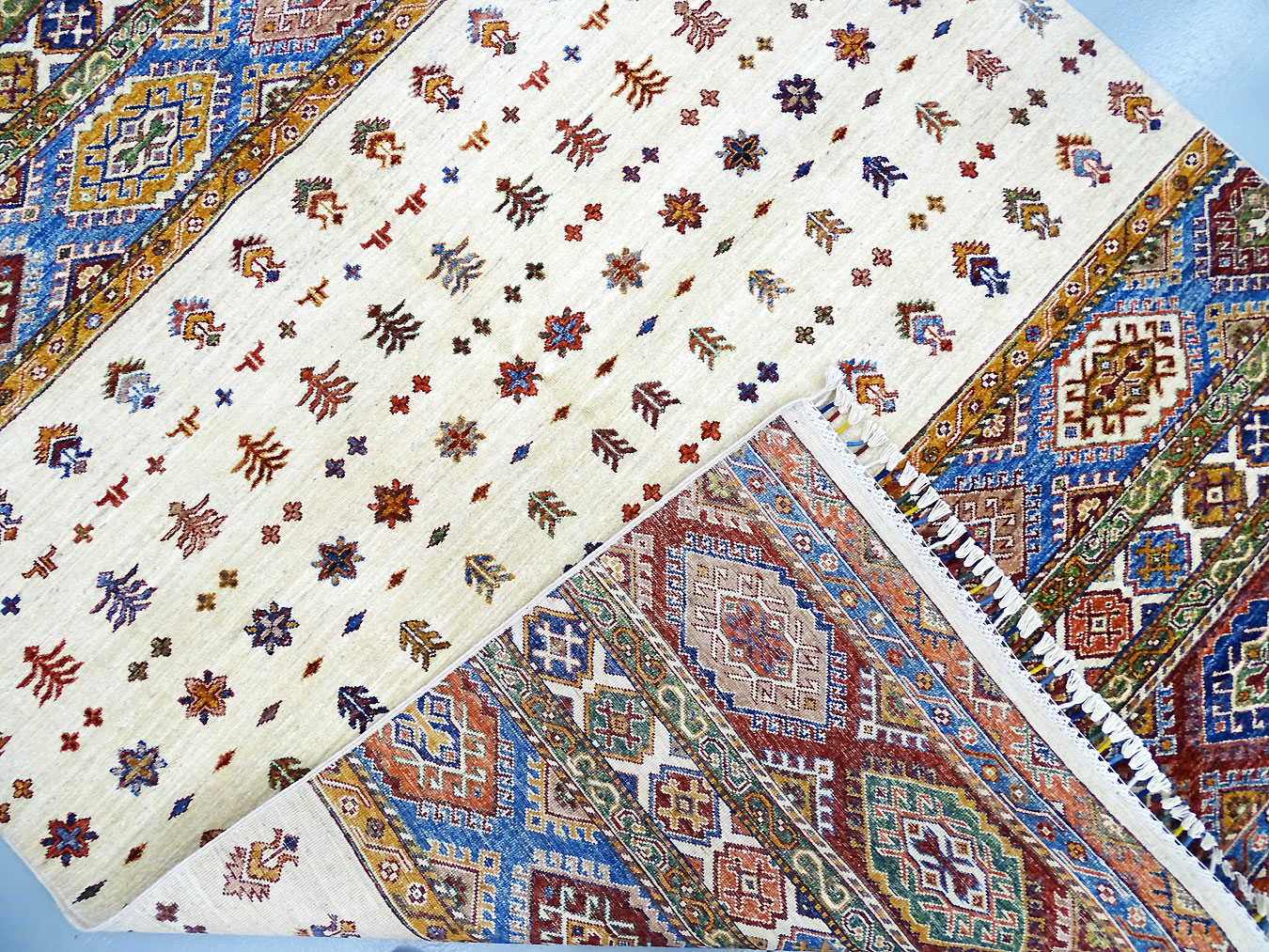 Dimensions : 242 x 171 cm -laine- Pays Afghanistan - Épaisseur : 8 mm - Densité de nouage : 300.000 Nœuds au m² - Surface : 4.14 m² - Poids : 12.41 Kgs - Age : contemporain - Confection : Noué main - Forme : Tapis de chambre - Type : Tapis de decoration