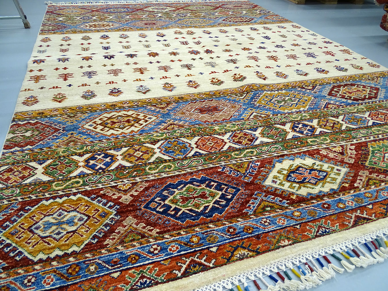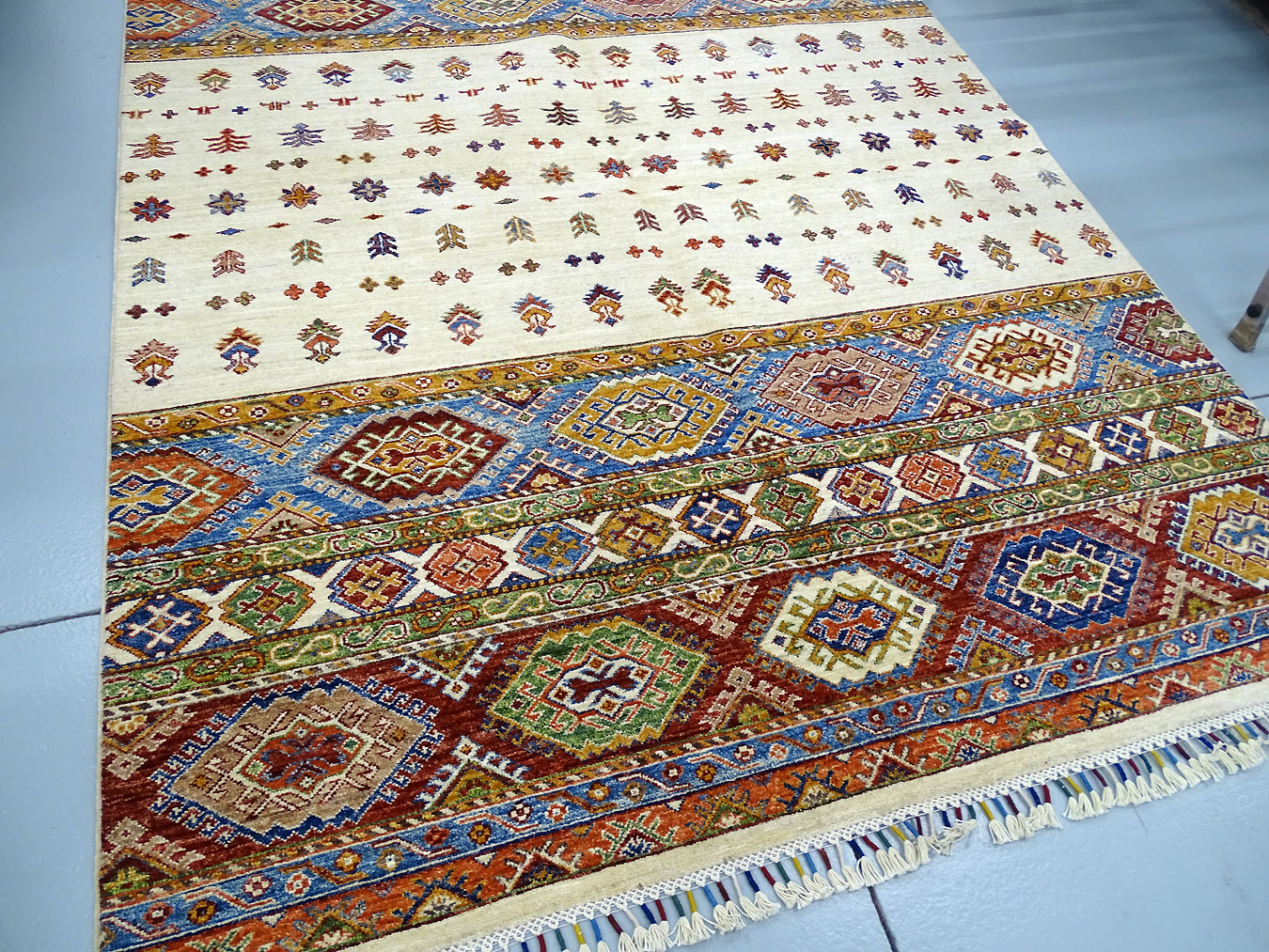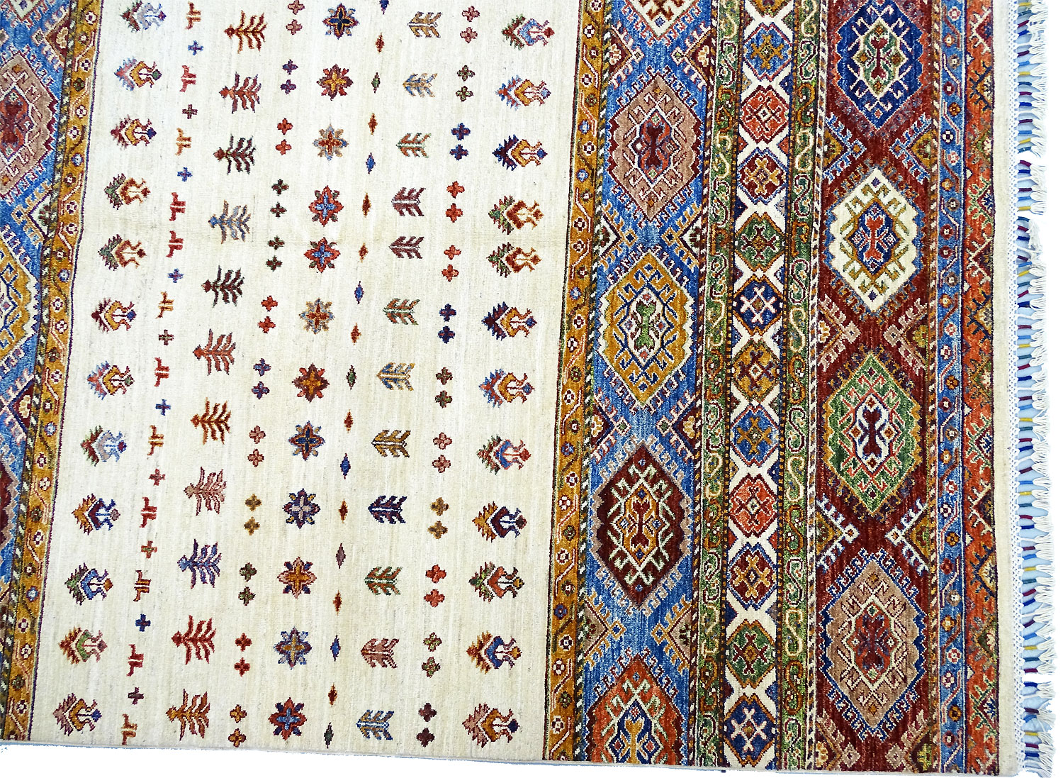 Dimensions : 245 x 172 cm -laine- Pays Afghanistan - Épaisseur : 8 mm - Densité de nouage : 300.000 Nœuds au m² - Surface : 4.21 m² - Poids : 12.64 Kgs - Age : contemporain - Confection : Noué main - Forme : Tapis de chambre - Type : Tapis de decoration