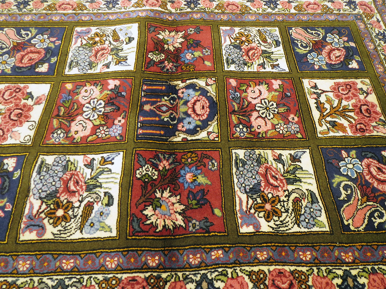 Dimensions : 147 x 105 cm -laine et soie- Pays Iran - Épaisseur : mm - Densité de nouage : Nœuds au m² - Surface : 0 m² - Poids : 0 Kgs - Age : - Confection : - Forme : - Type :