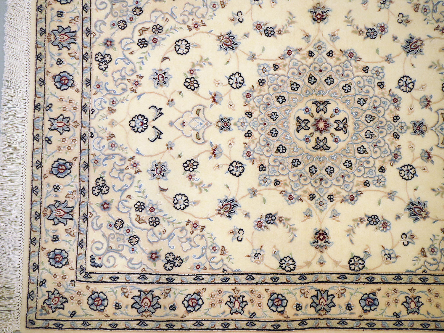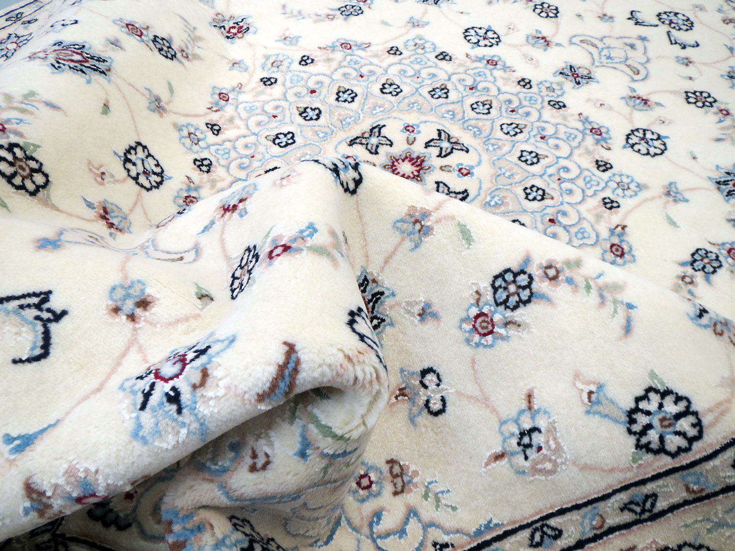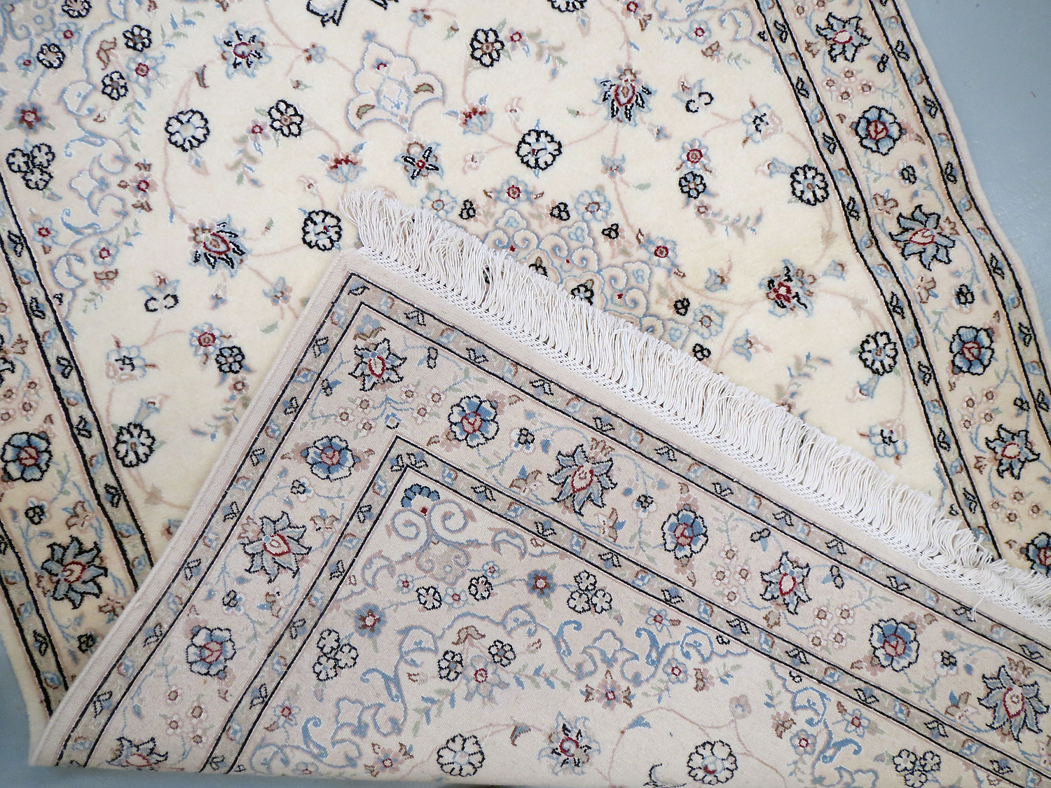 Dimensions : 145 x 96 cm -laine et soie- Pays Iran - Épaisseur : 9 mm - Densité de nouage : 360.000 Nœuds au m² - Surface : 1.39 m² - Poids : 3.48 Kgs - Age : contemporain - Confection : Noué main - Forme : Tapis de chambre - Type : Tapis persan