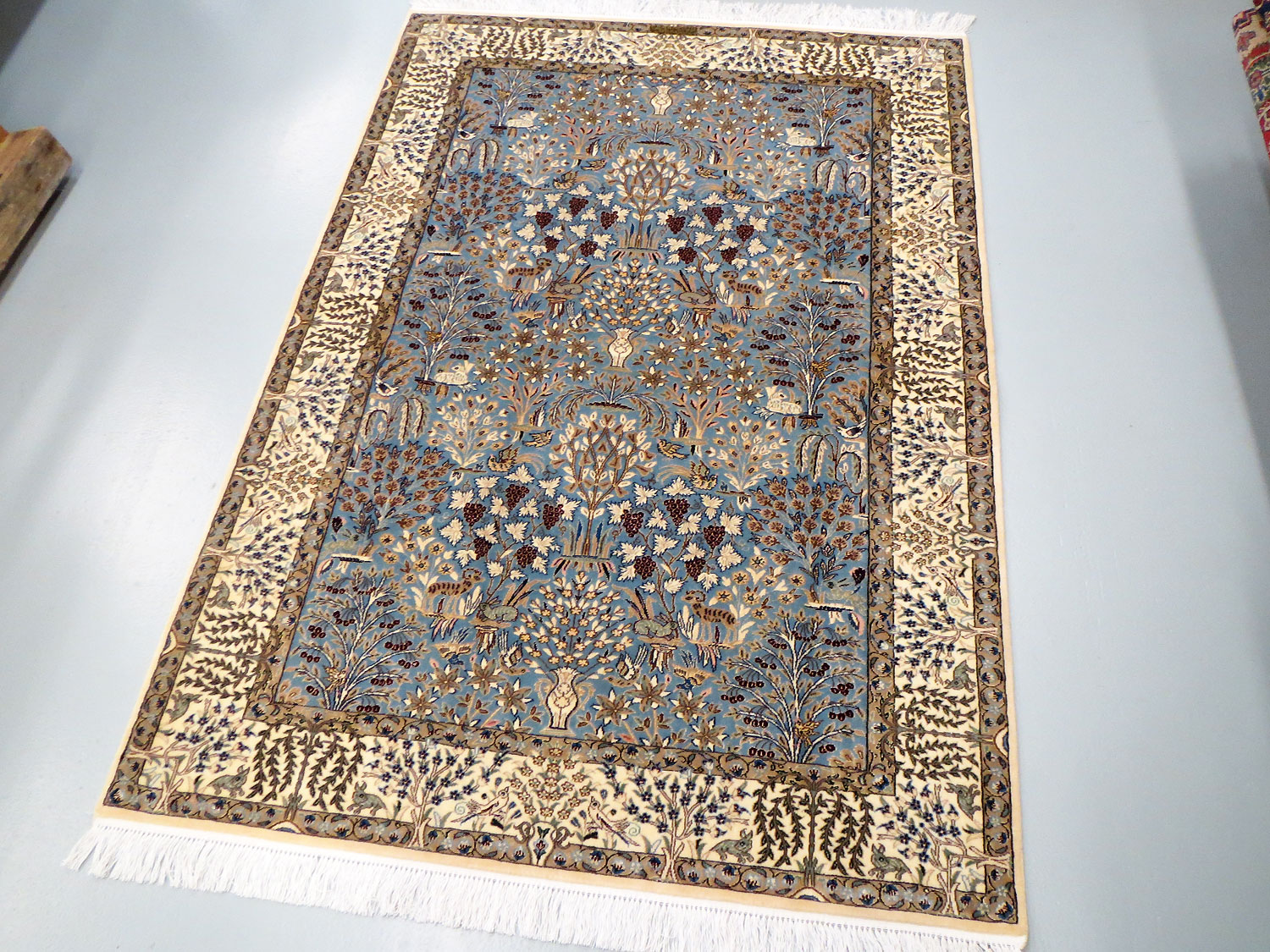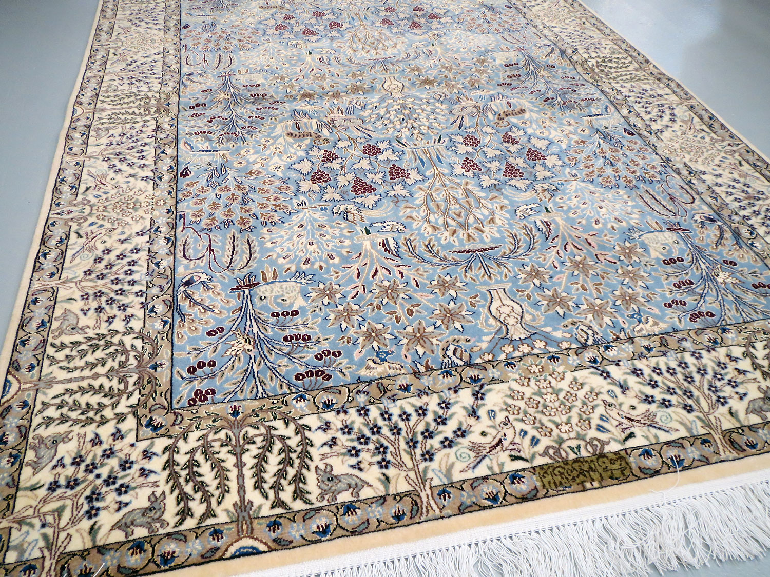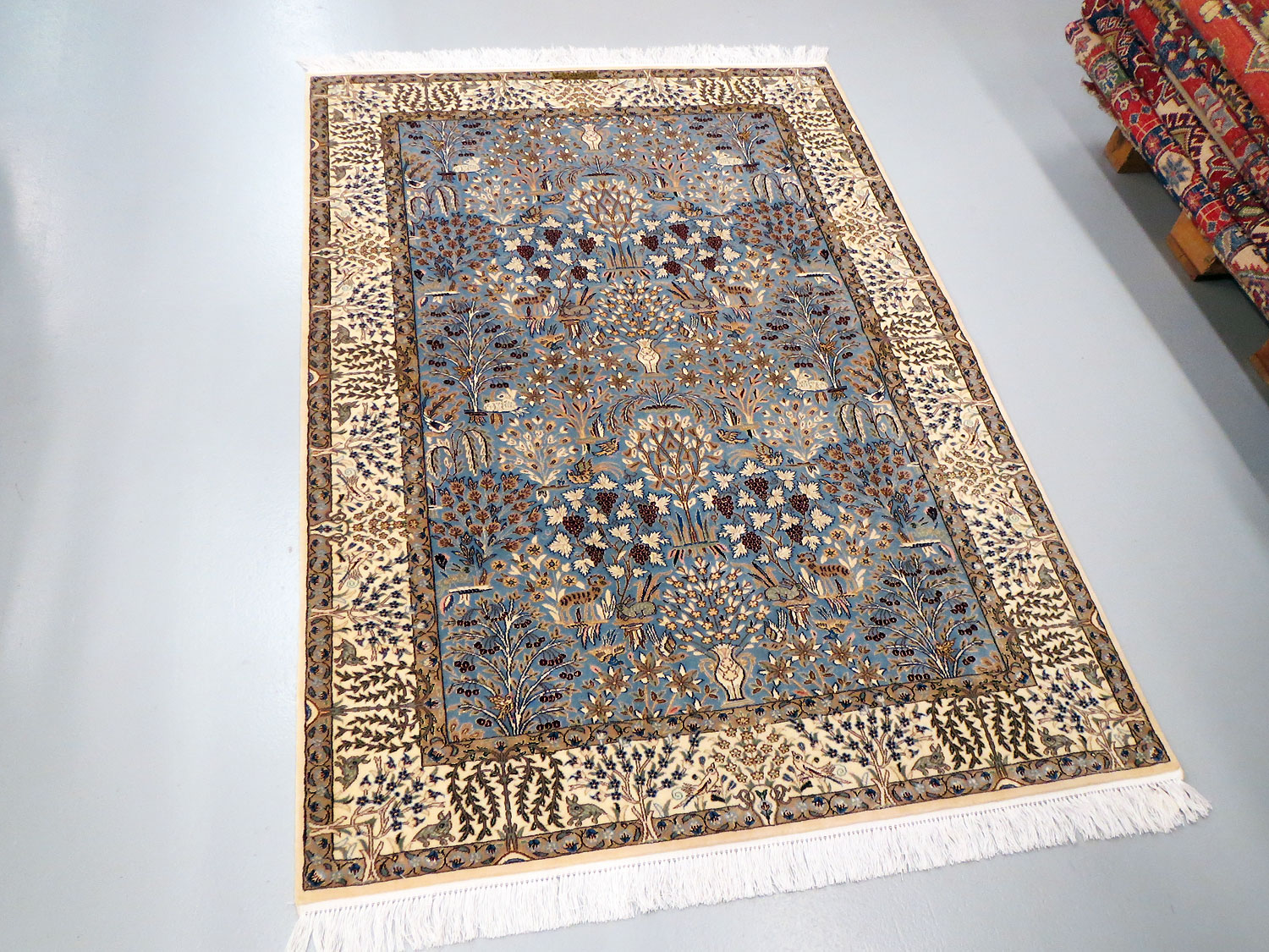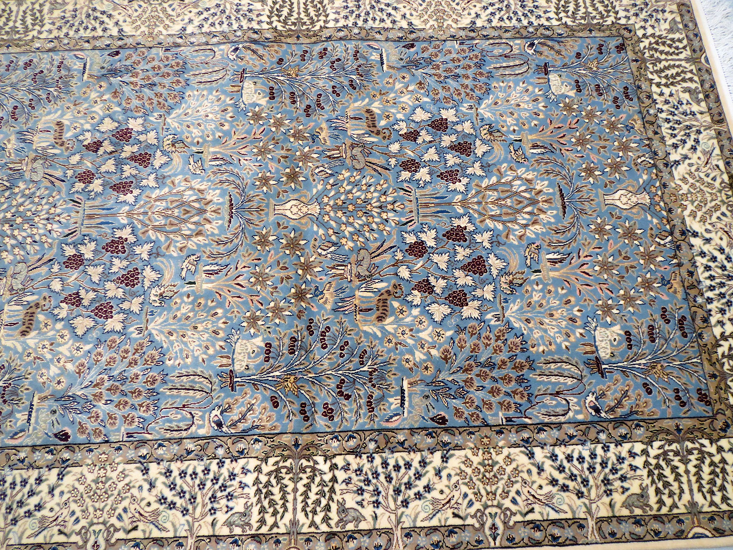 Dimensions : 167 x 112 cm -laine et soie- Pays Iran - Épaisseur : 7 mm - Densité de nouage : 800.000 Nœuds au m² - Surface : 1.87 m² - Poids : 4.68 Kgs - Age : contemporain - Confection : Noué main - Forme : Tapis de chambre - Type : Tapis persan
