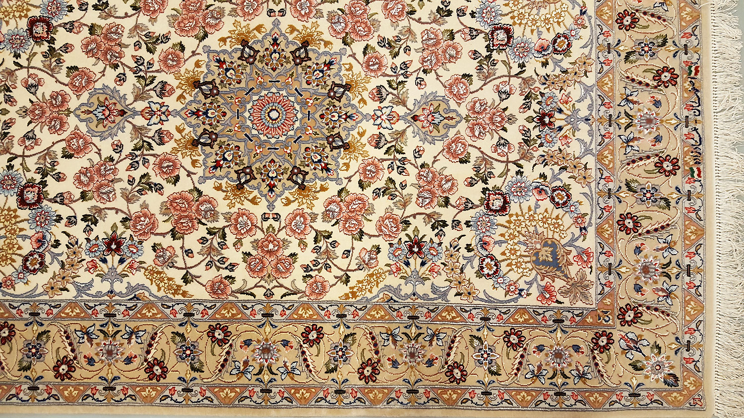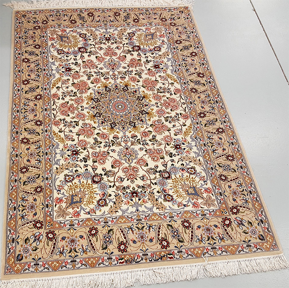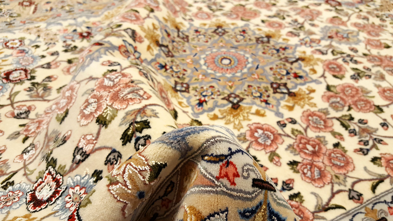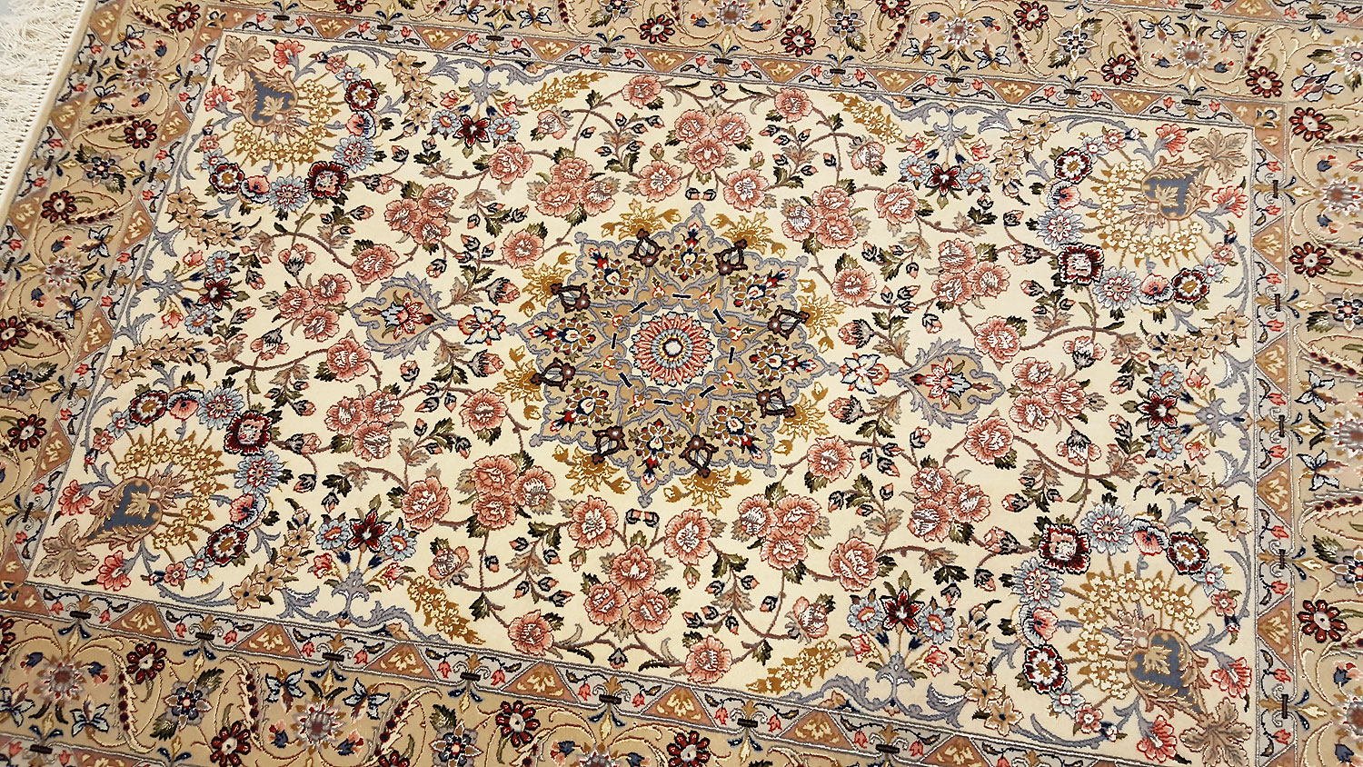 Dimensions : 164 x 115 cm -laine et soie- Pays Iran - Épaisseur : 7 mm - Densité de nouage : 800.000 Nœuds au m² - Surface : 1.89 m² - Poids : 4.72 Kgs - Age : contemporain - Confection : Noué main - Forme : Tapis de chambre - Type : Tapis persan