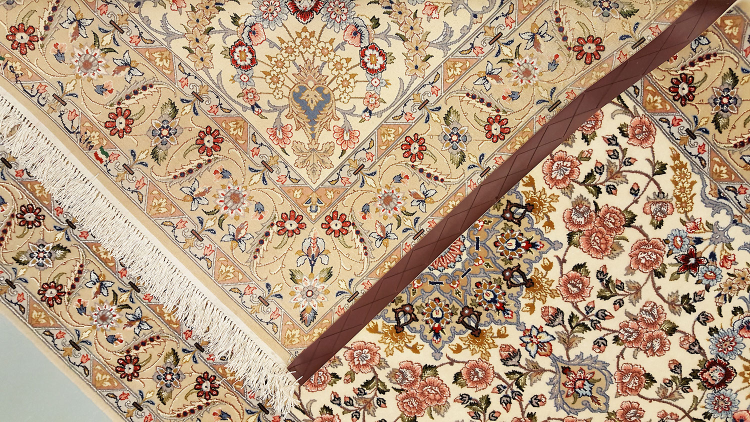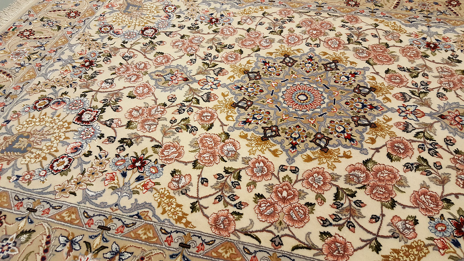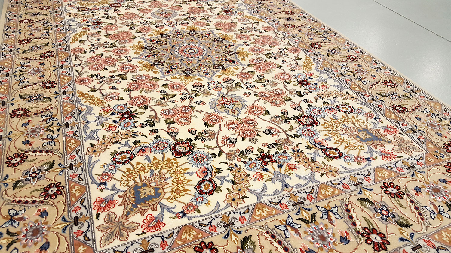 Dimensions : 164 x 115 cm -laine et soie- Pays Iran - Épaisseur : 7 mm - Densité de nouage : 800.000 Nœuds au m² - Surface : 1.89 m² - Poids : 4.72 Kgs - Age : contemporain - Confection : Noué main - Forme : Tapis de chambre - Type : Tapis persan