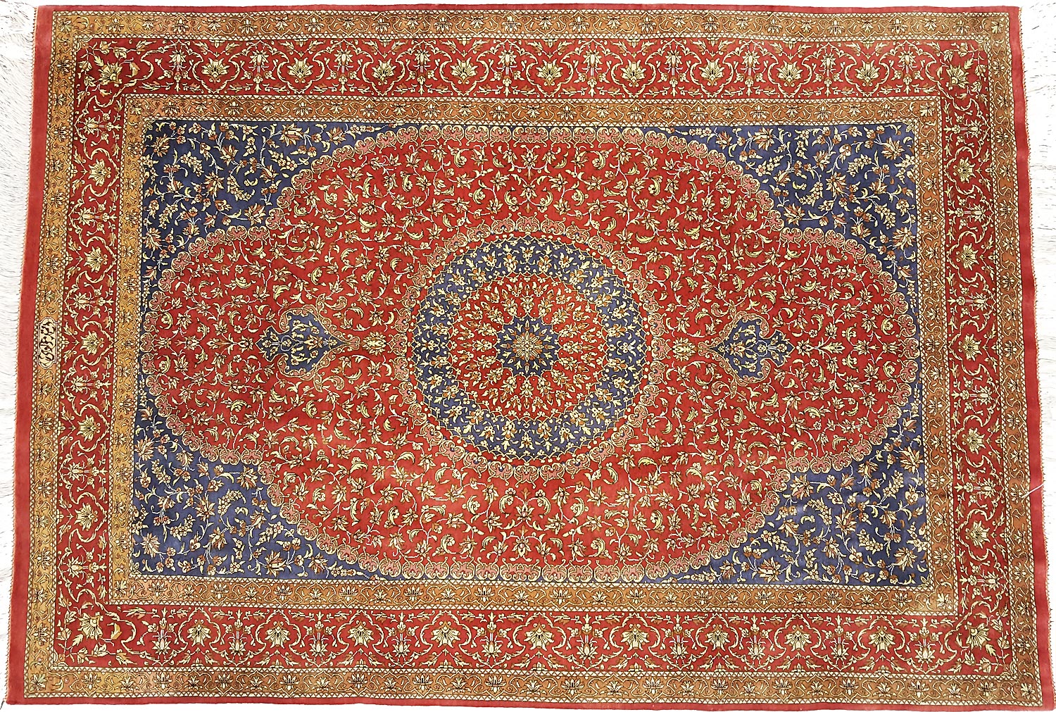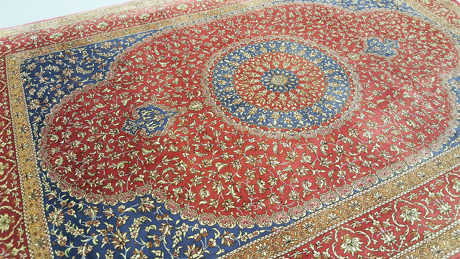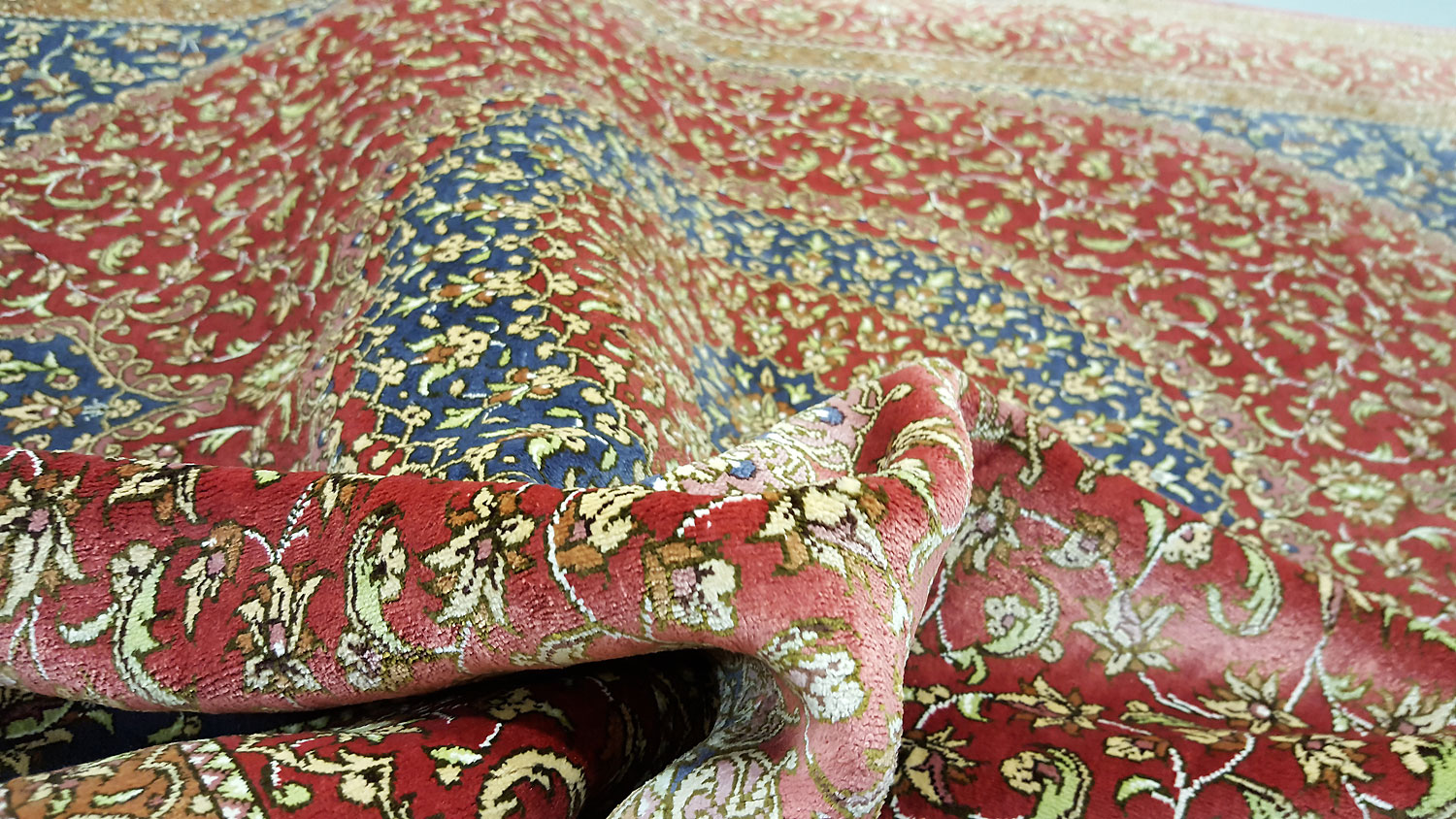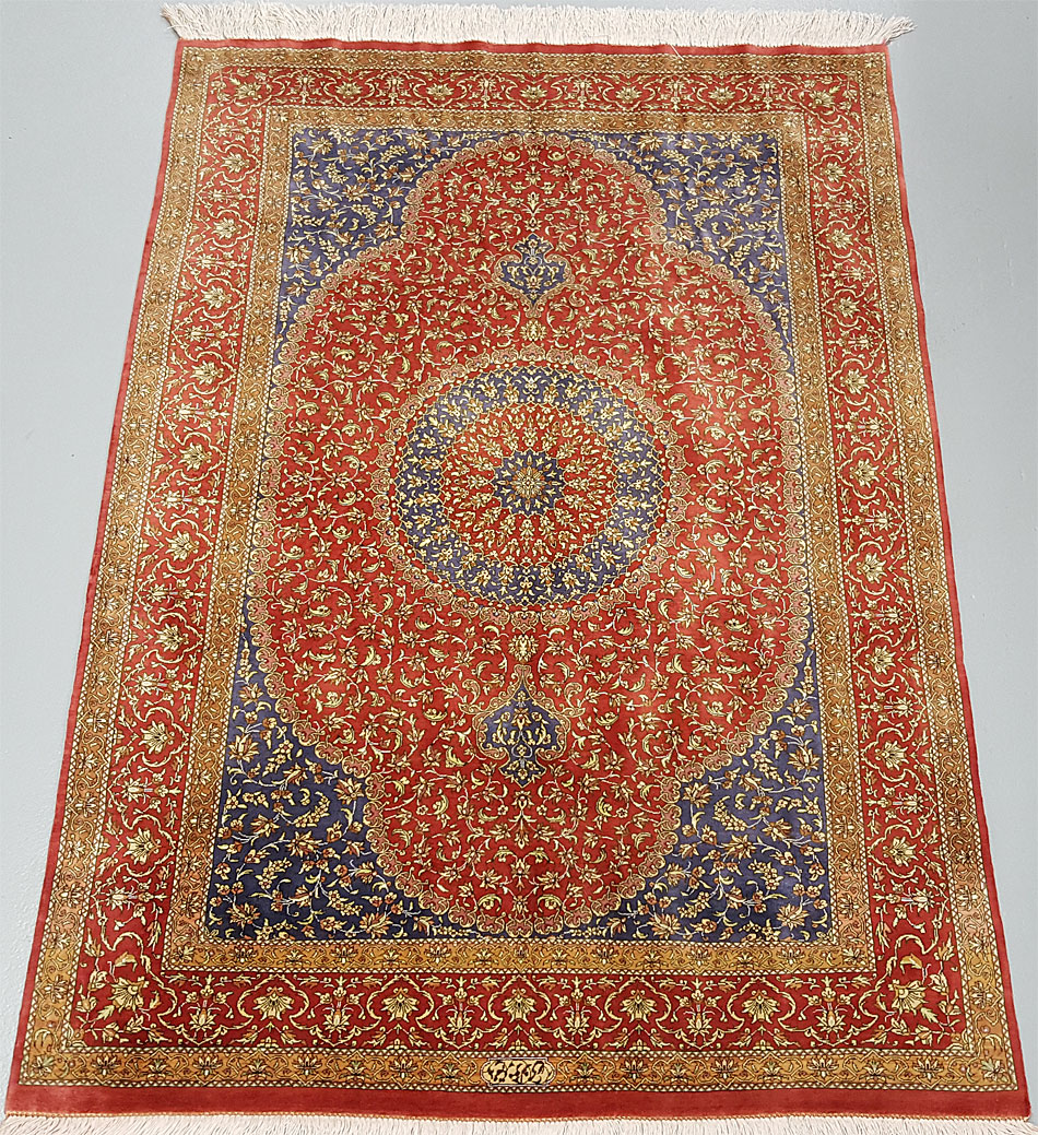 Dimensions : 150 x 100 cm -soie- Pays Iran - Épaisseur : 3 mm - Densité de nouage : 1.000.000 Nœuds au m² - Surface : 1.5 m² - Poids : 3 Kgs - Age : contemporain - Confection : Noué main - Forme : Tapis de chambre - Type : Tapis persan