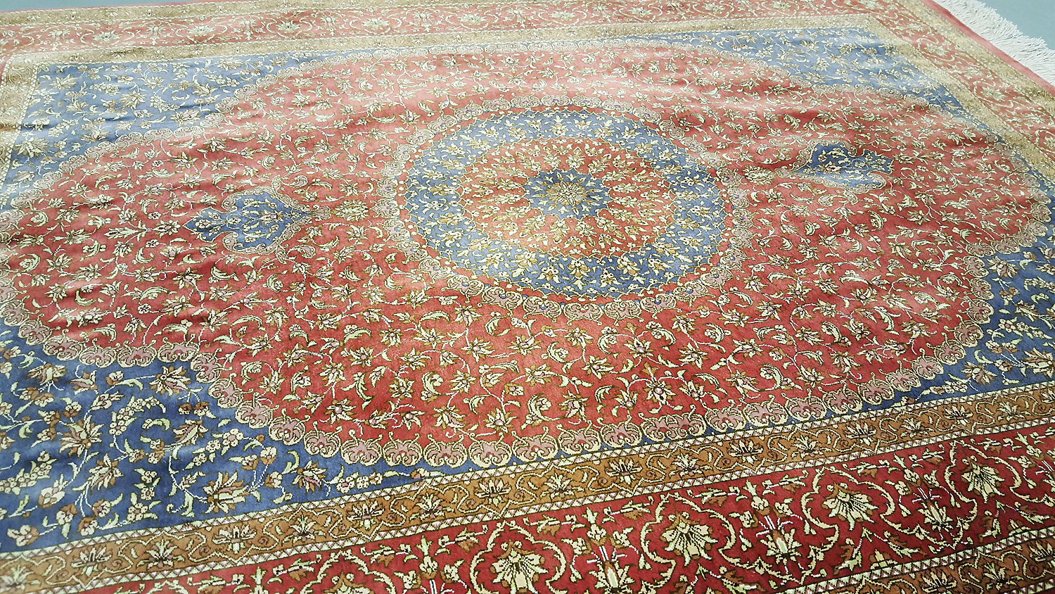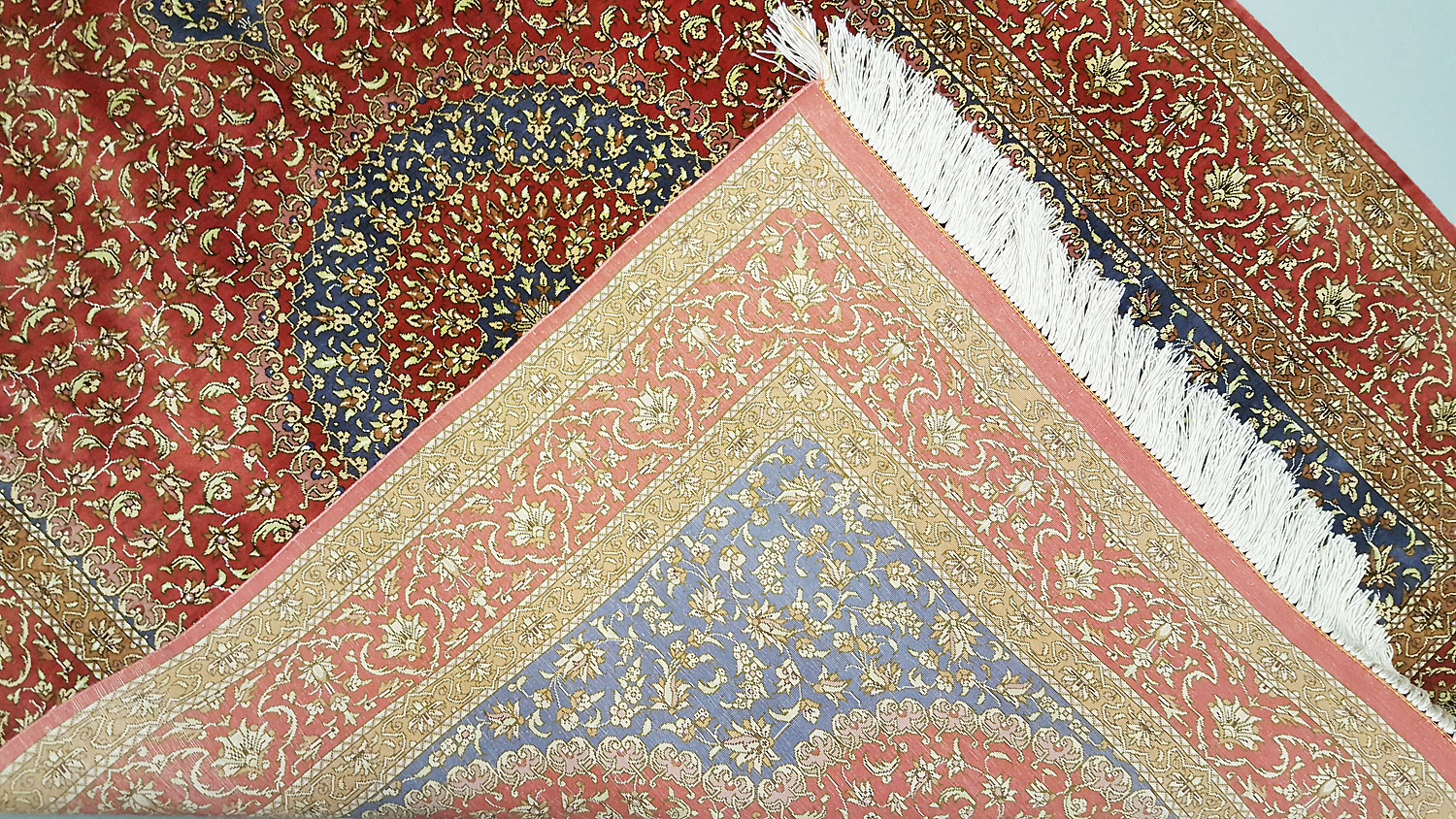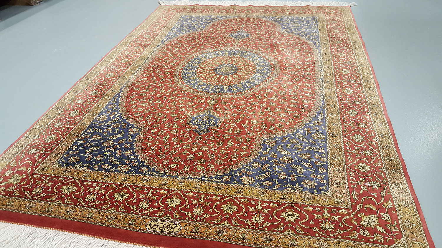 Dimensions : 150 x 100 cm -soie- Pays Iran - Épaisseur : 3 mm - Densité de nouage : 1.000.000 Nœuds au m² - Surface : 1.5 m² - Poids : 3 Kgs - Age : contemporain - Confection : Noué main - Forme : Tapis de chambre - Type : Tapis persan