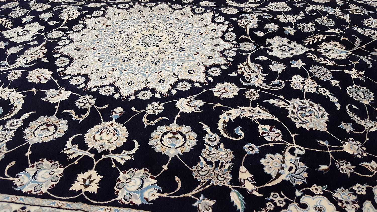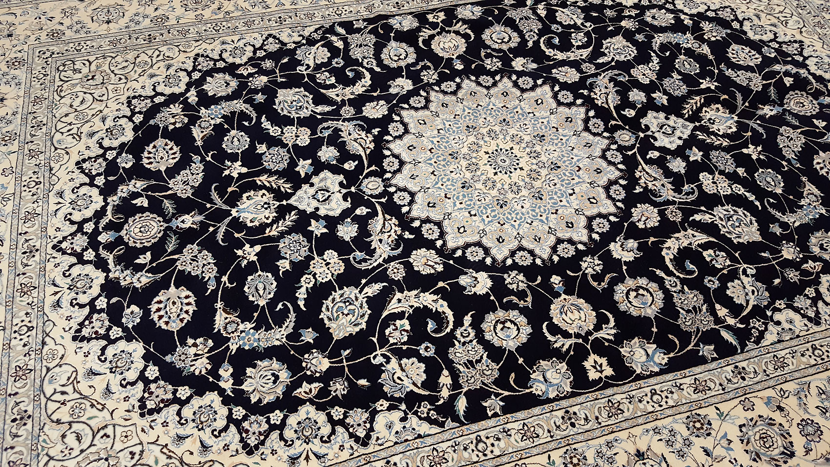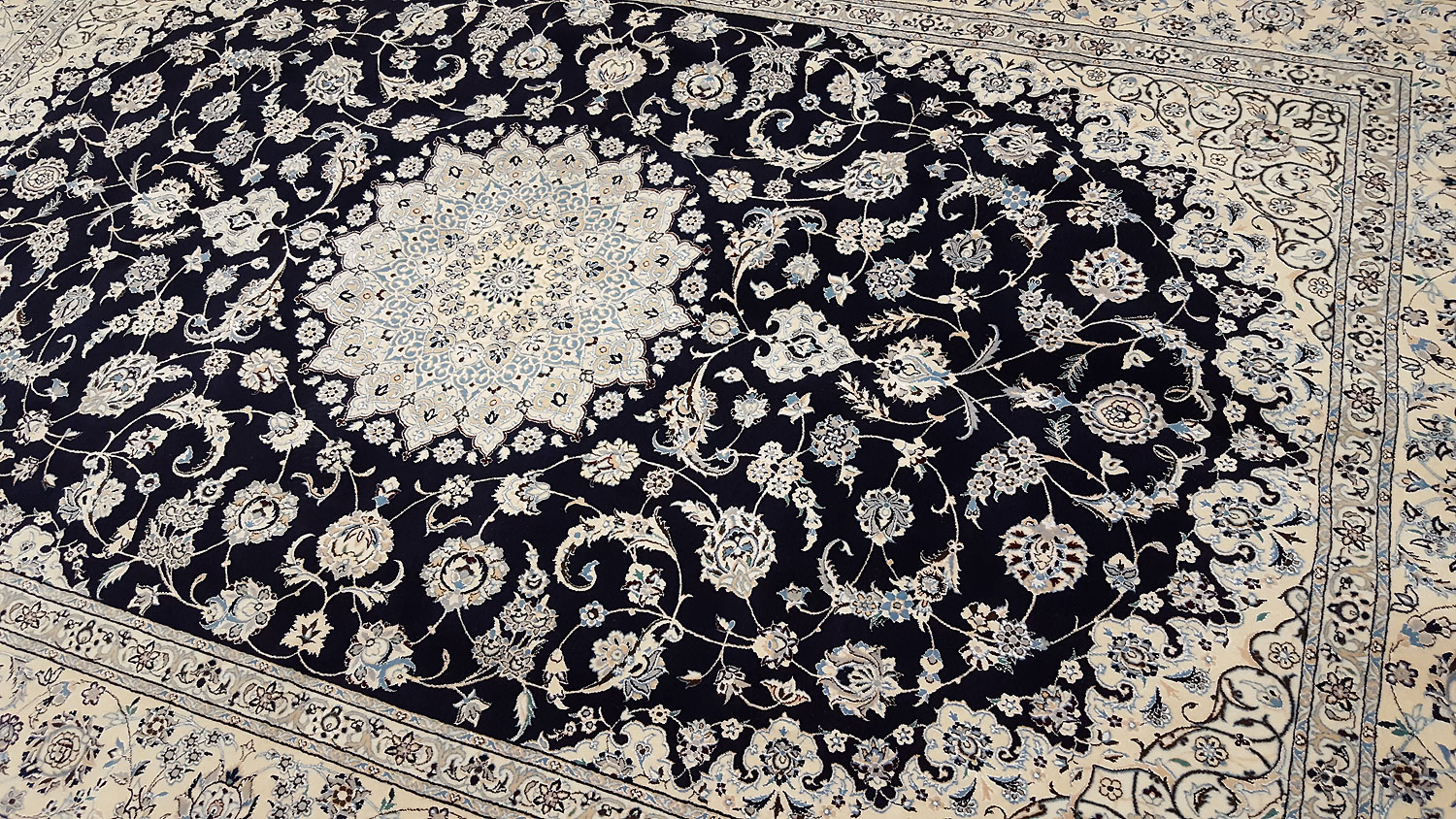 Dimensions : 298 x 207 cm -laine et soie- Pays Iran - Épaisseur : 8 mm - Densité de nouage : 800.000 Nœuds au m² - Surface : 6.17 m² - Poids : 15.42 Kgs - Age : contemporain - Confection : Noué main - Forme : Tapis de salon - Type : Tapis persan