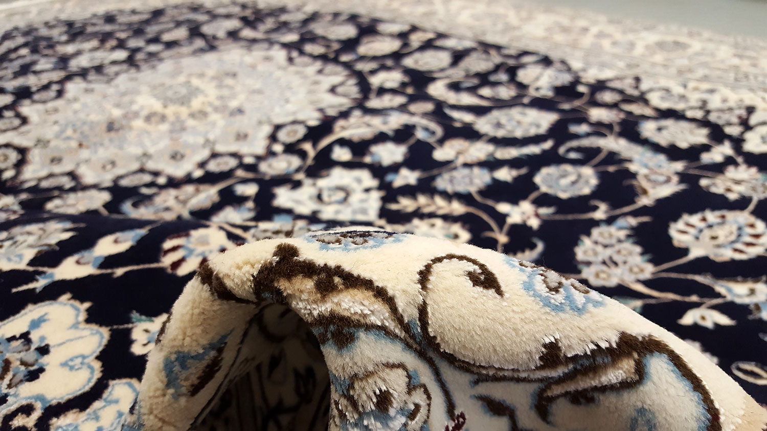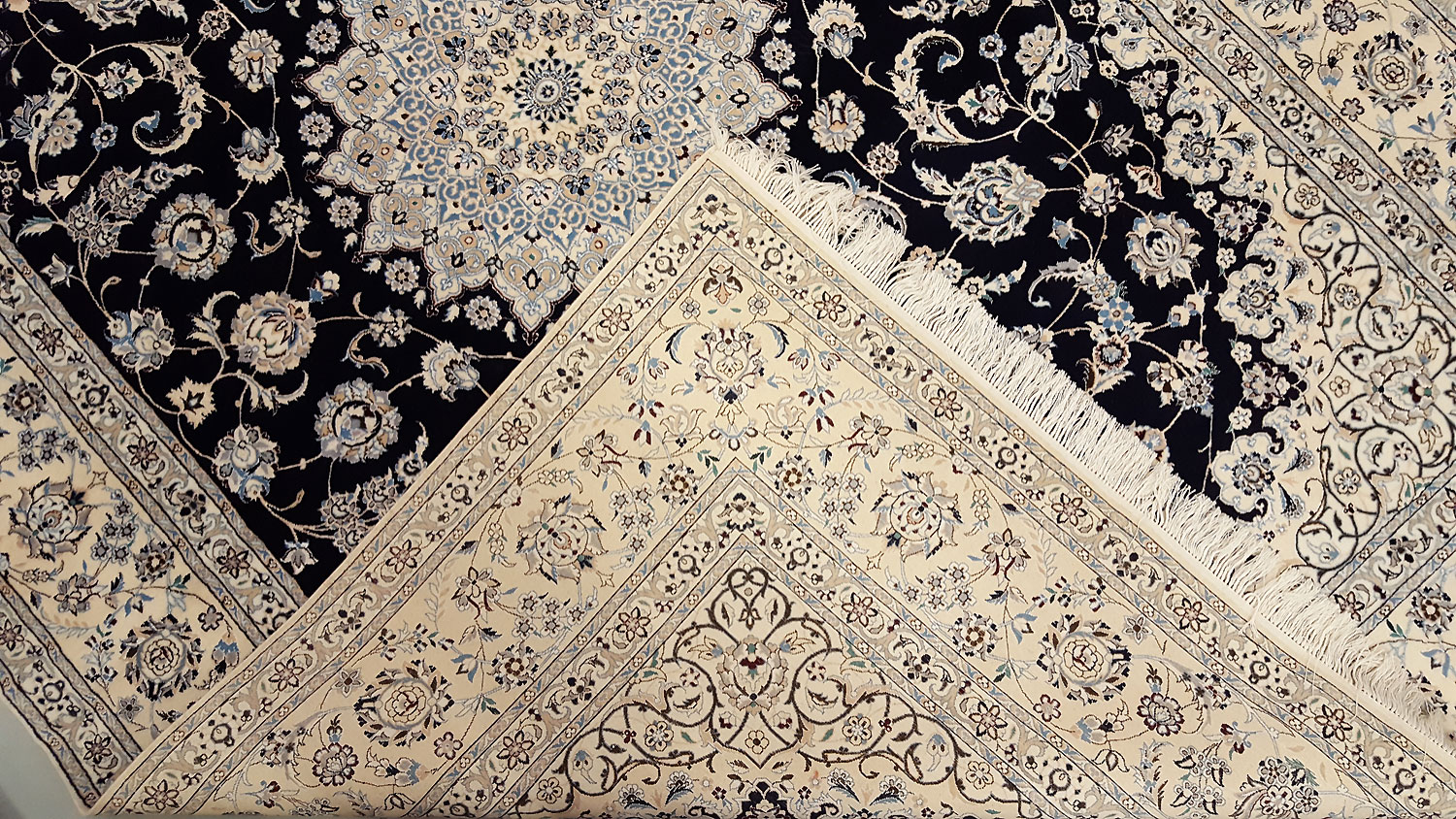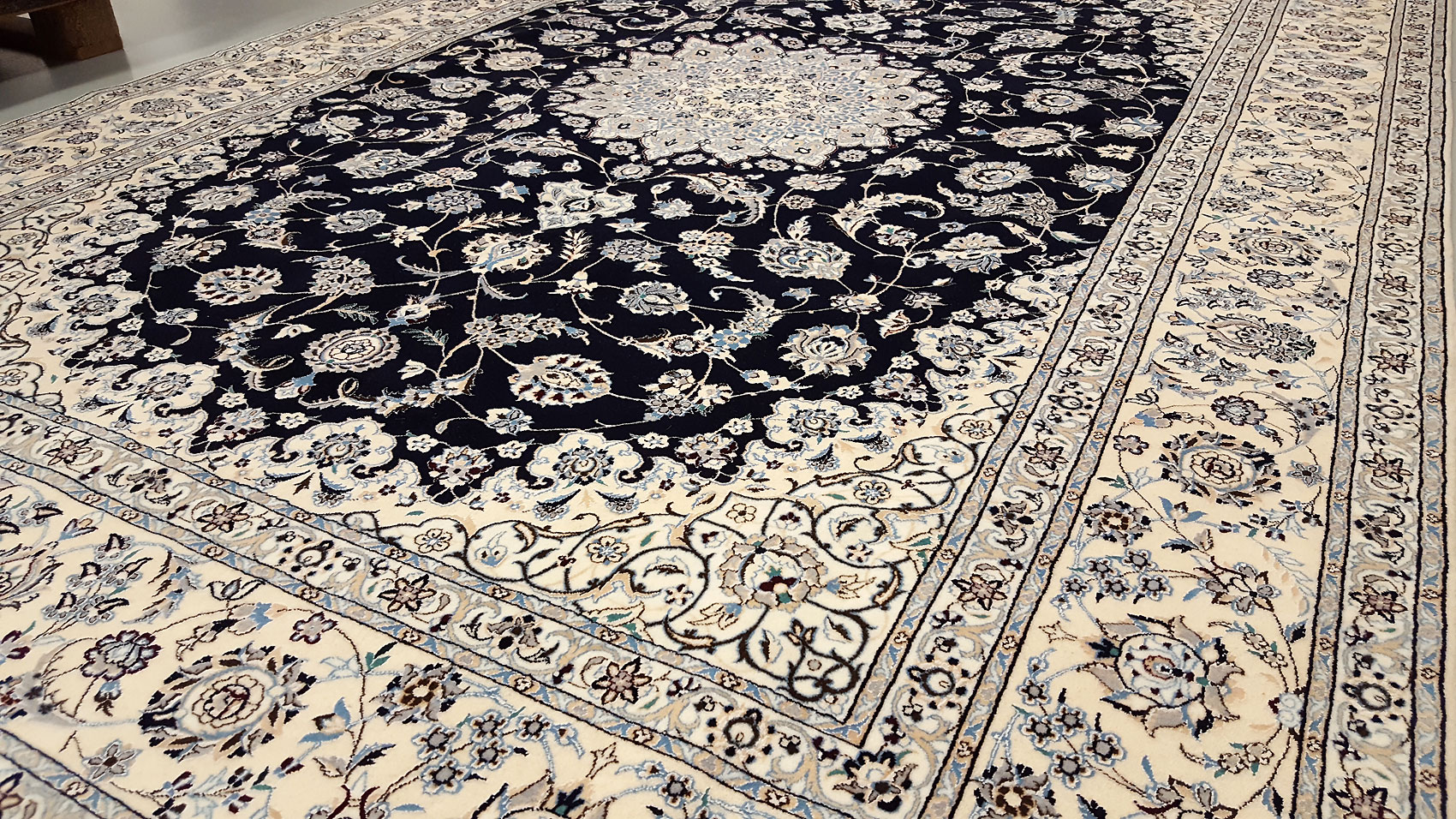 Dimensions : 298 x 207 cm -laine et soie- Pays Iran - Épaisseur : 8 mm - Densité de nouage : 800.000 Nœuds au m² - Surface : 6.17 m² - Poids : 15.42 Kgs - Age : contemporain - Confection : Noué main - Forme : Tapis de salon - Type : Tapis persan