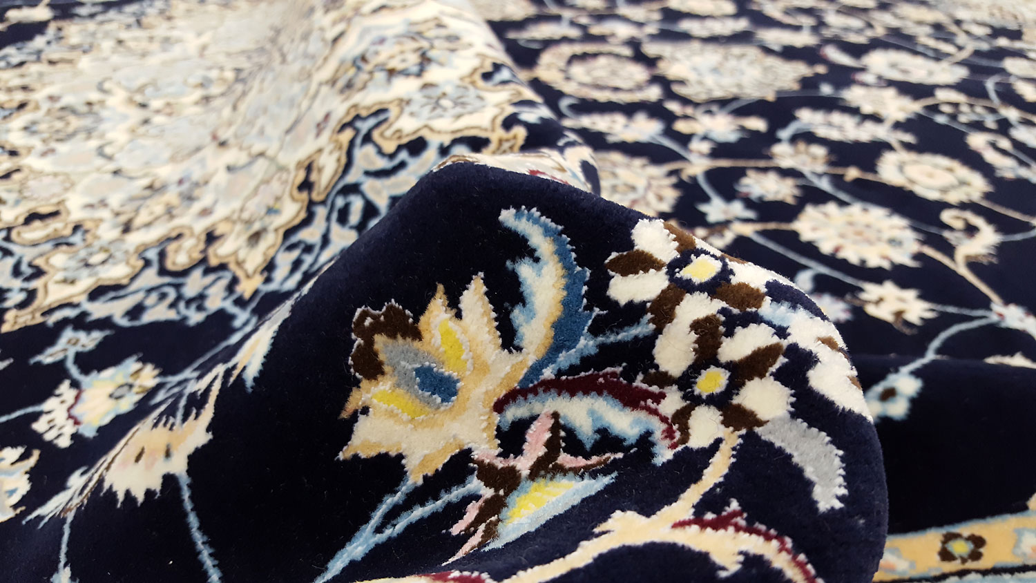 Dimensions : 305 x 204 cm -laine et soie- Pays Iran - Épaisseur : 8 mm - Densité de nouage : 800.000 Nœuds au m² - Surface : 6.22 m² - Poids : 15.56 Kgs - Age : contemporain - Confection : Noué main - Forme : Tapis de salon - Type : Tapis persan