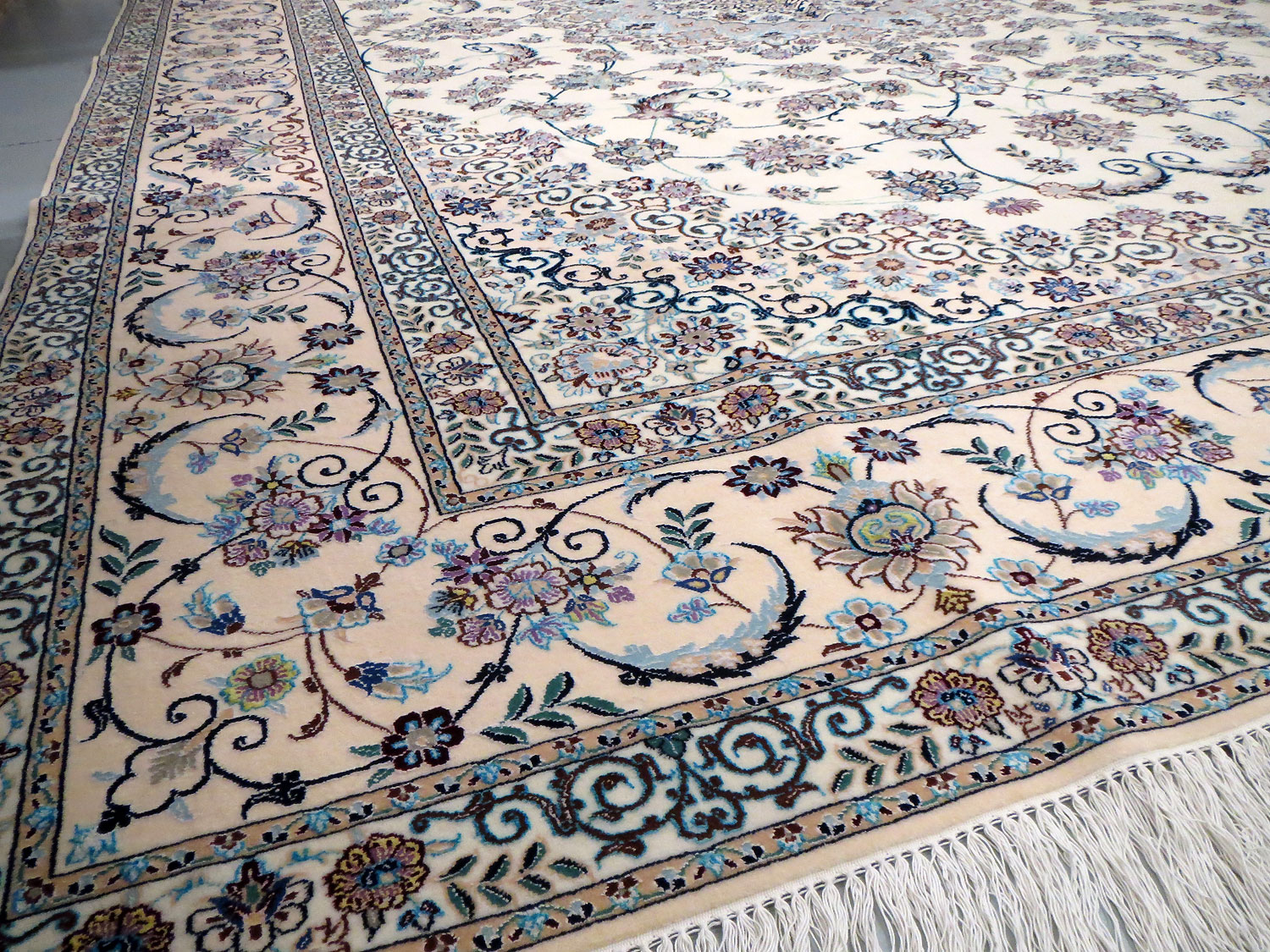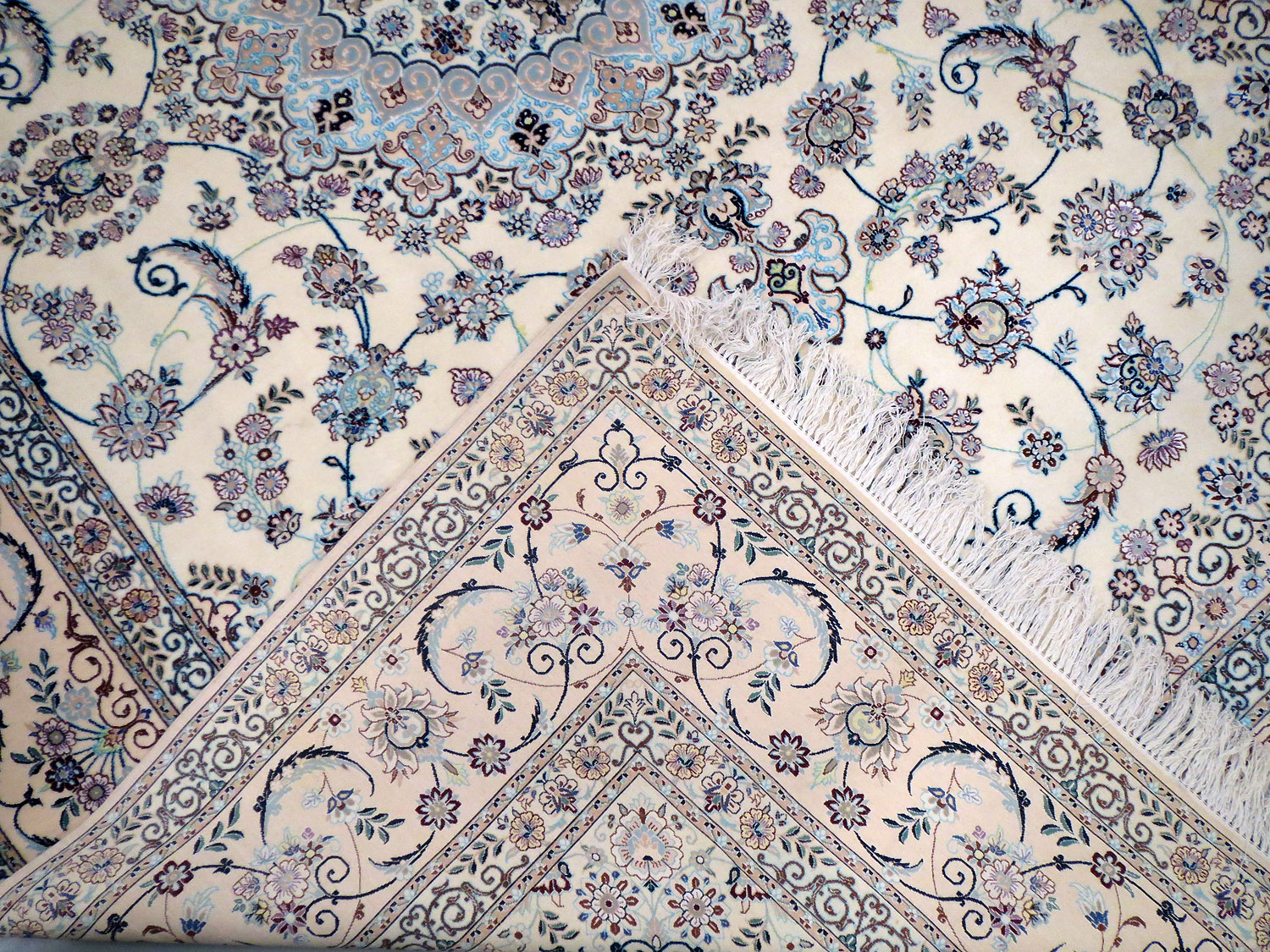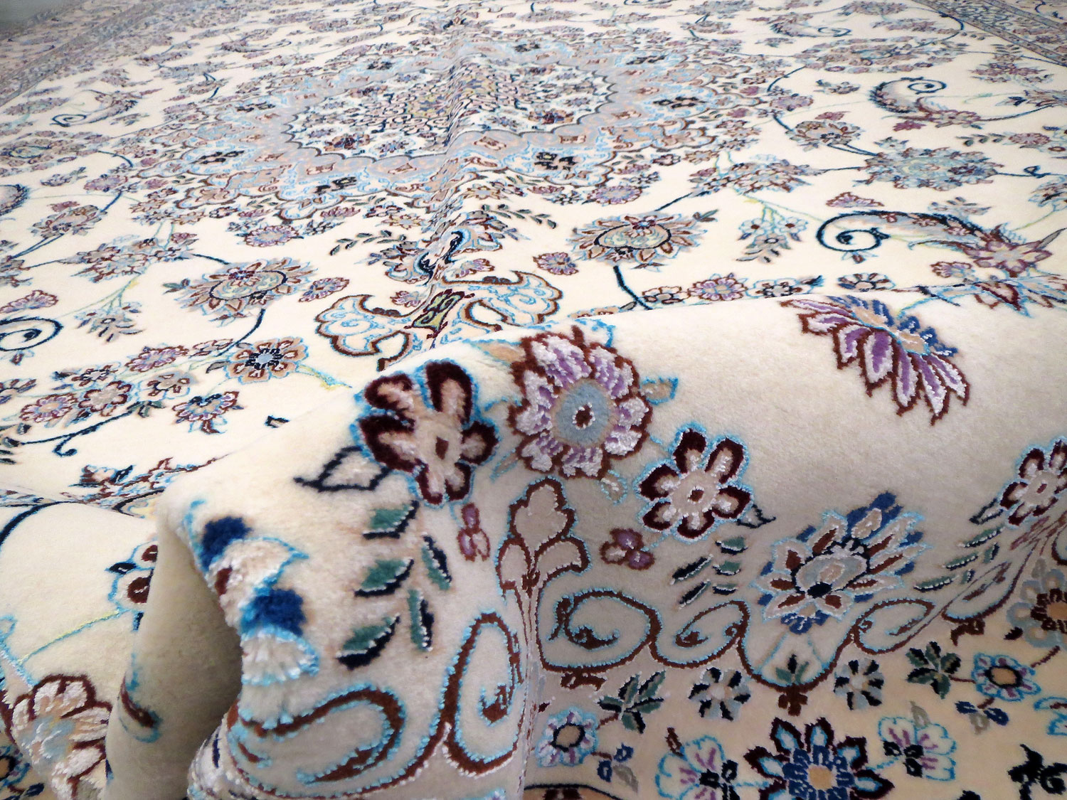 Dimensions : 355 x 260 cm -laine et soie- Pays Iran - Épaisseur : 8 mm - Densité de nouage : 800.000 Nœuds au m² - Surface : 9.23 m² - Poids : 23.08 Kgs - Age : contemporain - Confection : Noué main - Forme : Tapis de salon - Type : Tapis persan