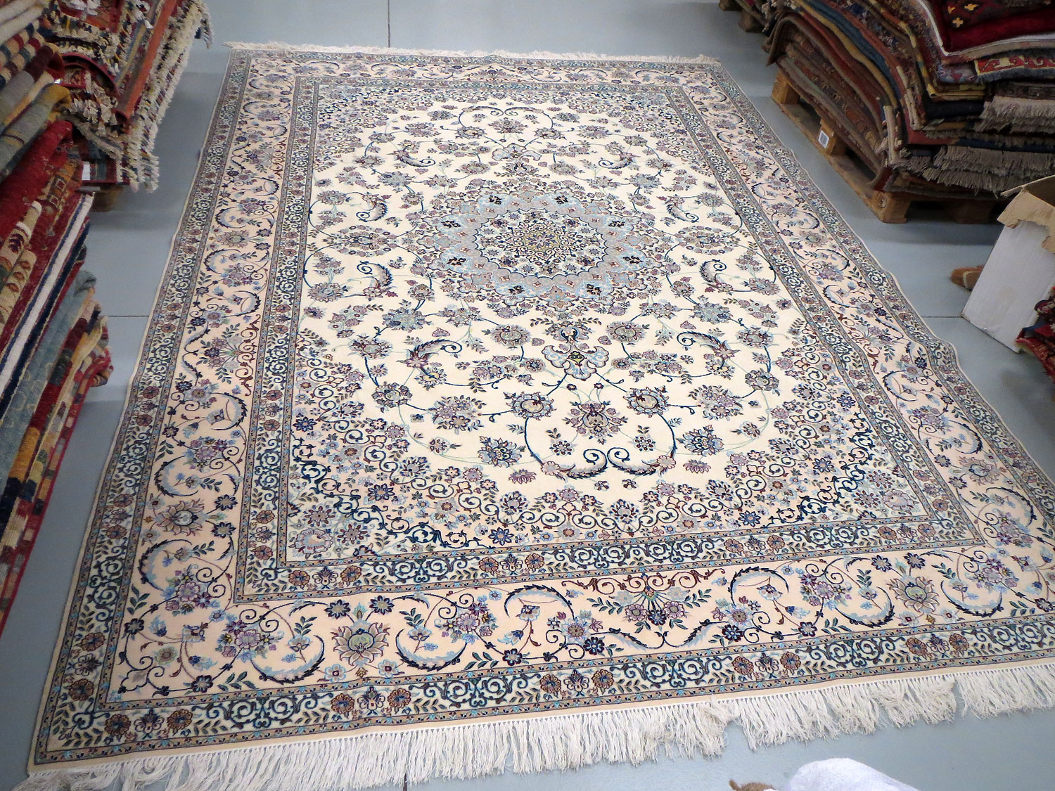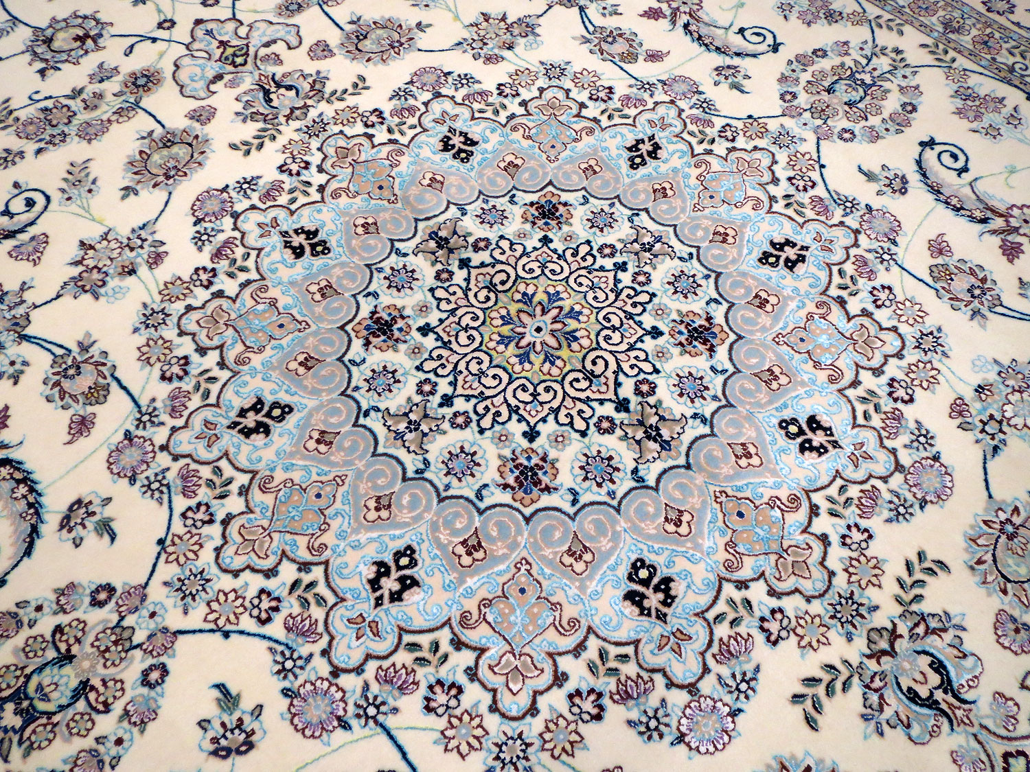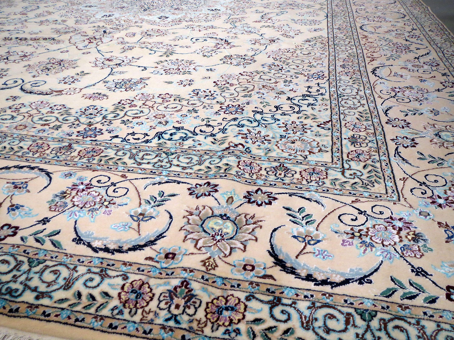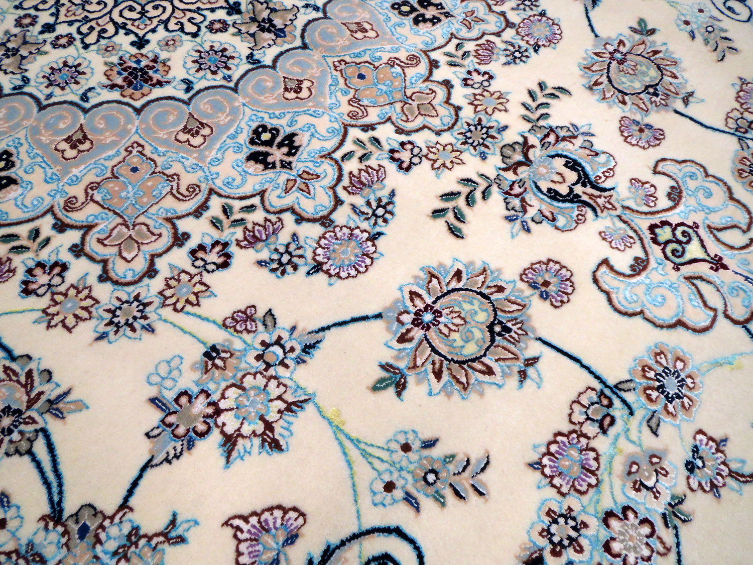 Dimensions : 355 x 260 cm -laine et soie- Pays Iran - Épaisseur : 8 mm - Densité de nouage : 800.000 Nœuds au m² - Surface : 9.23 m² - Poids : 23.08 Kgs - Age : contemporain - Confection : Noué main - Forme : Tapis de salon - Type : Tapis persan