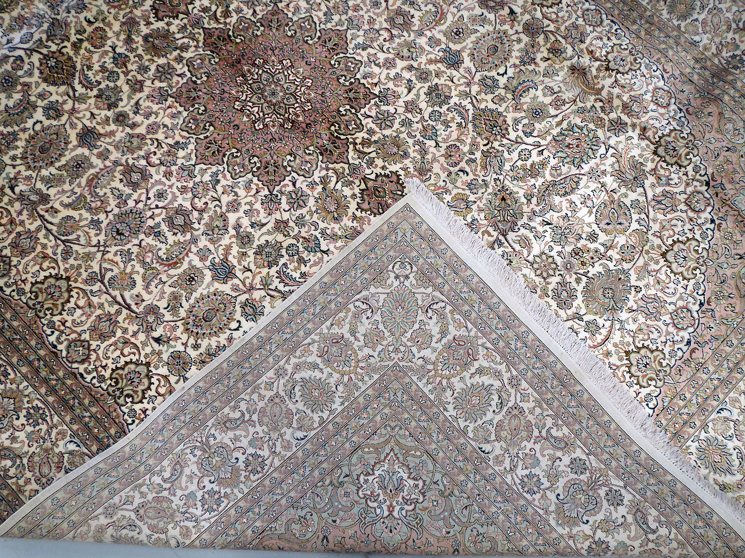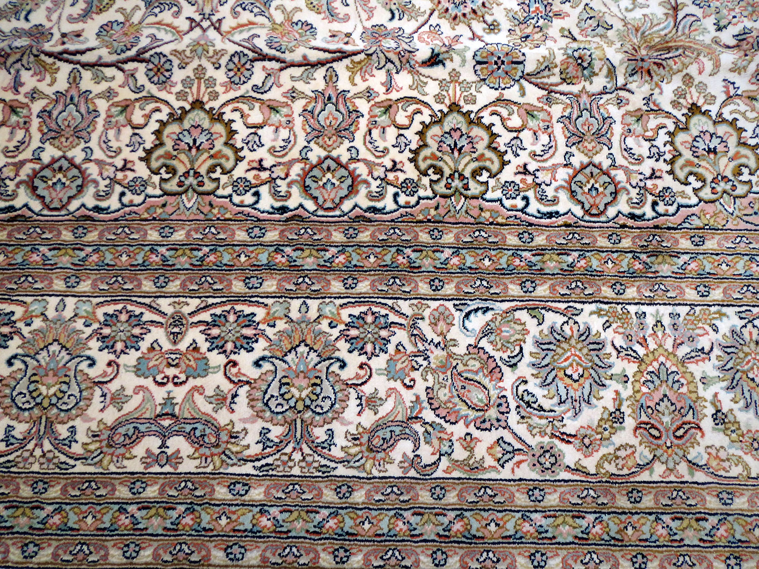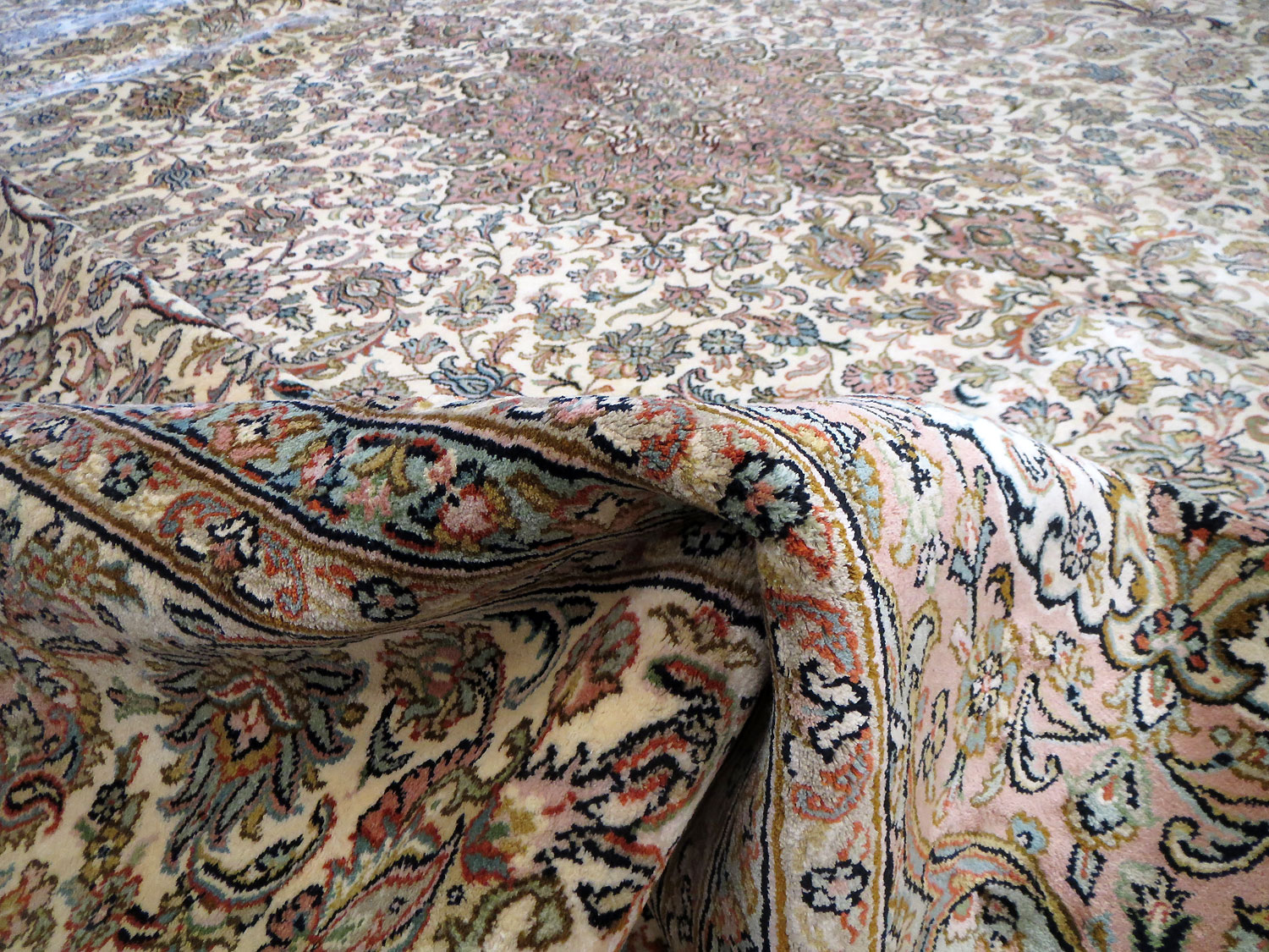 Dimensions : 339 x 250 cm -soie- Pays Inde - Épaisseur : 6 mm - Densité de nouage : 500.000 Nœuds au m² - Surface : 8.48 m² - Poids : 16.95 Kgs - Age : contemporain - Confection : Noué main - Forme : Tapis de salon - Type : Tapis Oriental
