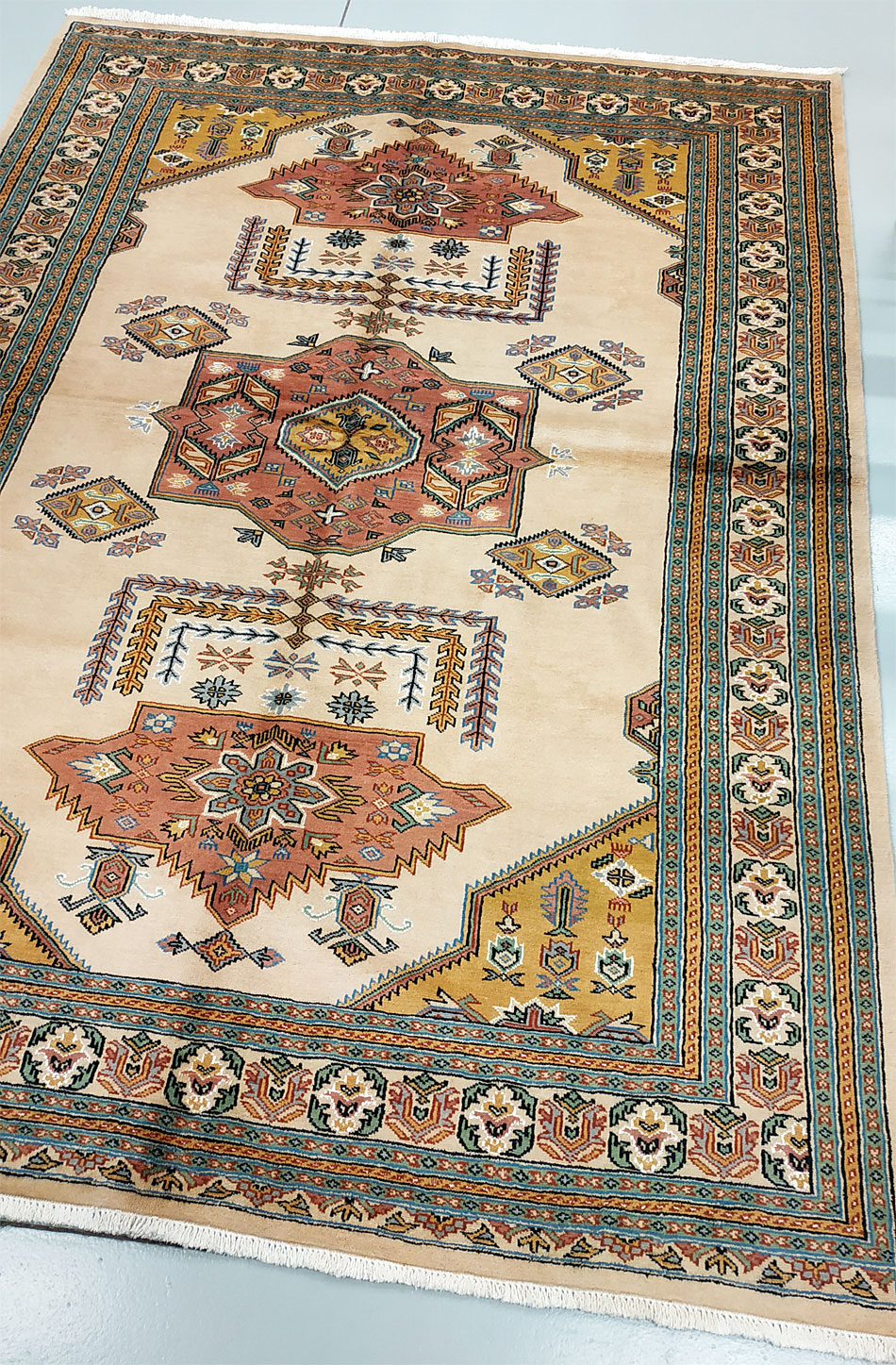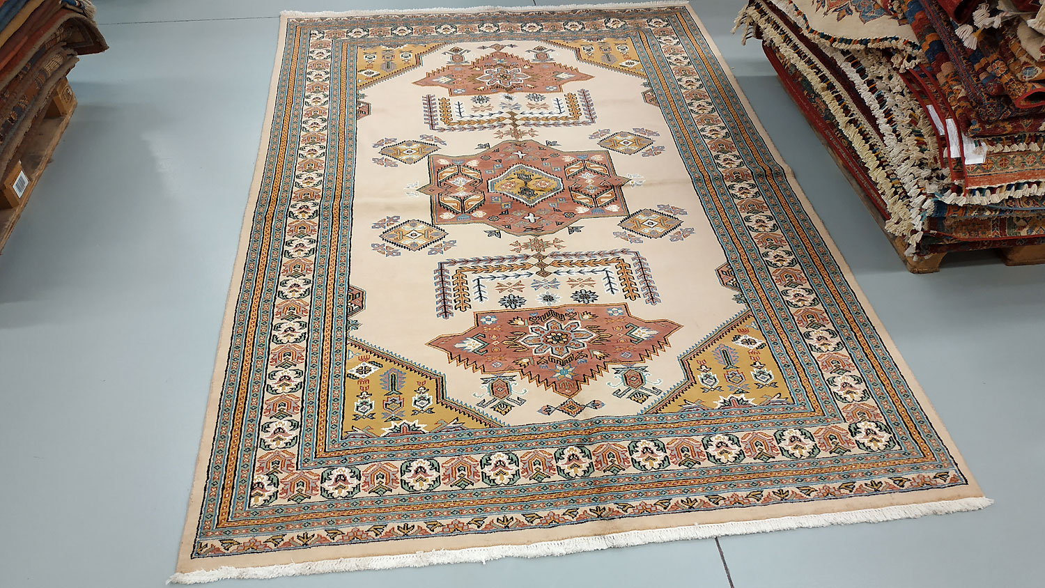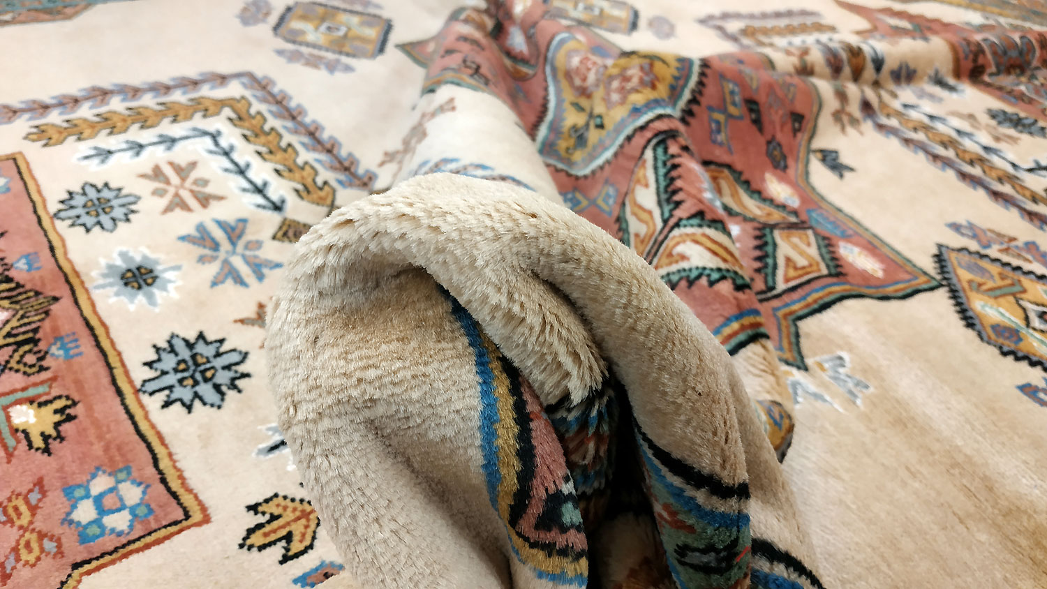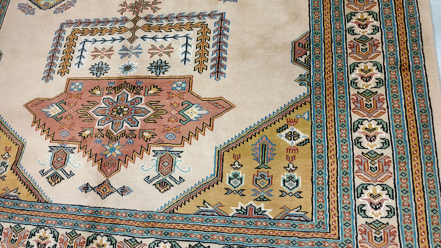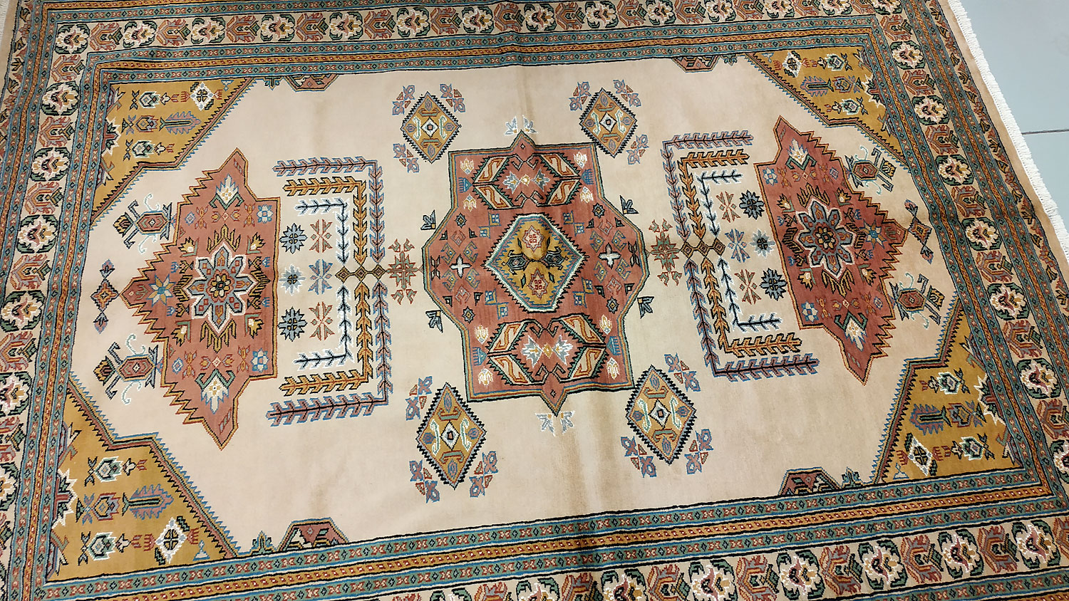 Dimensions : 273 x 192 cm -laine et soie- Pays Pakistan - Épaisseur : 7 mm - Densité de nouage : 250.000 Nœuds au m² - Surface : 5.24 m² - Poids : 10.48 Kgs - Age : contemporain - Confection : Noué main - Forme : Tapis de salon - Type : Tapis Oriental