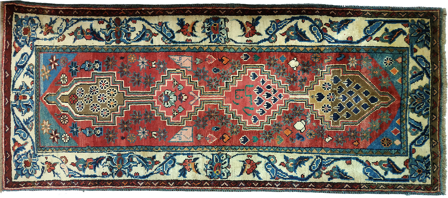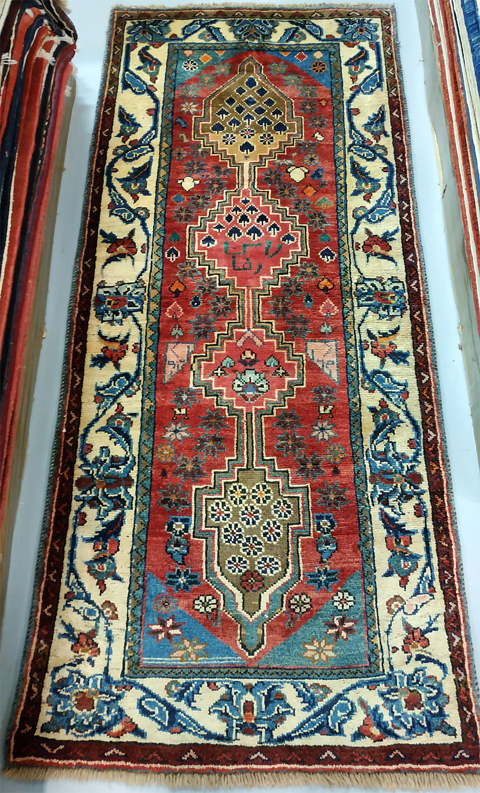 Dimensions : 182 x 82 cm -laine- Pays Iran - Épaisseur : mm - Densité de nouage : Nœuds au m² - Surface : 0 m² - Poids : 0 Kgs - Age : - Confection : - Forme : - Type :