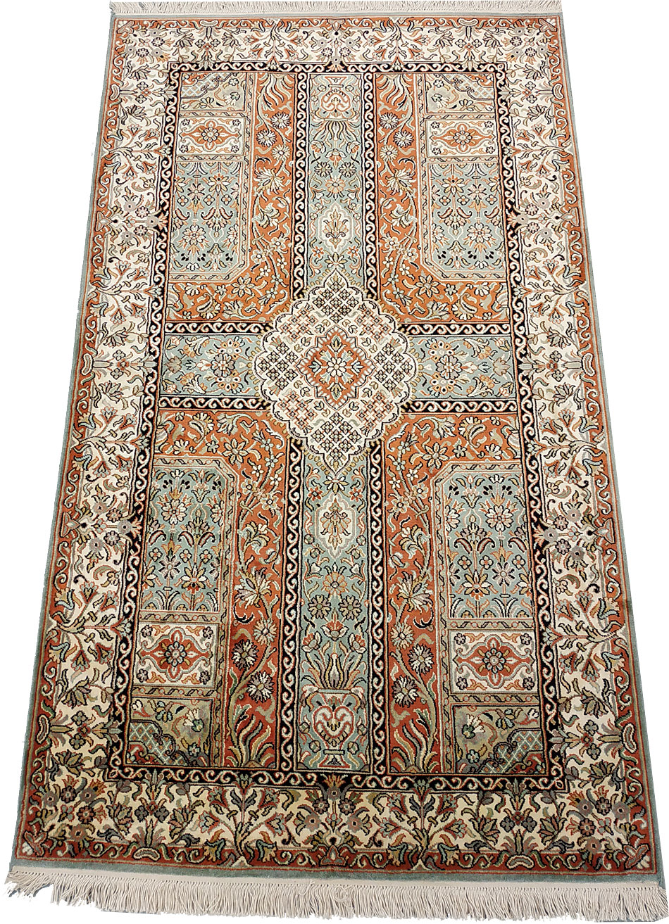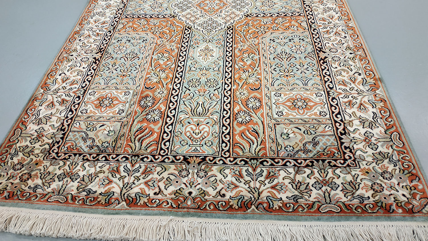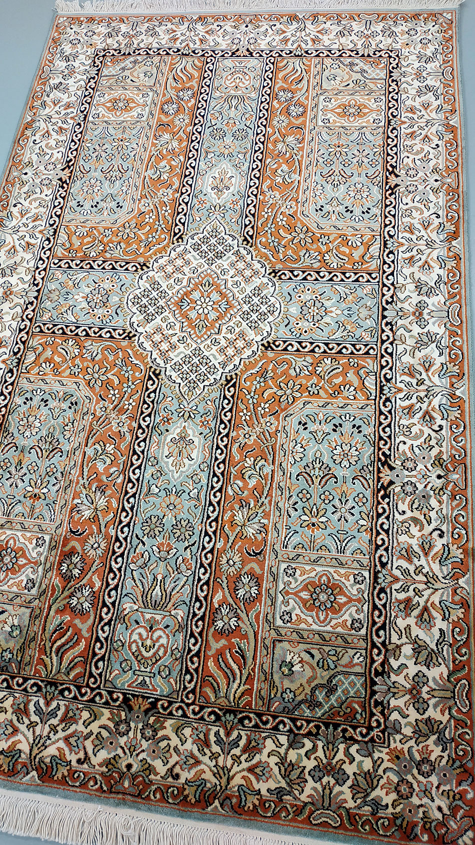 Dimensions : 150 x 100 cm -soie- Pays Inde - Épaisseur : 6 mm - Densité de nouage : 500.000 Nœuds au m² - Surface : 1.5 m² - Poids : 3 Kgs - Age : contemporain - Confection : Noué main - Forme : Tapis de chambre - Type : Tapis Oriental