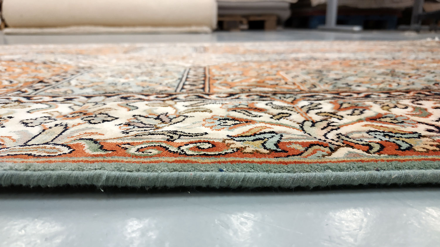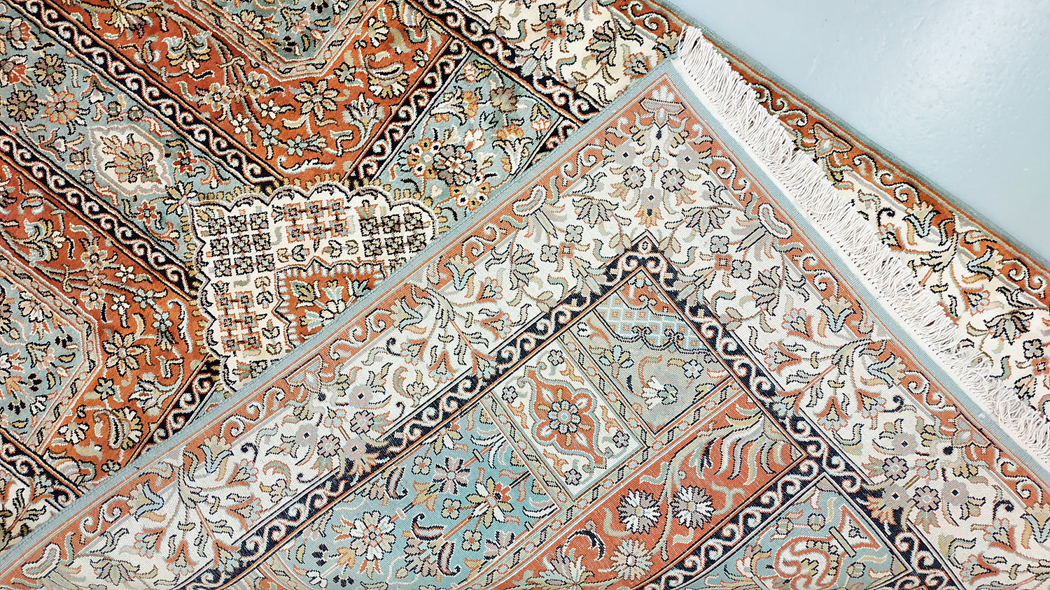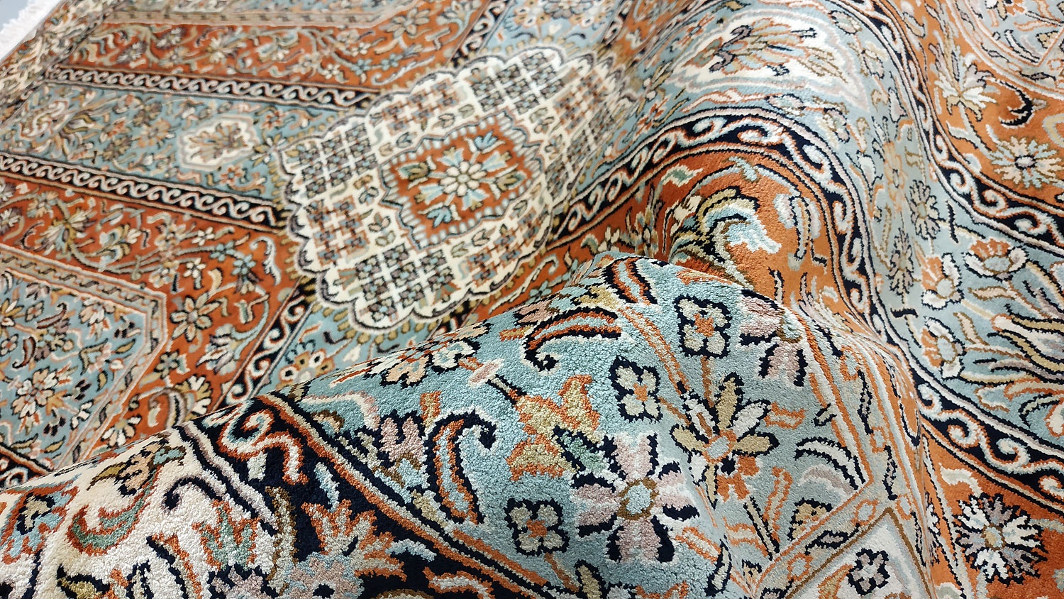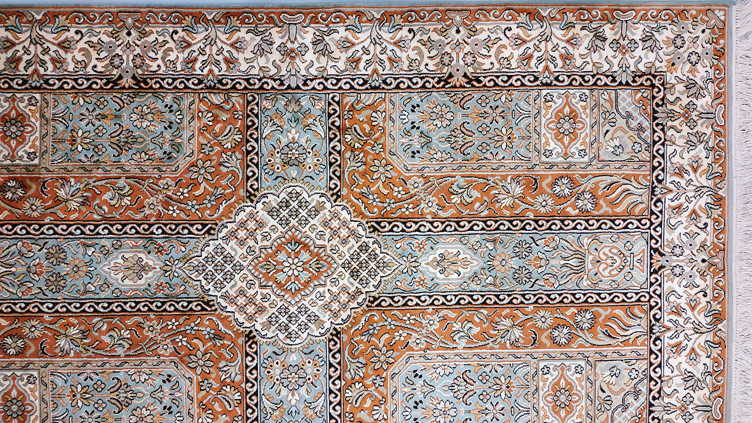 Dimensions : 150 x 100 cm -soie- Pays Inde - Épaisseur : 6 mm - Densité de nouage : 500.000 Nœuds au m² - Surface : 1.5 m² - Poids : 3 Kgs - Age : contemporain - Confection : Noué main - Forme : Tapis de chambre - Type : Tapis Oriental