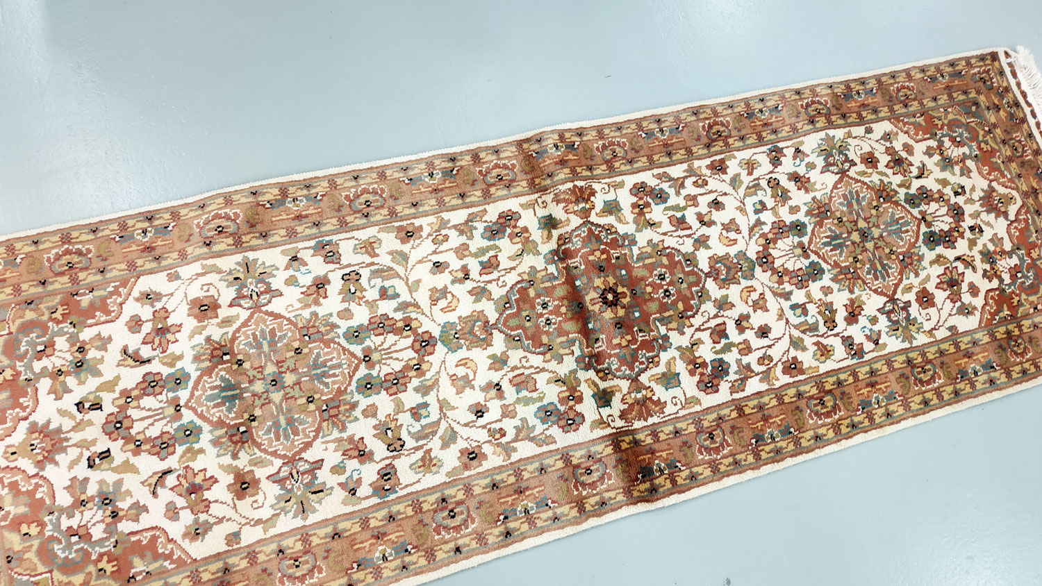 Dimensions : 181 x 59 cm -laine et soie- Pays Pakistan - Épaisseur : 7 mm - Densité de nouage : 200.000 Nœuds au m² - Surface : 1.07 m² - Poids : 2.67 Kgs - Age : contemporain - Confection : Noué main - Forme : Tapis de couloirs - Type : Tapis Oriental