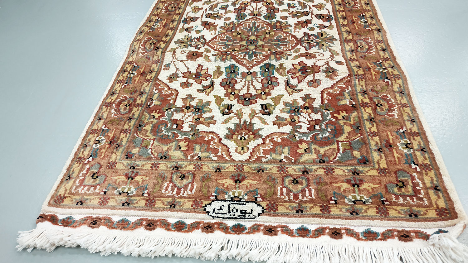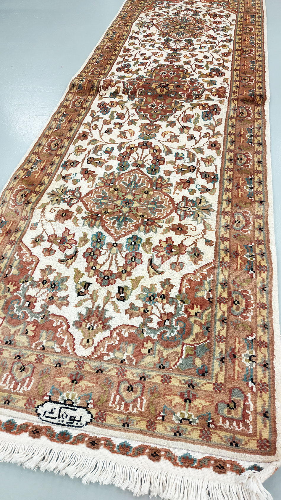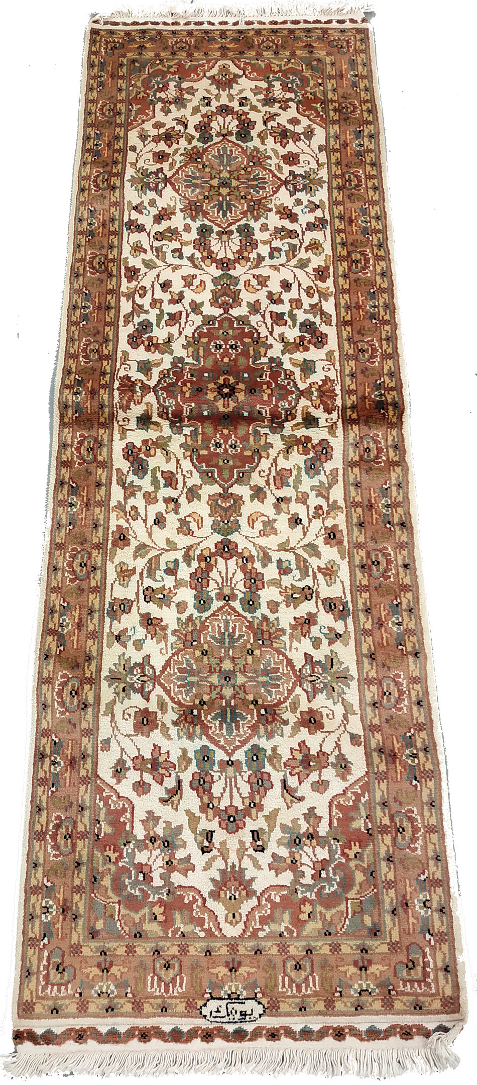 Dimensions : 170 x 63 cm -laine et soie- Pays Pakistan - Épaisseur : 7 mm - Densité de nouage : 200.000 Nœuds au m² - Surface : 1.07 m² - Poids : 2.68 Kgs - Age : contemporain - Confection : Noué main - Forme : Tapis de couloirs - Type : Tapis Oriental
