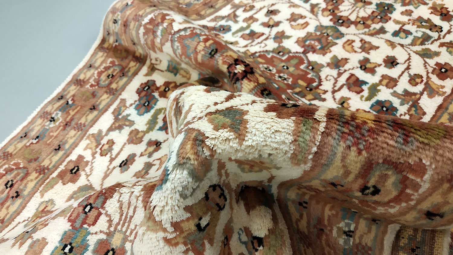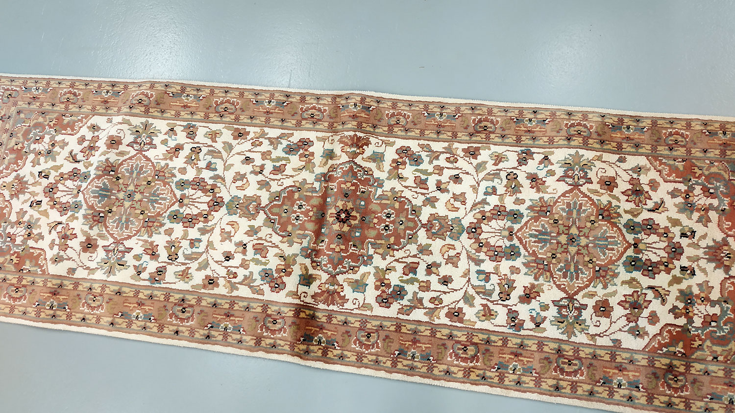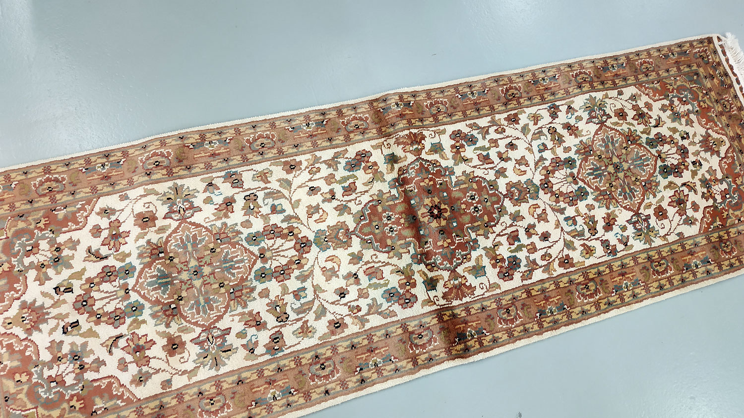 Dimensions : 170 x 63 cm -laine et soie- Pays Pakistan - Épaisseur : 7 mm - Densité de nouage : 200.000 Nœuds au m² - Surface : 1.07 m² - Poids : 2.68 Kgs - Age : contemporain - Confection : Noué main - Forme : Tapis de couloirs - Type : Tapis Oriental