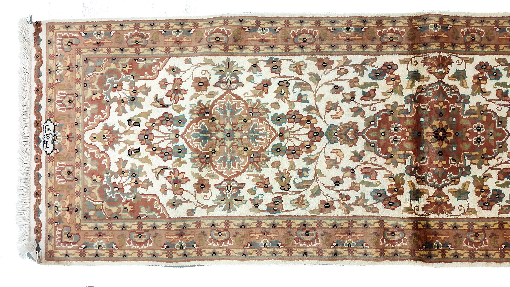 Dimensions : 183 x 62 cm -laine et soie- Pays Pakistan - Épaisseur : 7 mm - Densité de nouage : 200.000 Nœuds au m² - Surface : 1.13 m² - Poids : 2.84 Kgs - Age : contemporain - Confection : Noué main - Forme : Tapis de couloirs - Type : Tapis Oriental