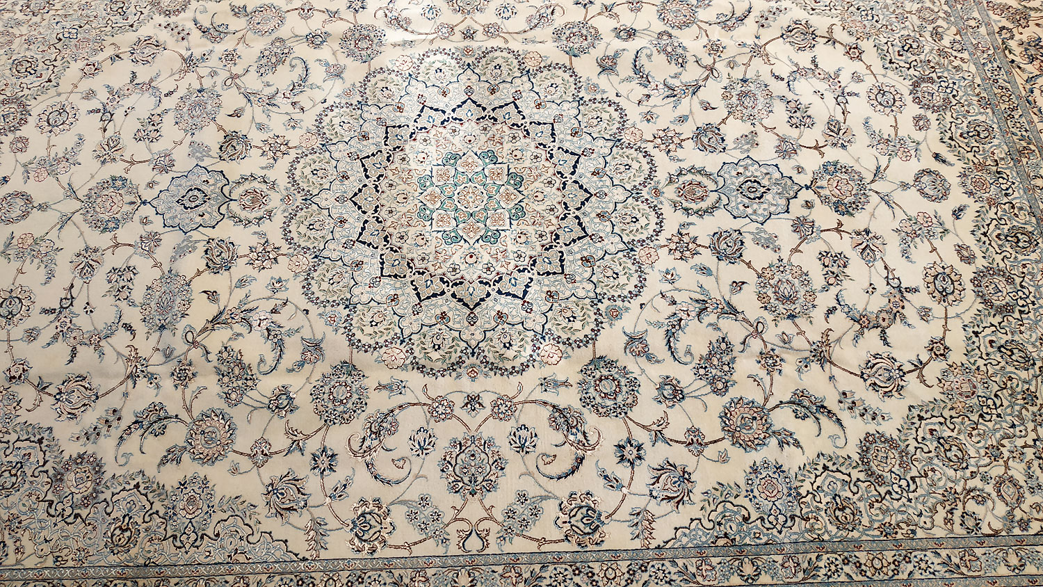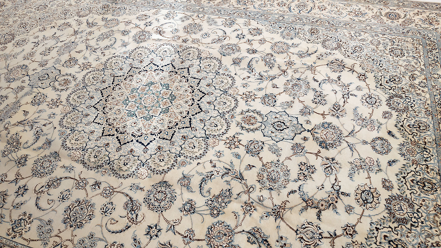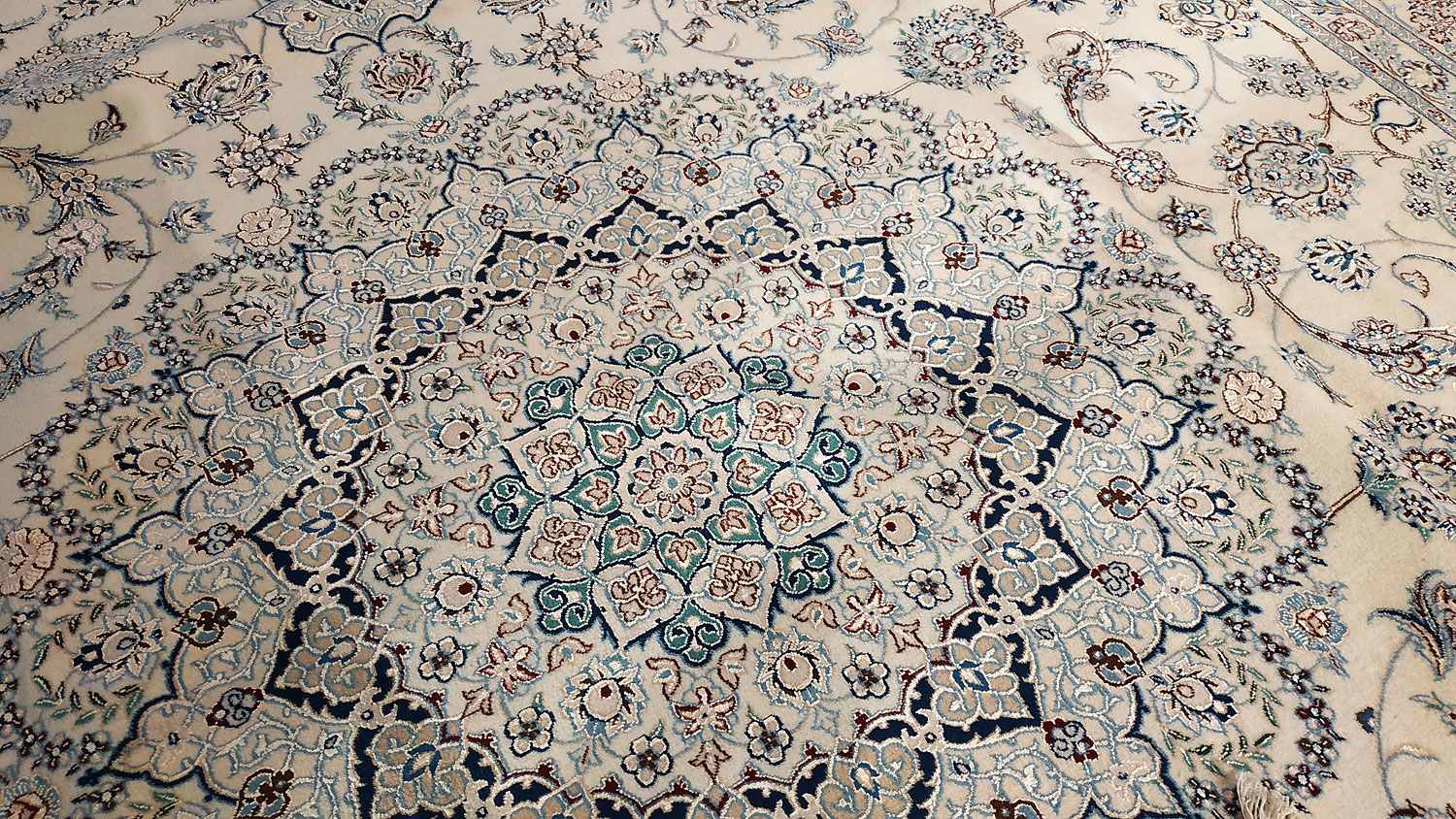 Dimensions : 355 x 260 cm -laine et soie- Pays Iran - Épaisseur : 8 mm - Densité de nouage : 800.000 Nœuds au m² - Surface : 9.23 m² - Poids : 23.08 Kgs - Age : contemporain - Confection : Noué main - Forme : Tapis de salon - Type : Tapis persan