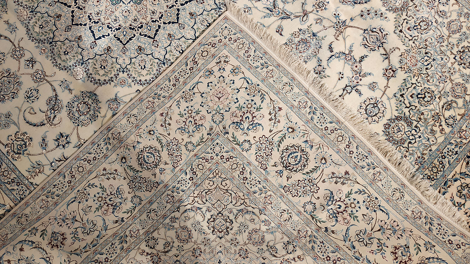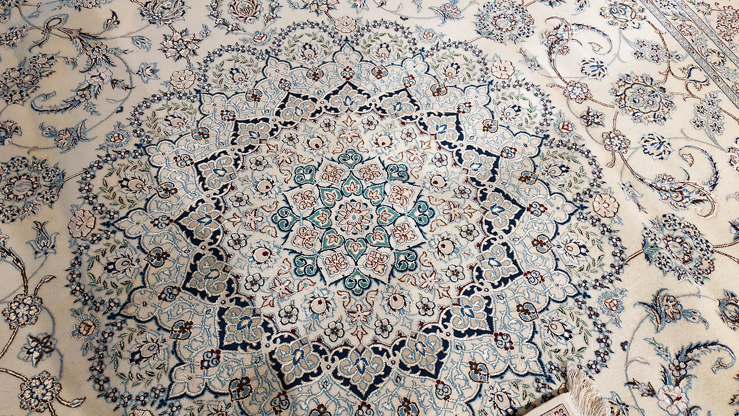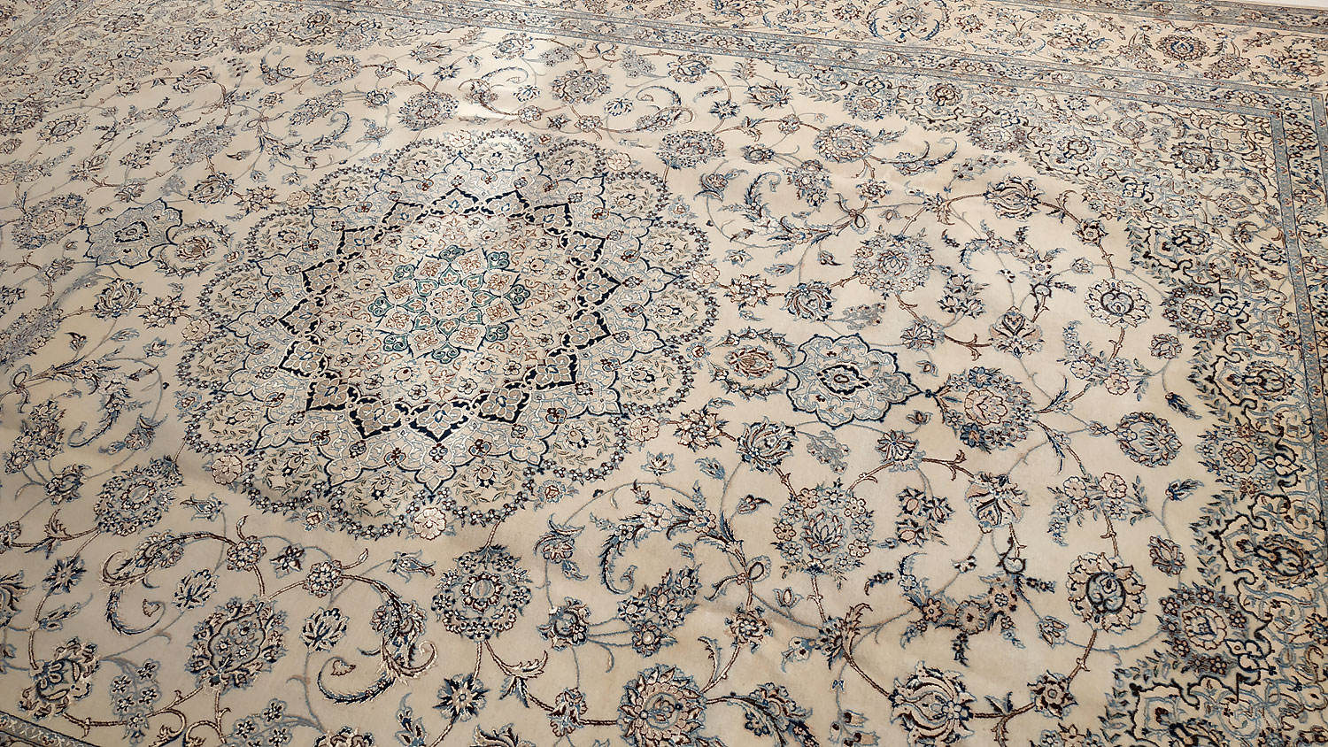 Dimensions : 355 x 260 cm -laine et soie- Pays Iran - Épaisseur : 8 mm - Densité de nouage : 800.000 Nœuds au m² - Surface : 9.23 m² - Poids : 23.08 Kgs - Age : contemporain - Confection : Noué main - Forme : Tapis de salon - Type : Tapis persan
