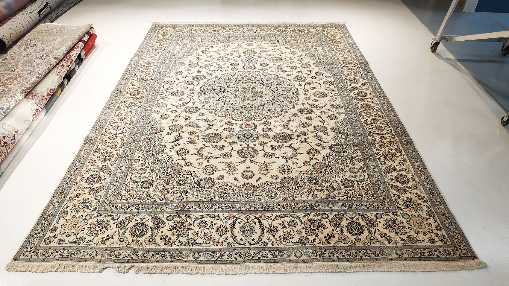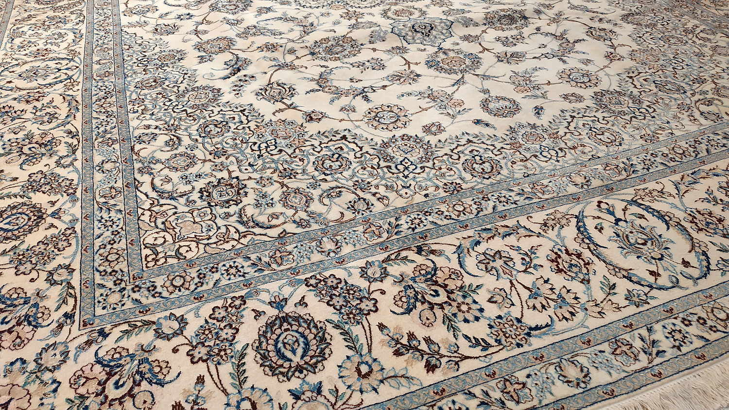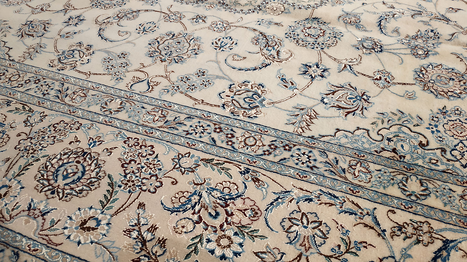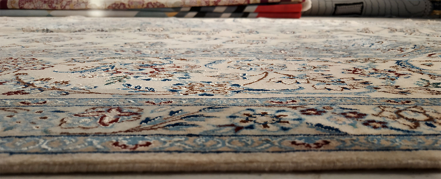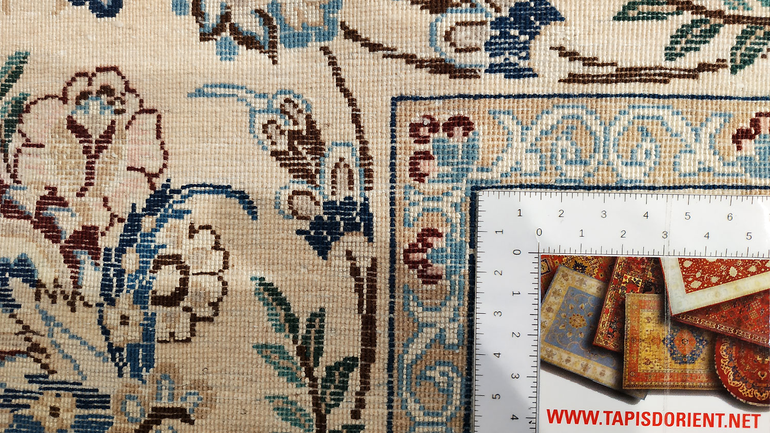 Dimensions : 345 x 243 cm -laine et soie- Pays Iran - Épaisseur : 8 mm - Densité de nouage : 800.000 Nœuds au m² - Surface : 8.38 m² - Poids : 20.96 Kgs - Age : contemporain - Confection : Noué main - Forme : Tapis de salon - Type : Tapis persan