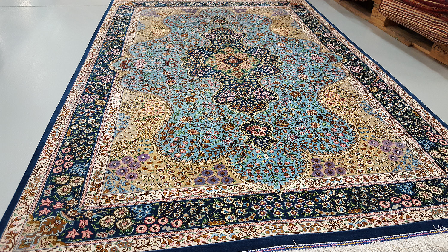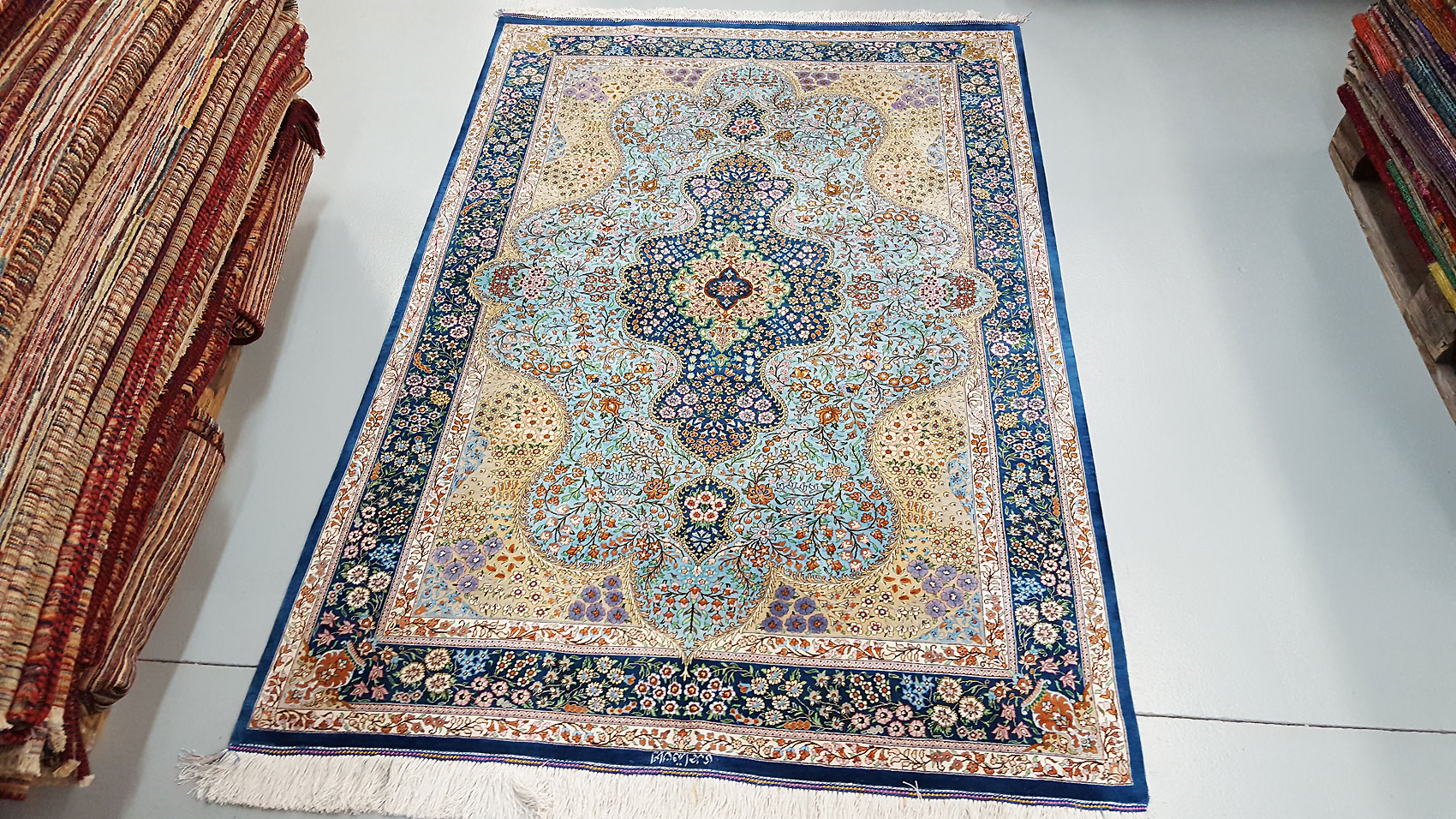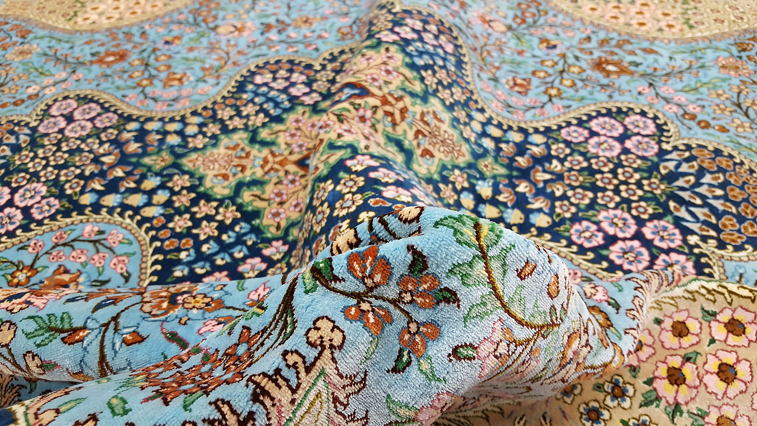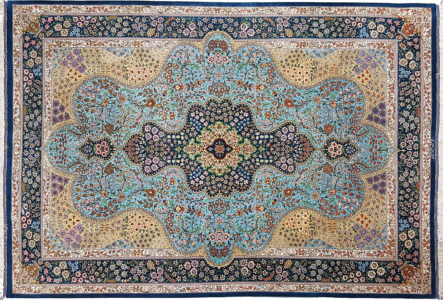Dimensions : 196 x 133 cm -soie- Pays Iran - Épaisseur : 3 mm - Densité de nouage : 1.000.000 Nœuds au m² - Surface : 2.61 m² - Poids : 5.21 Kgs - Age : contemporain - Confection : Noué main - Forme : Tapis de chambre - Type : Tapis persan