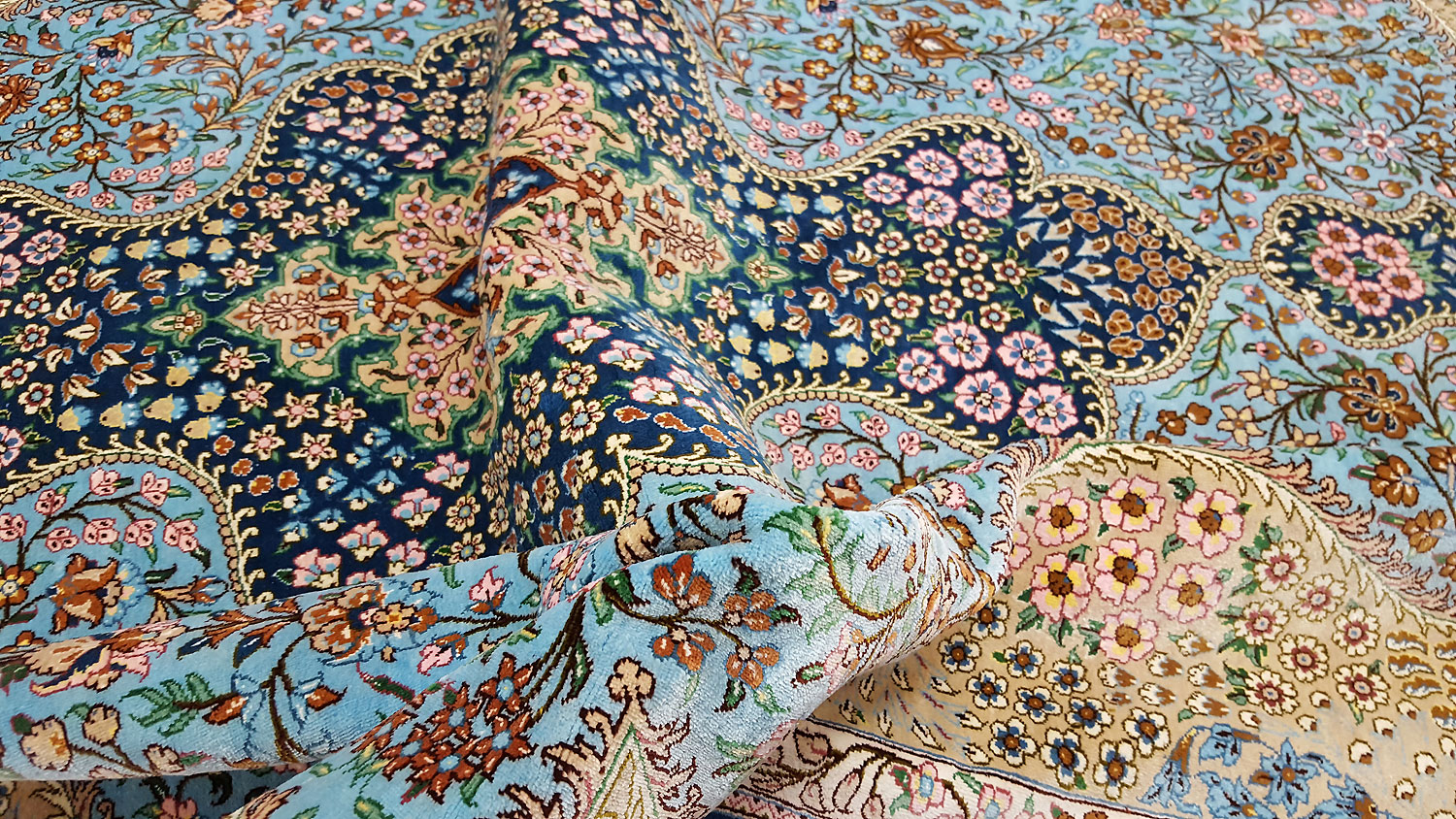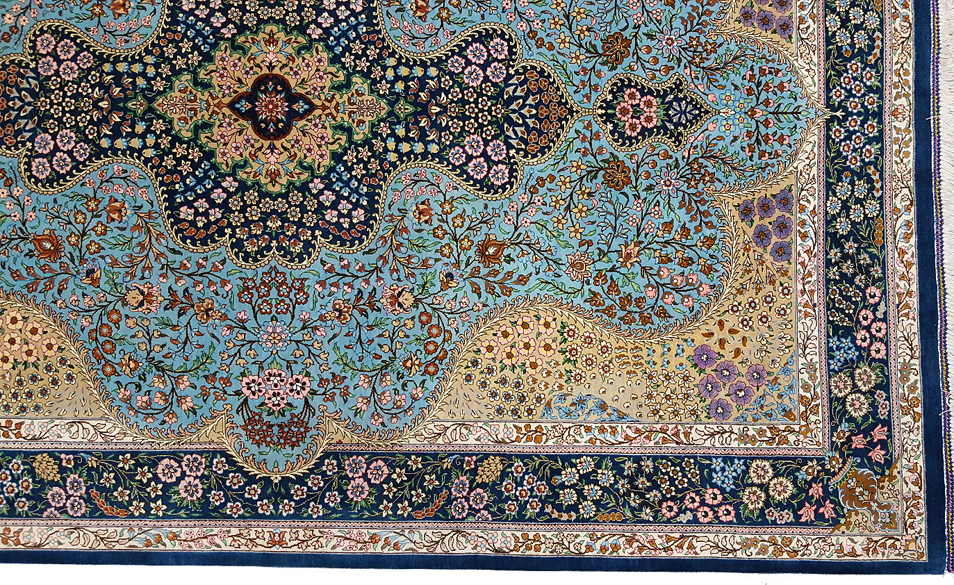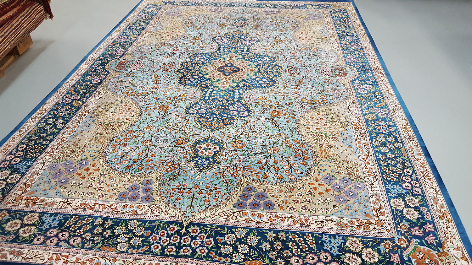 Dimensions : 196 x 133 cm -soie- Pays Iran - Épaisseur : 3 mm - Densité de nouage : 1.000.000 Nœuds au m² - Surface : 2.61 m² - Poids : 5.21 Kgs - Age : contemporain - Confection : Noué main - Forme : Tapis de chambre - Type : Tapis persan