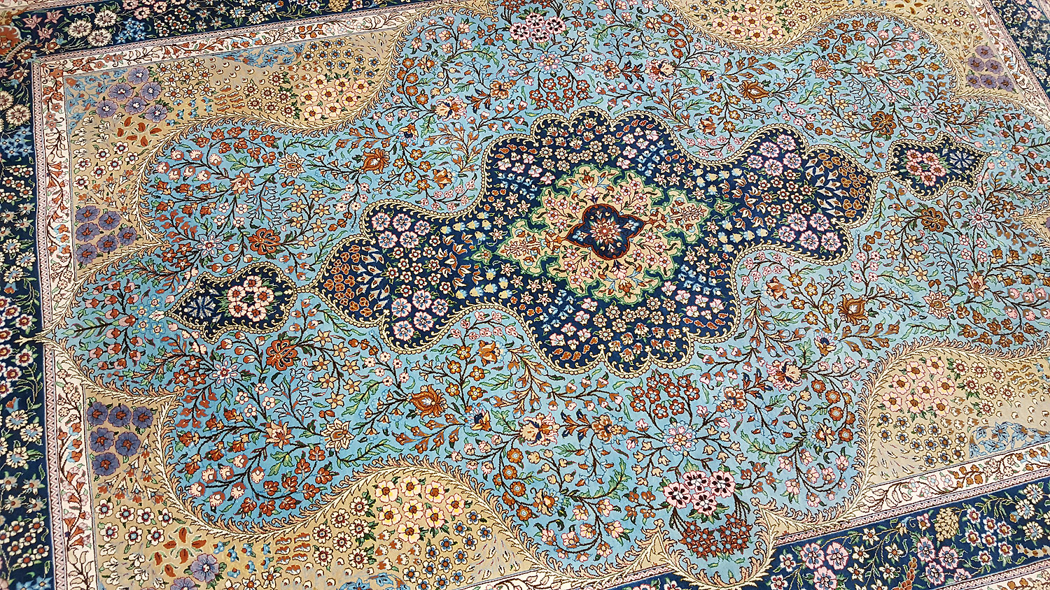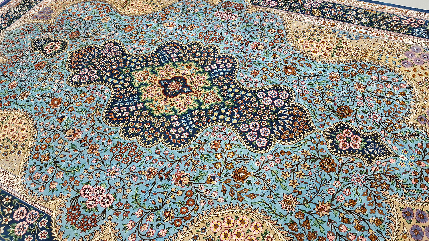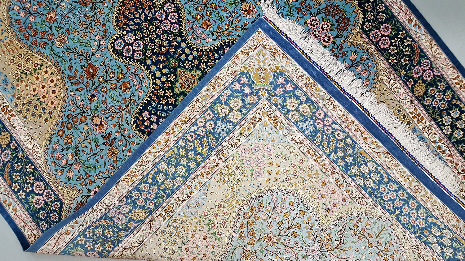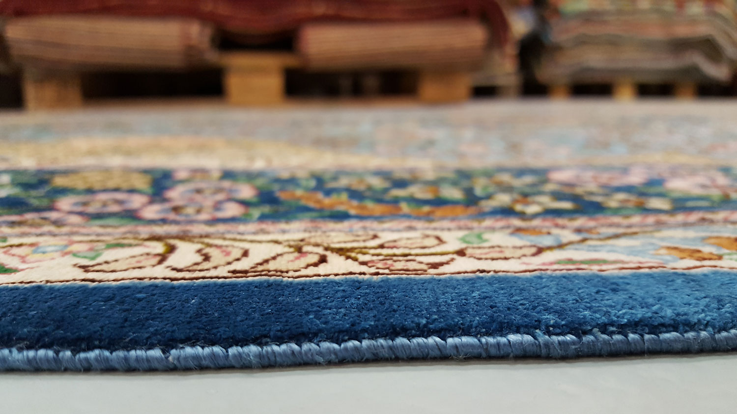 Dimensions : 196 x 133 cm -soie- Pays Iran - Épaisseur : 3 mm - Densité de nouage : 1.000.000 Nœuds au m² - Surface : 2.61 m² - Poids : 5.21 Kgs - Age : contemporain - Confection : Noué main - Forme : Tapis de chambre - Type : Tapis persan