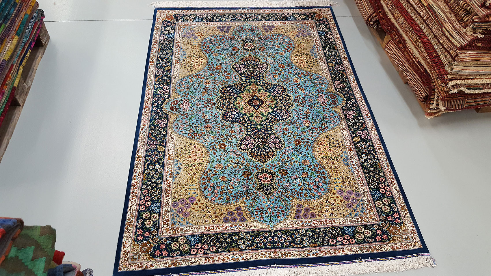 Dimensions : 195 x 130 cm -soie- Pays Iran - Épaisseur : 3 mm - Densité de nouage : 1.000.000 Nœuds au m² - Surface : 2.54 m² - Poids : 5.07 Kgs - Age : contemporain - Confection : Noué main - Forme : Tapis de chambre - Type : Tapis persan
