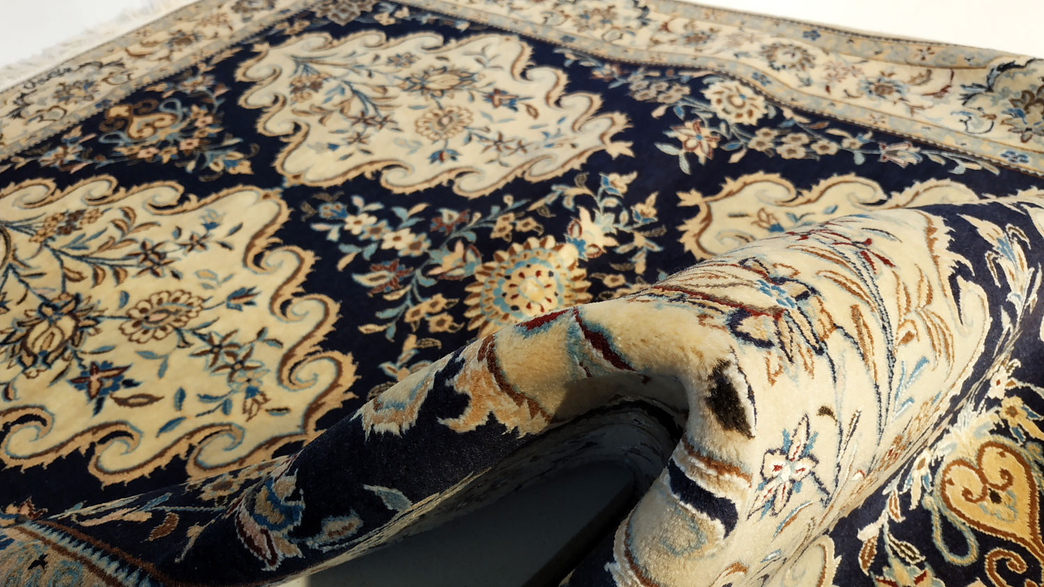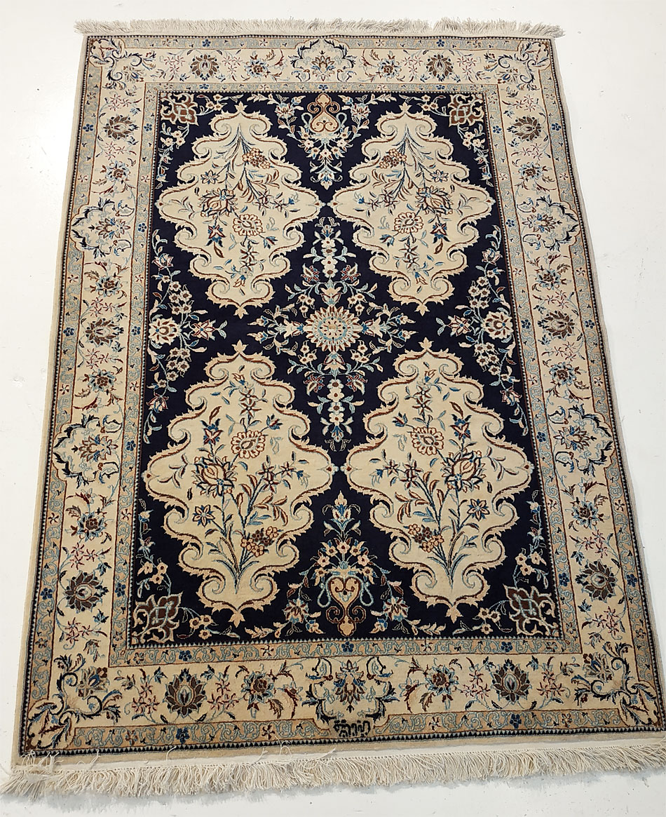 Dimensions : 147 x 105 cm -laine et soie- Pays Iran - Épaisseur : 8 mm - Densité de nouage : 800.000 Nœuds au m² - Surface : 1.54 m² - Poids : 3.86 Kgs - Age : contemporain - Confection : Noué main - Forme : Tapis de chambre - Type : Tapis persan