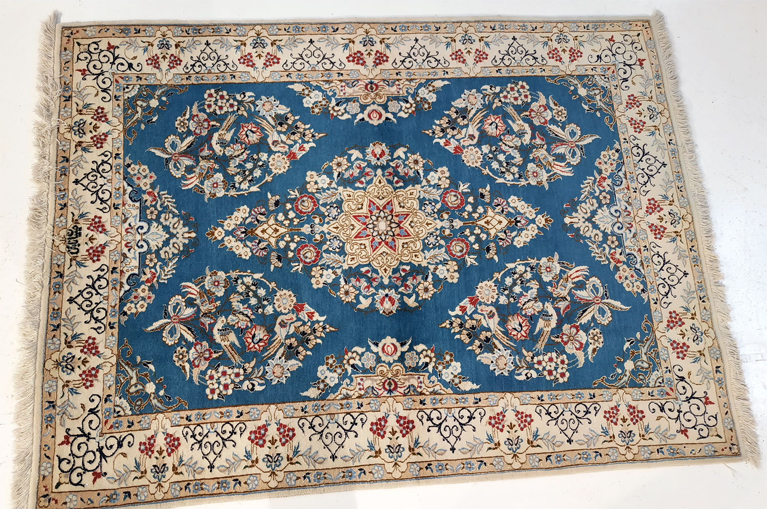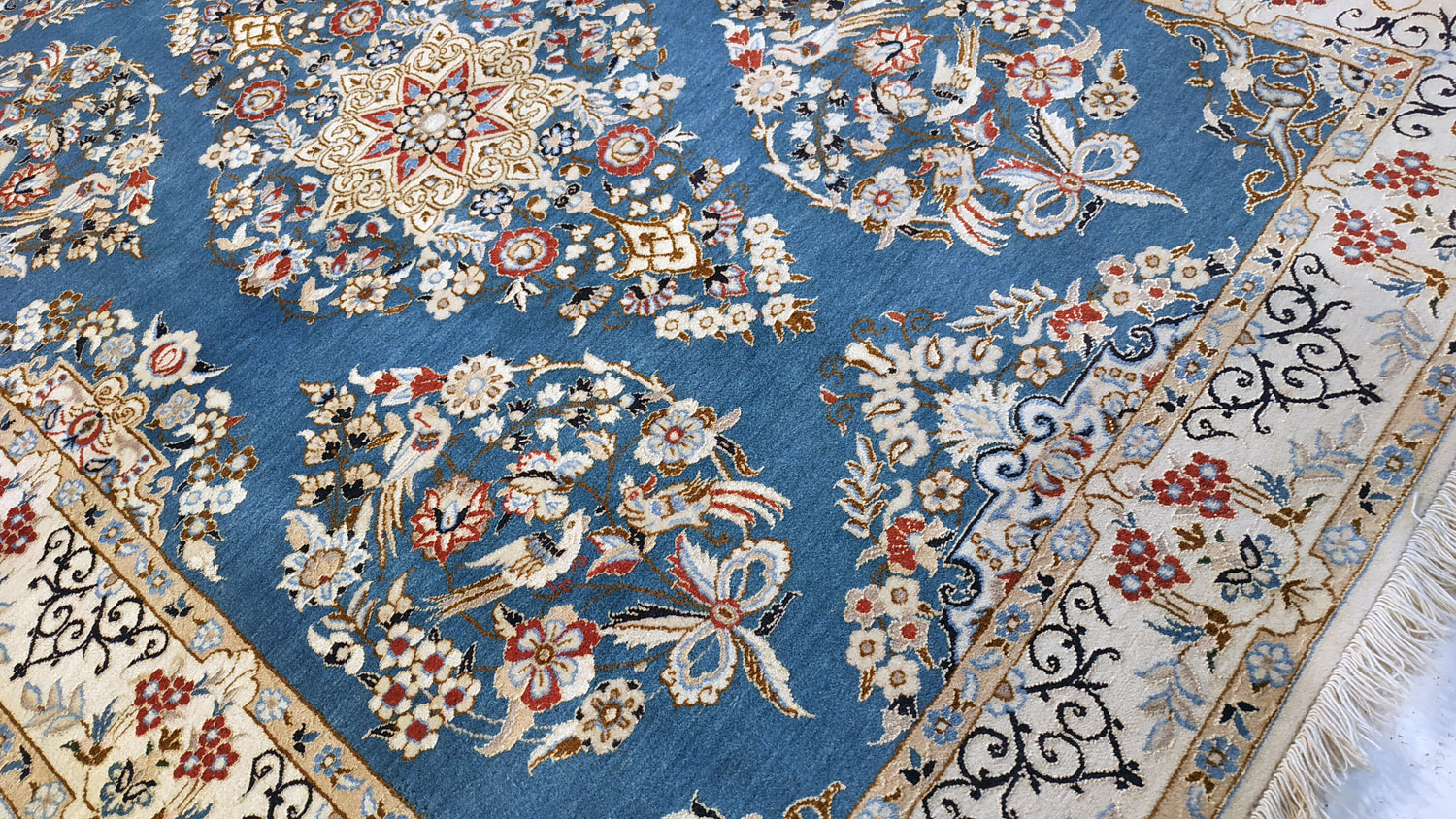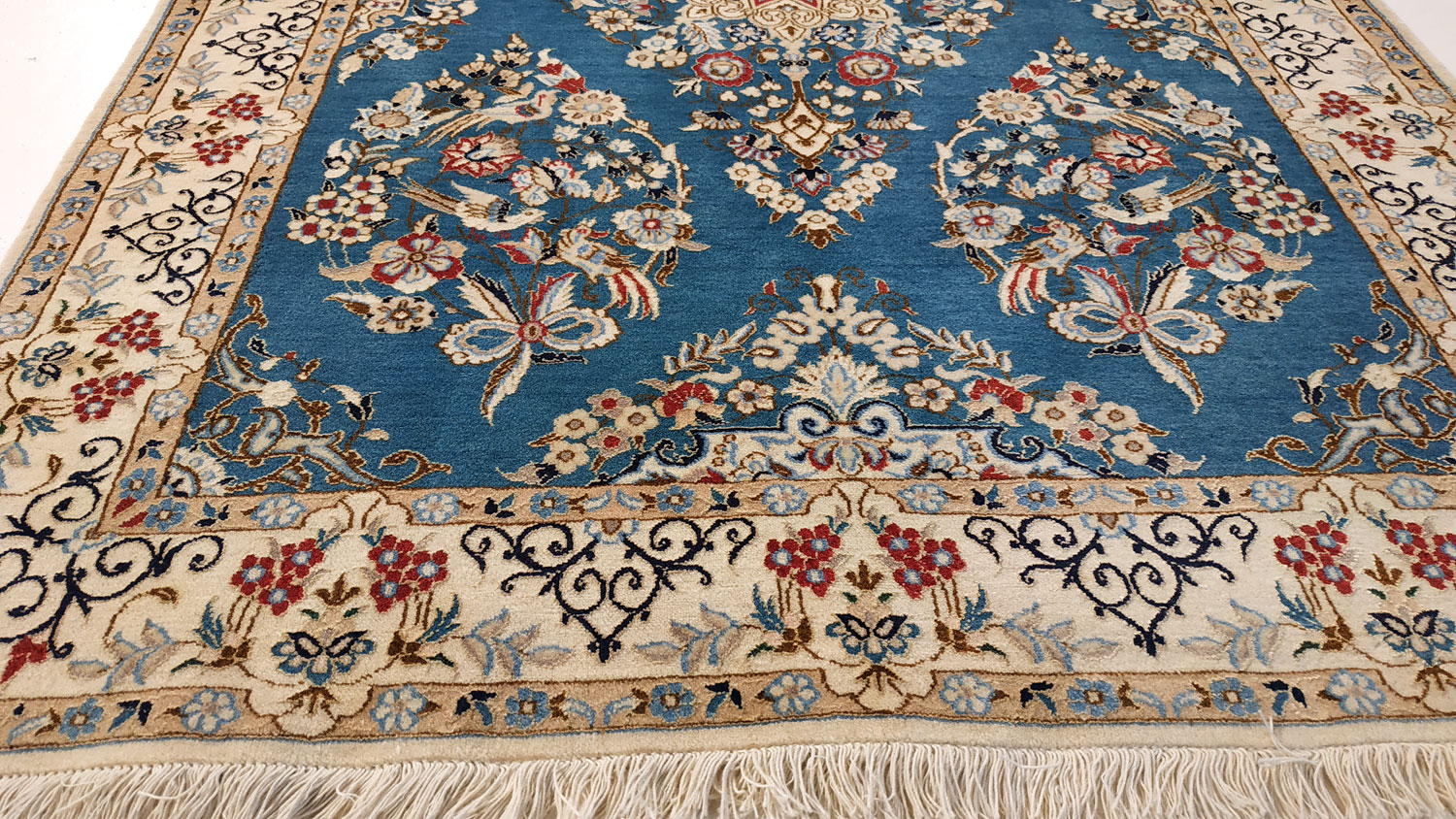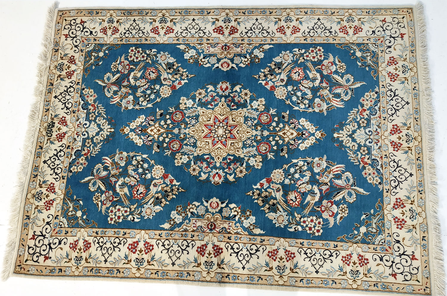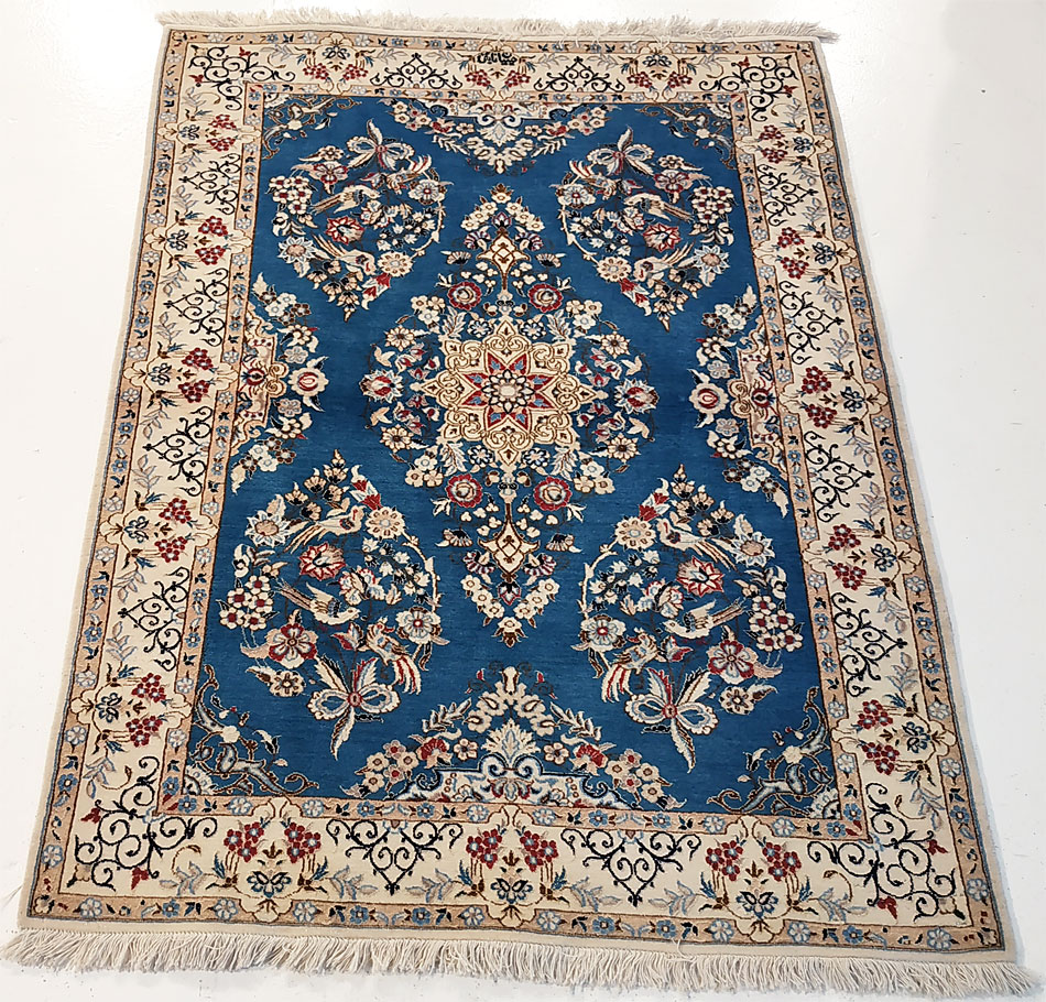 Dimensions : 163 x 118 cm -laine et soie- Pays Iran - Épaisseur : 8 mm - Densité de nouage : 800.000 Nœuds au m² - Surface : 1.92 m² - Poids : 4.81 Kgs - Age : contemporain - Confection : Noué main - Forme : Tapis de chambre - Type : Tapis persan