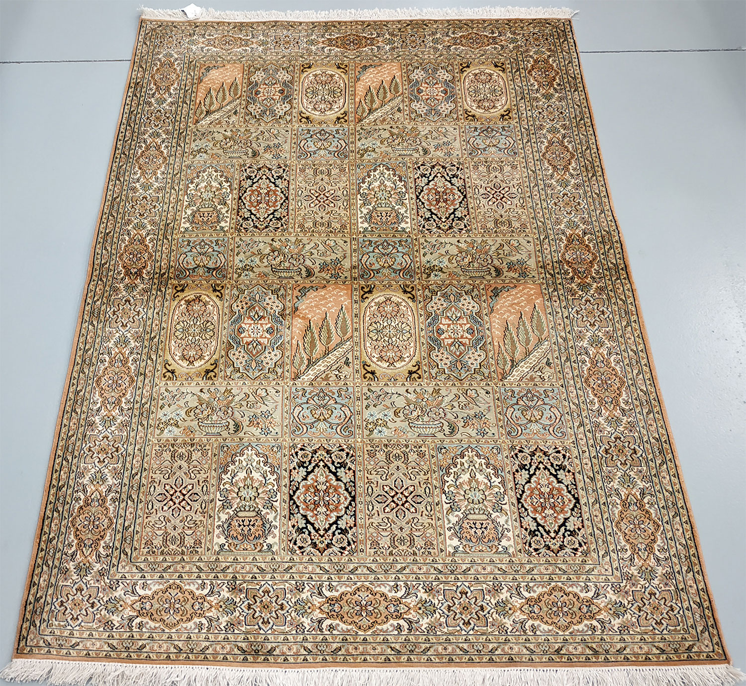 Dimensions : 183 x 122 cm -soie- Pays Inde - Épaisseur : 6 mm - Densité de nouage : 500.000 Nœuds au m² - Surface : 2.23 m² - Poids : 4.47 Kgs - Age : contemporain - Confection : Noué main - Forme : Tapis de chambre - Type : Tapis Oriental