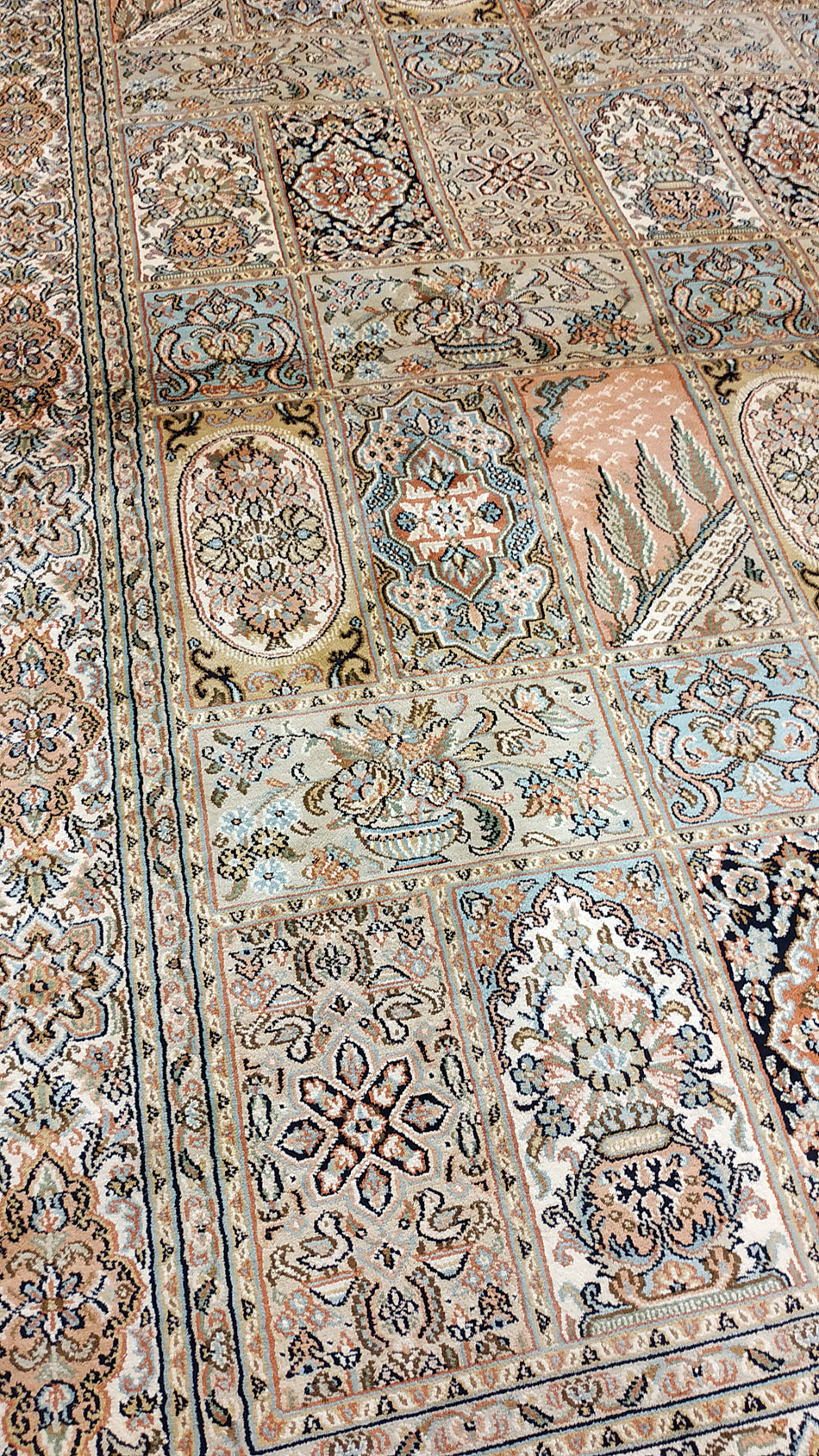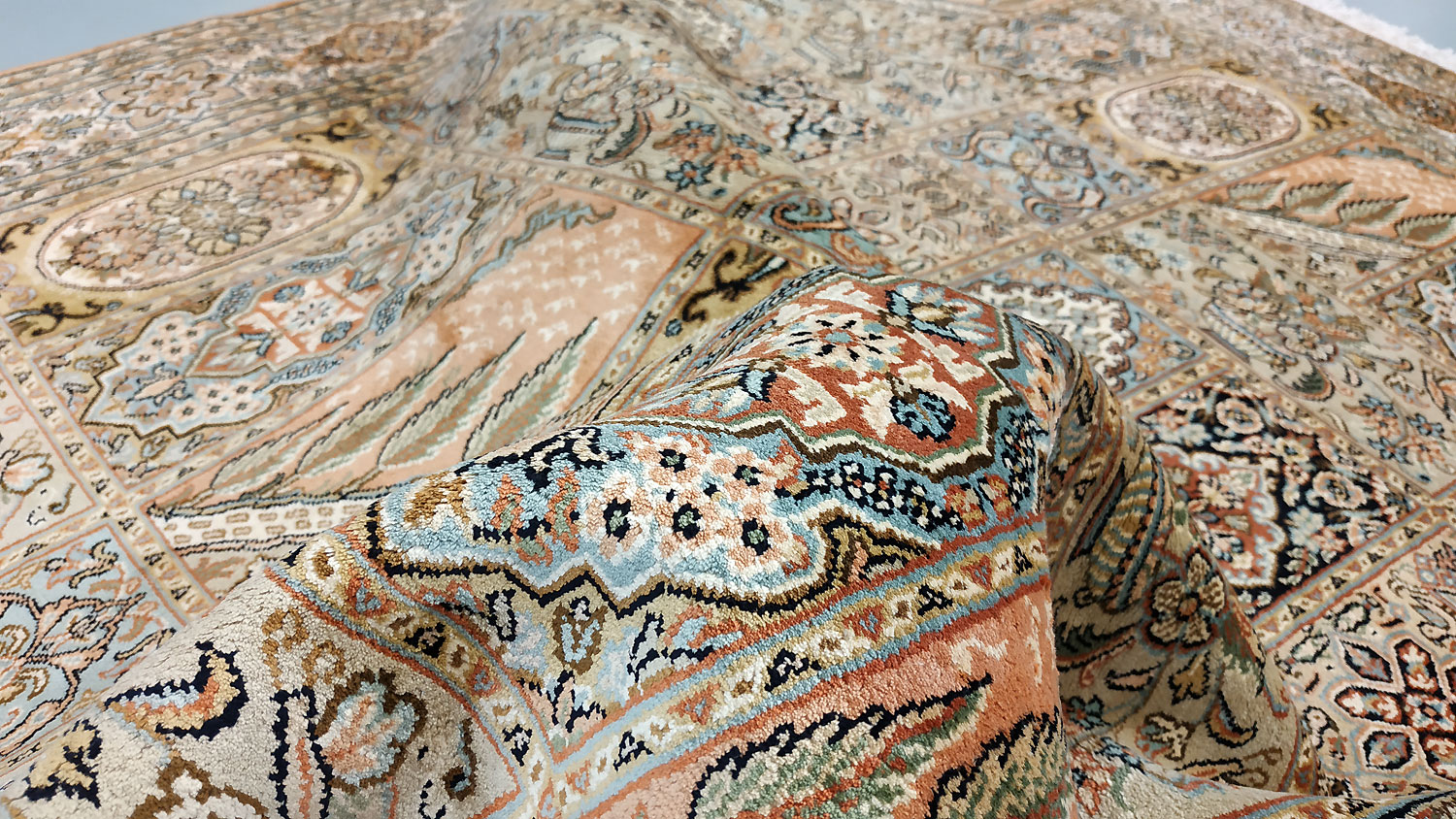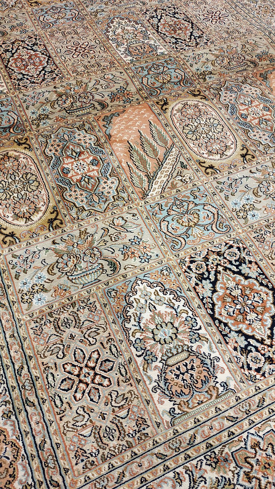 Dimensions : 197 x 123 cm -soie- Pays Inde - Épaisseur : 6 mm - Densité de nouage : 500.000 Nœuds au m² - Surface : 2.42 m² - Poids : 4.85 Kgs - Age : contemporain - Confection : Noué main - Forme : Tapis de chambre - Type : Tapis Oriental