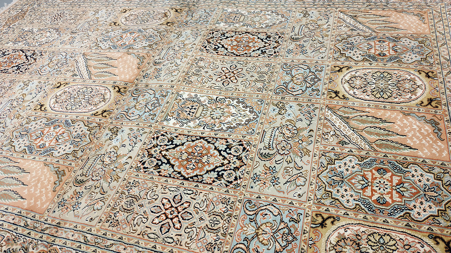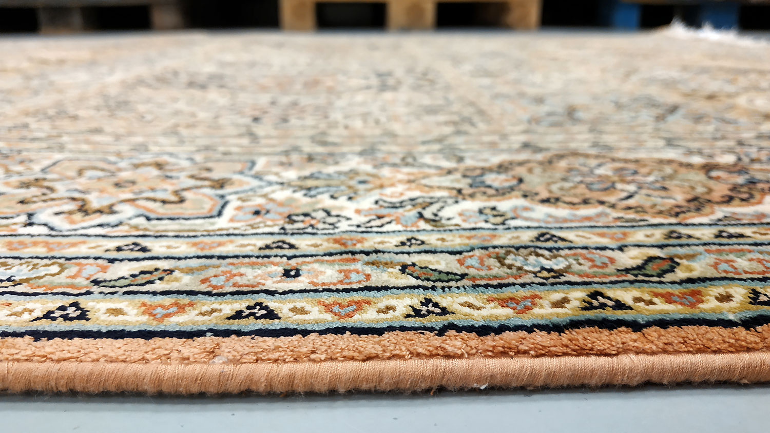 Dimensions : 191 x 125 cm -Laine et soie- Pays Inde - Épaisseur : 6 mm - Densité de nouage : 500.000 Nœuds au m² - Surface : 2.39 m² - Poids : 5.97 Kgs - Age : contemporain - Confection : Noué main - Forme : Tapis de chambre - Type : Tapis Oriental