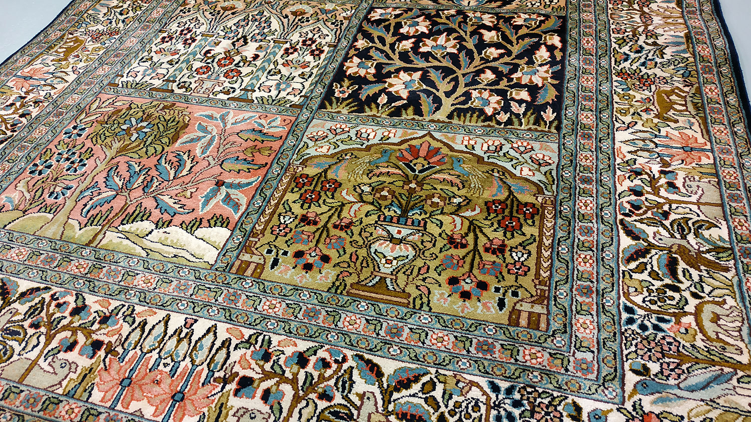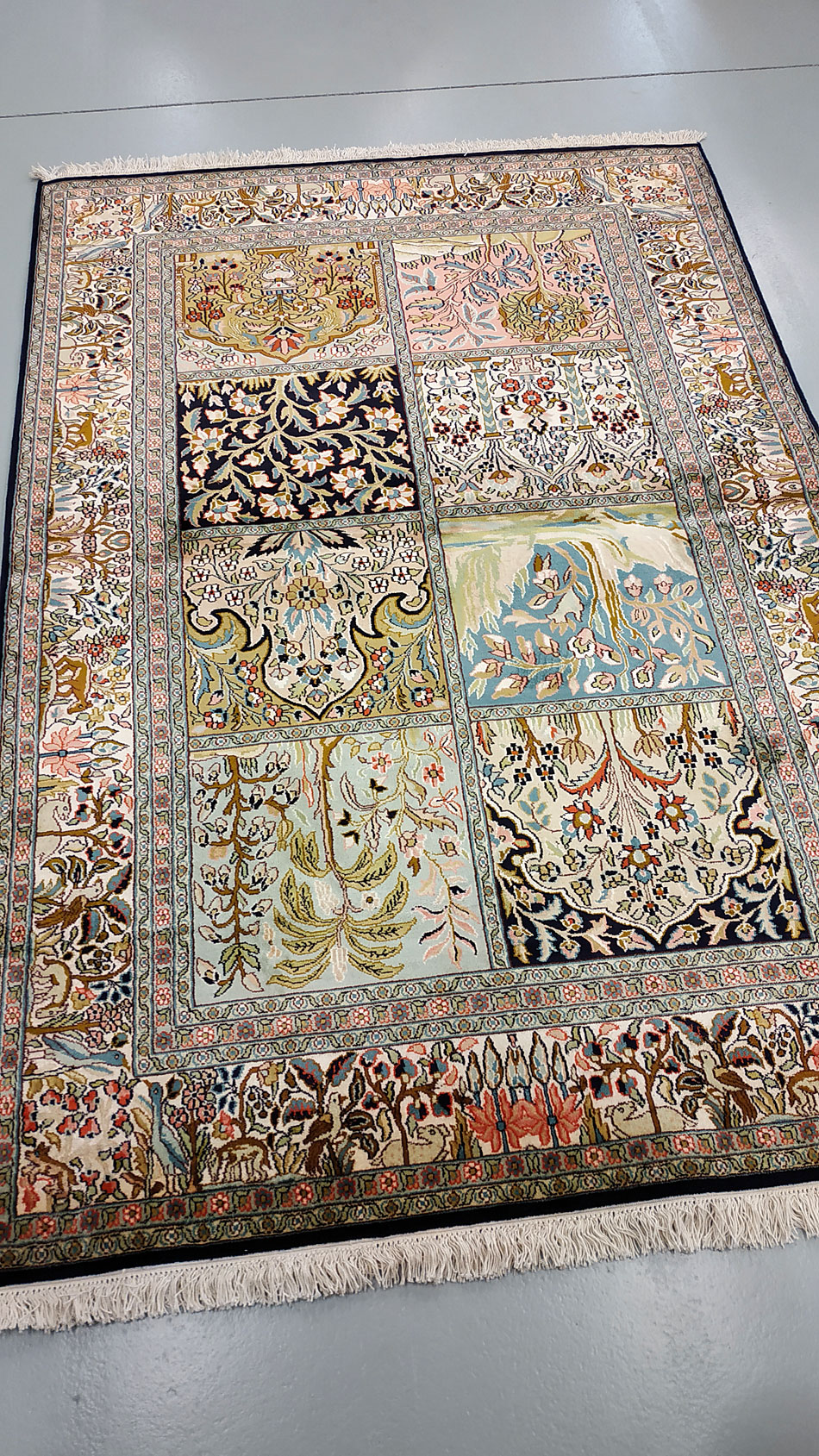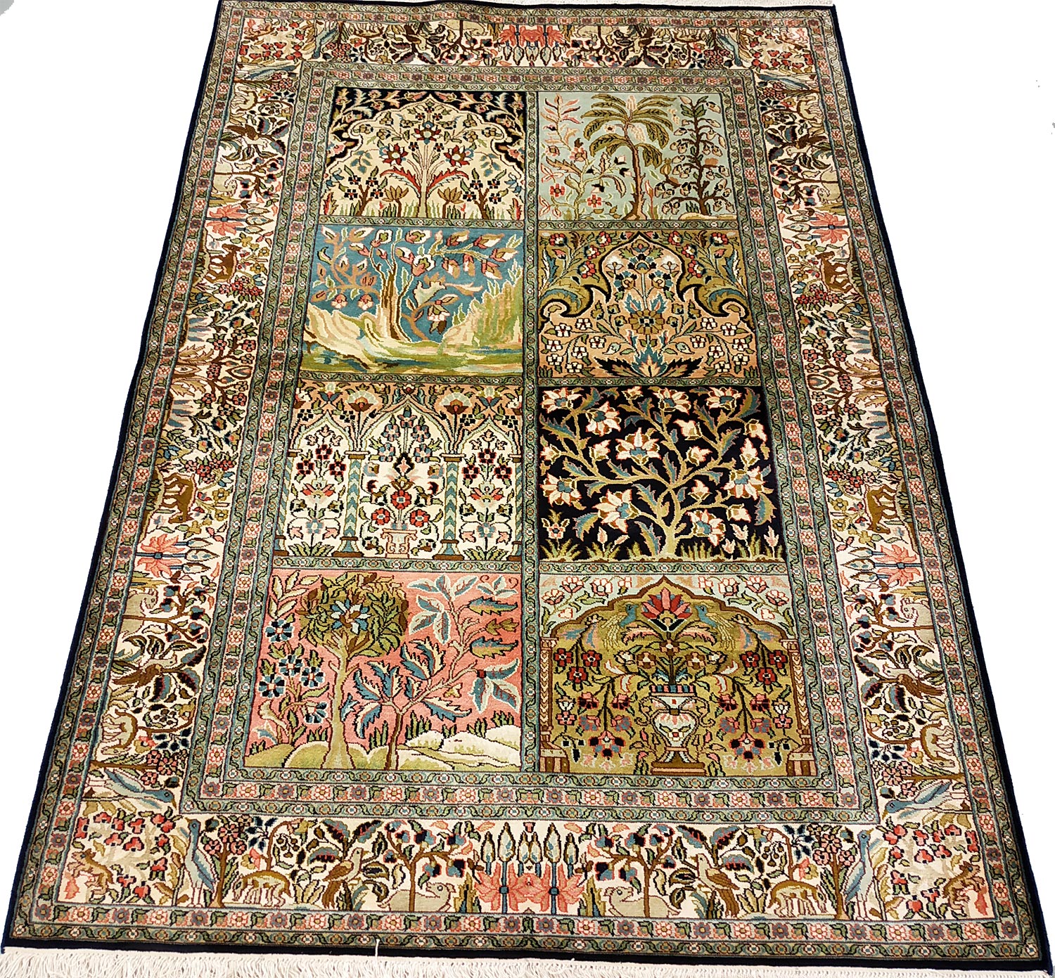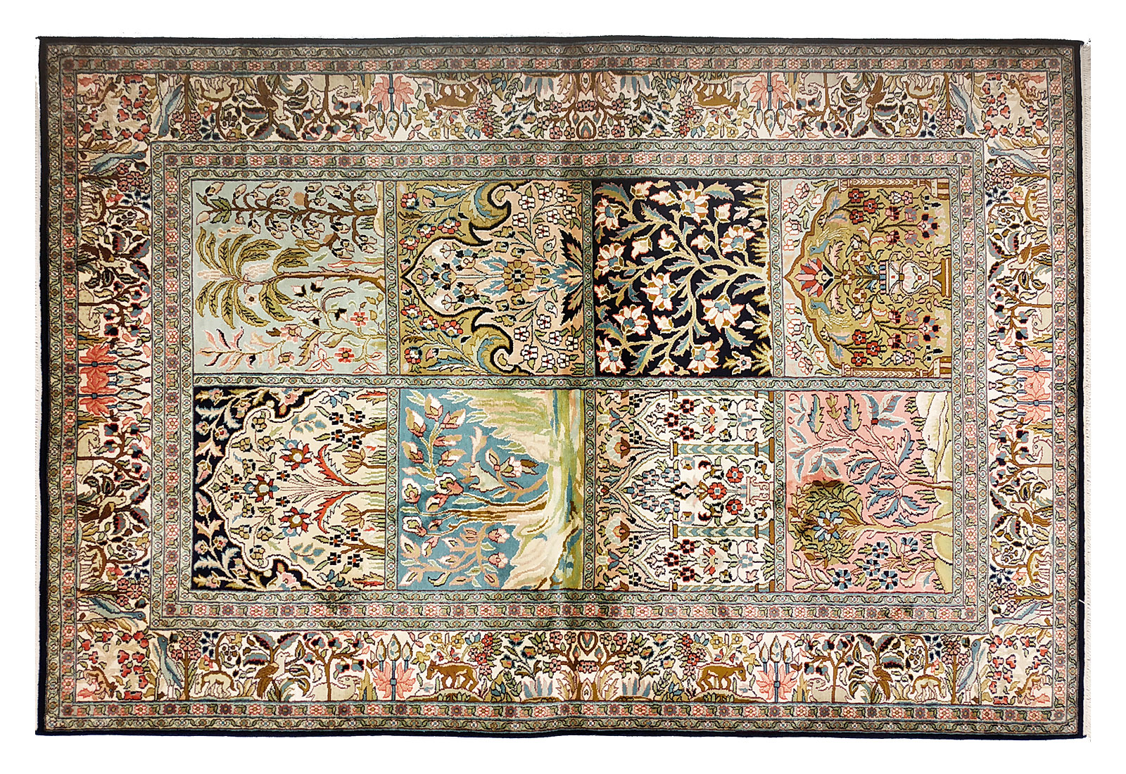Dimensions : 183 x 122 cm -soie- Pays Inde - Épaisseur : 6 mm - Densité de nouage : 500.000 Nœuds au m² - Surface : 2.23 m² - Poids : 4.47 Kgs - Age : contemporain - Confection : Noué main - Forme : Tapis de chambre - Type : Tapis Oriental
