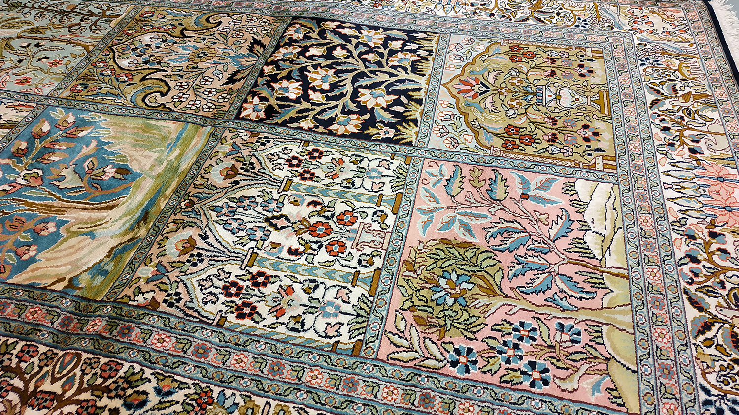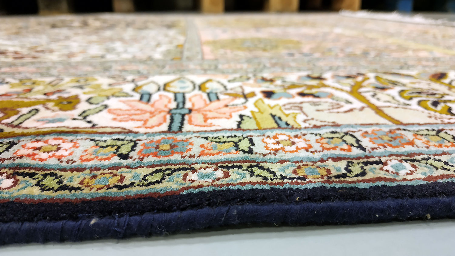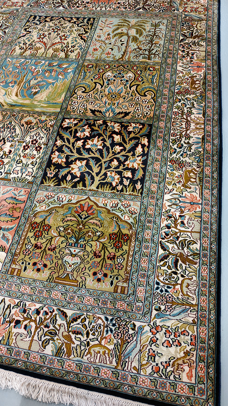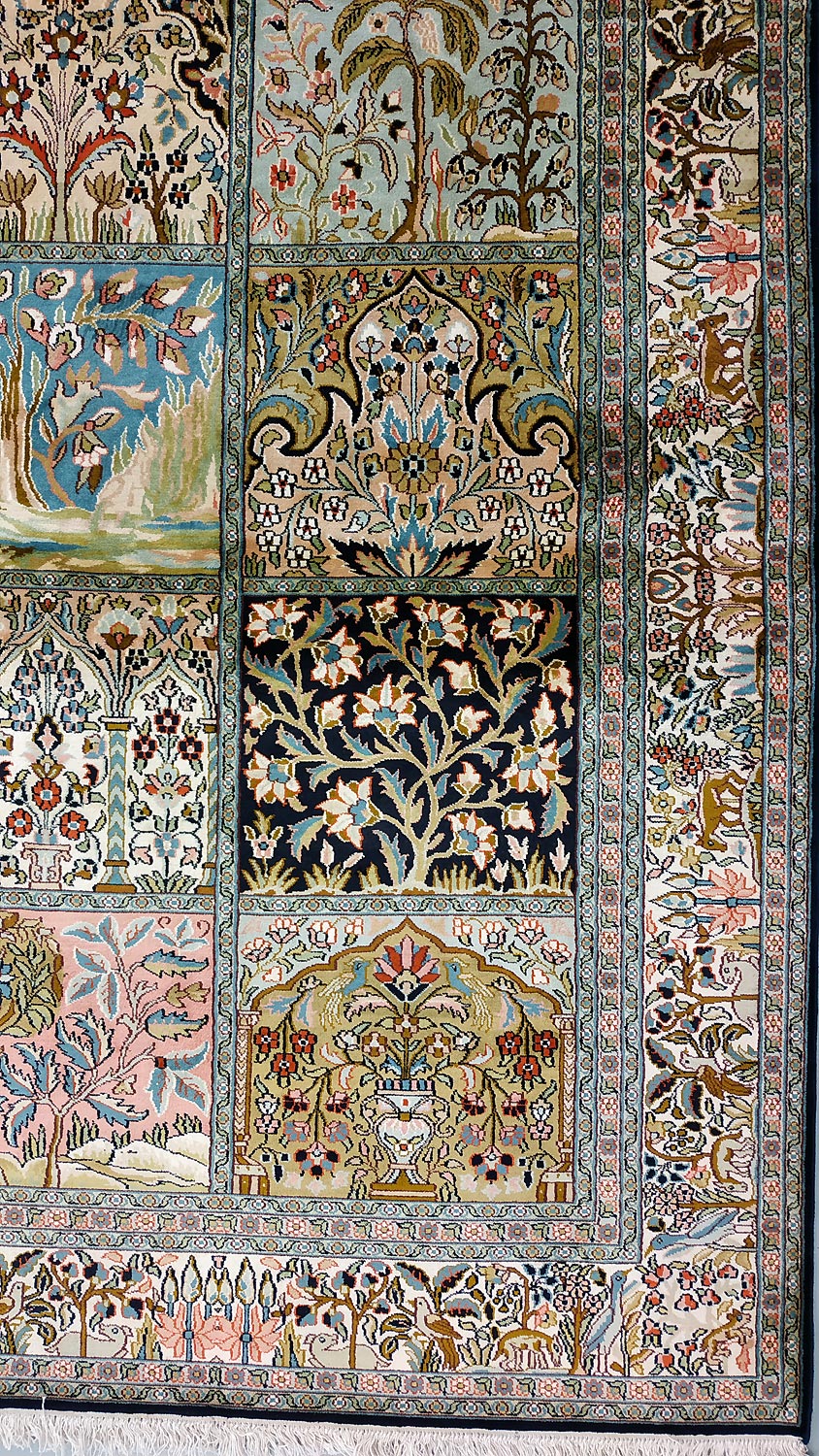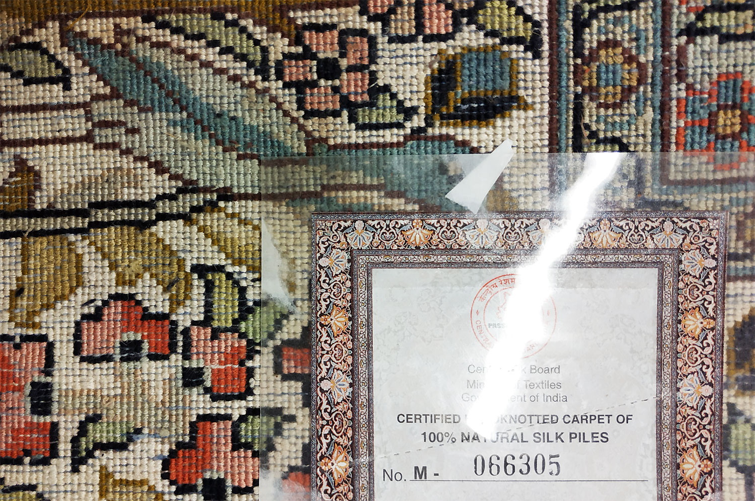 Dimensions : 197 x 123 cm -soie- Pays Inde - Épaisseur : 6 mm - Densité de nouage : 500.000 Nœuds au m² - Surface : 2.42 m² - Poids : 4.85 Kgs - Age : contemporain - Confection : Noué main - Forme : Tapis de chambre - Type : Tapis Oriental