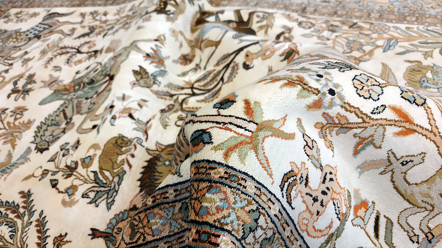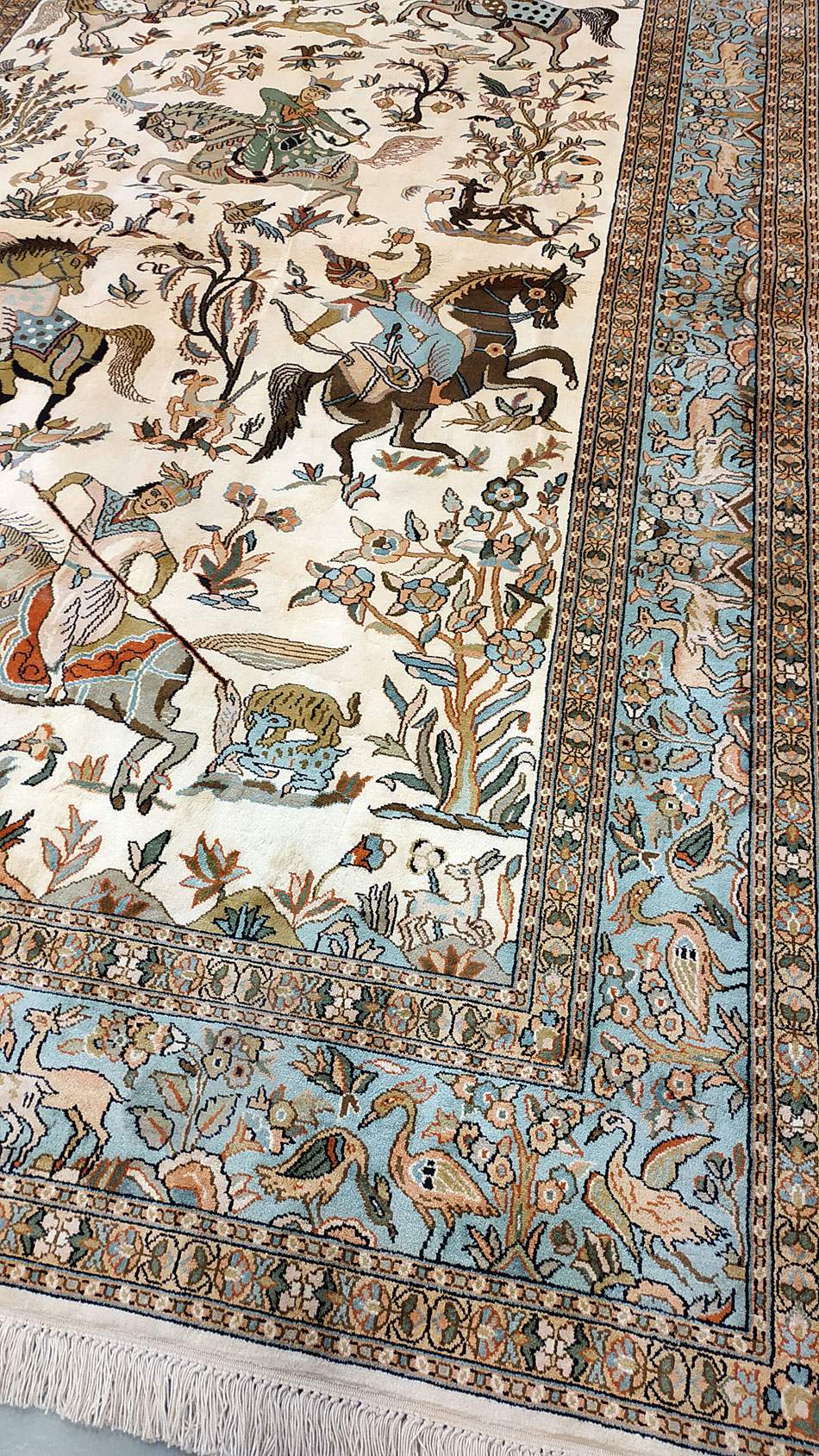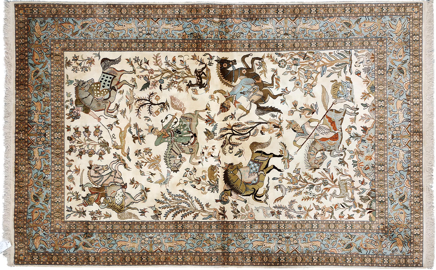 Dimensions : 217 x 157 cm -soie- Pays Inde - Épaisseur : 6 mm - Densité de nouage : 500.000 Nœuds au m² - Surface : 3.41 m² - Poids : 6.81 Kgs - Age : contemporain - Confection : Noué main - Forme : Tapis de chambre - Type : Tapis Oriental