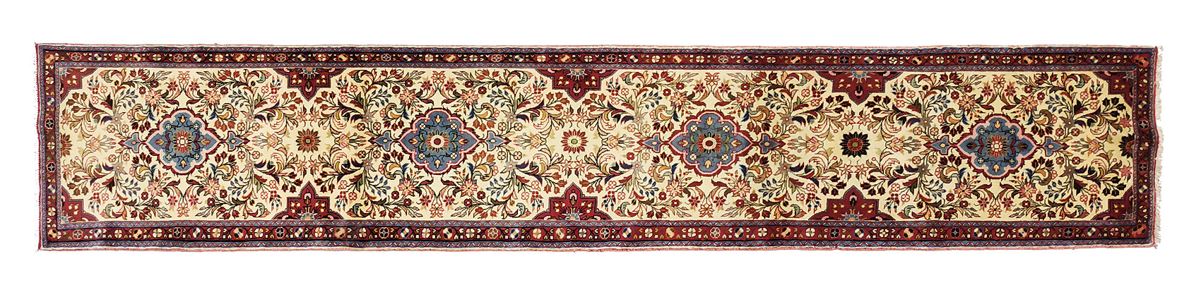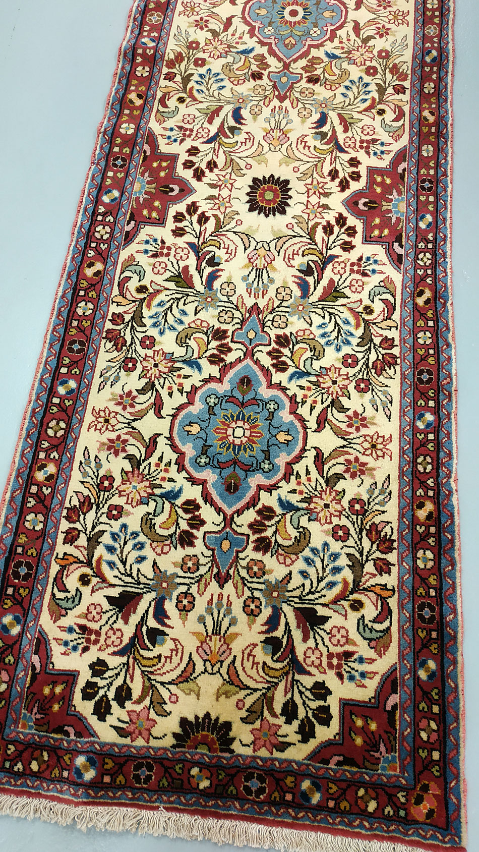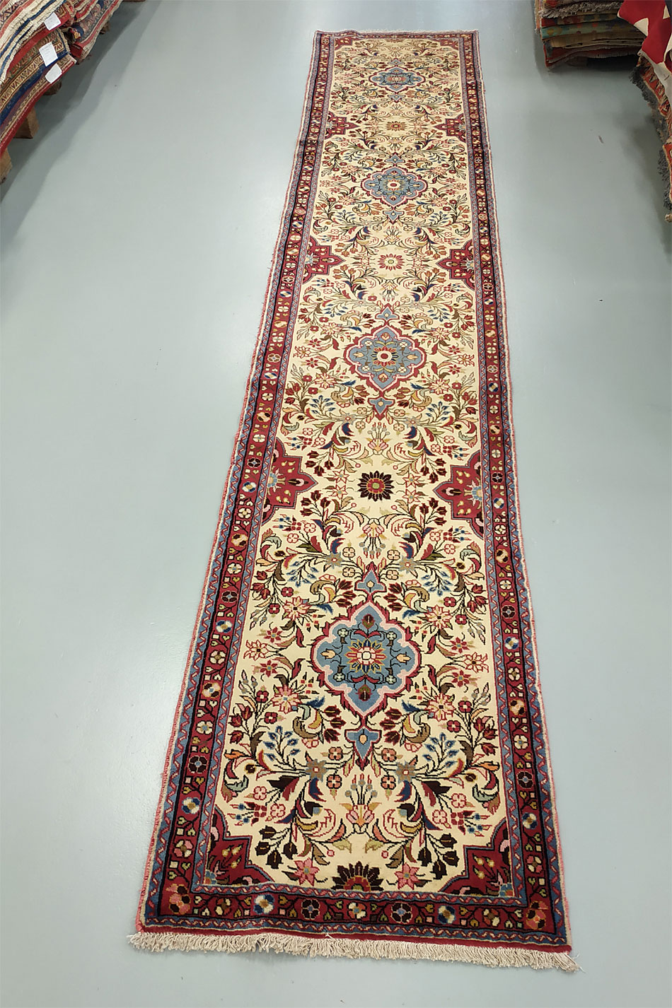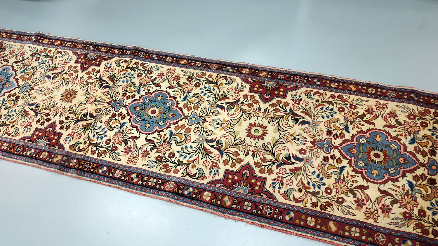 Dimensions : 400 x 79 cm -laine- Pays Iran - Épaisseur : 8 mm - Densité de nouage : 150.000 Nœuds au m² - Surface : 3.16 m² - Poids : 9.48 Kgs - Age : contemporain - Confection : Noué main - Forme : Tapis de couloirs - Type : Tapis persan