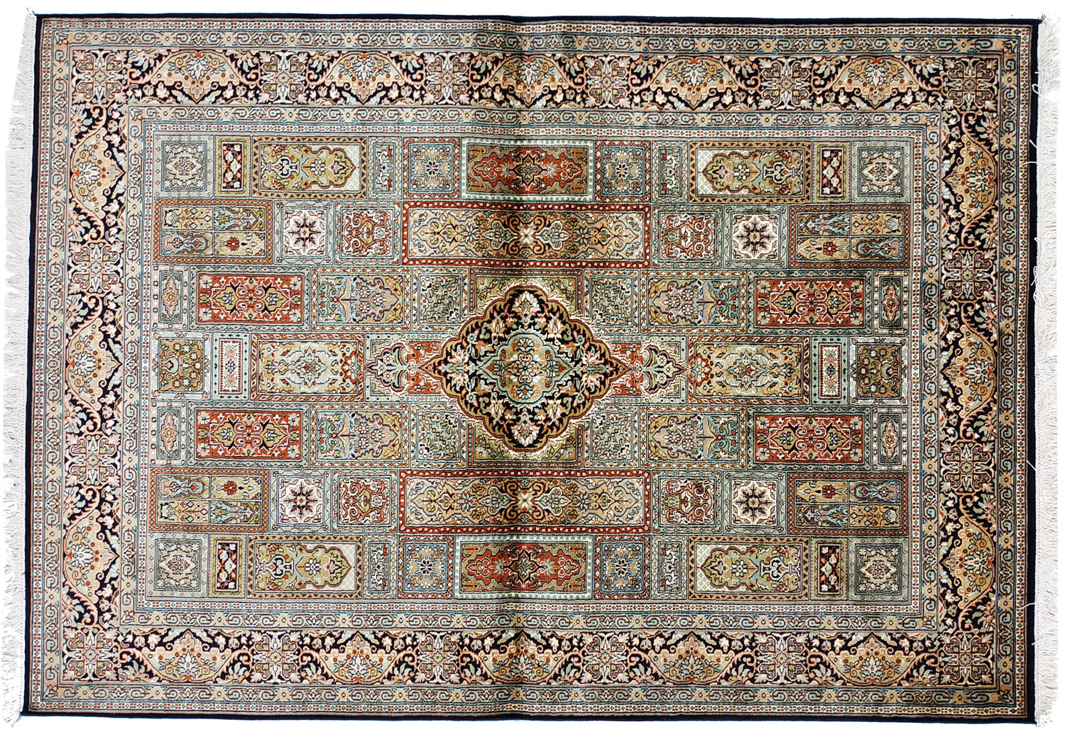 Dimensions : 180 x 123 cm -soie- Pays Inde - Épaisseur : 6 mm - Densité de nouage : 500.000 Nœuds au m² - Surface : 2.21 m² - Poids : 4.43 Kgs - Age : contemporain - Confection : Noué main - Forme : Tapis de chambre - Type : Tapis Oriental
