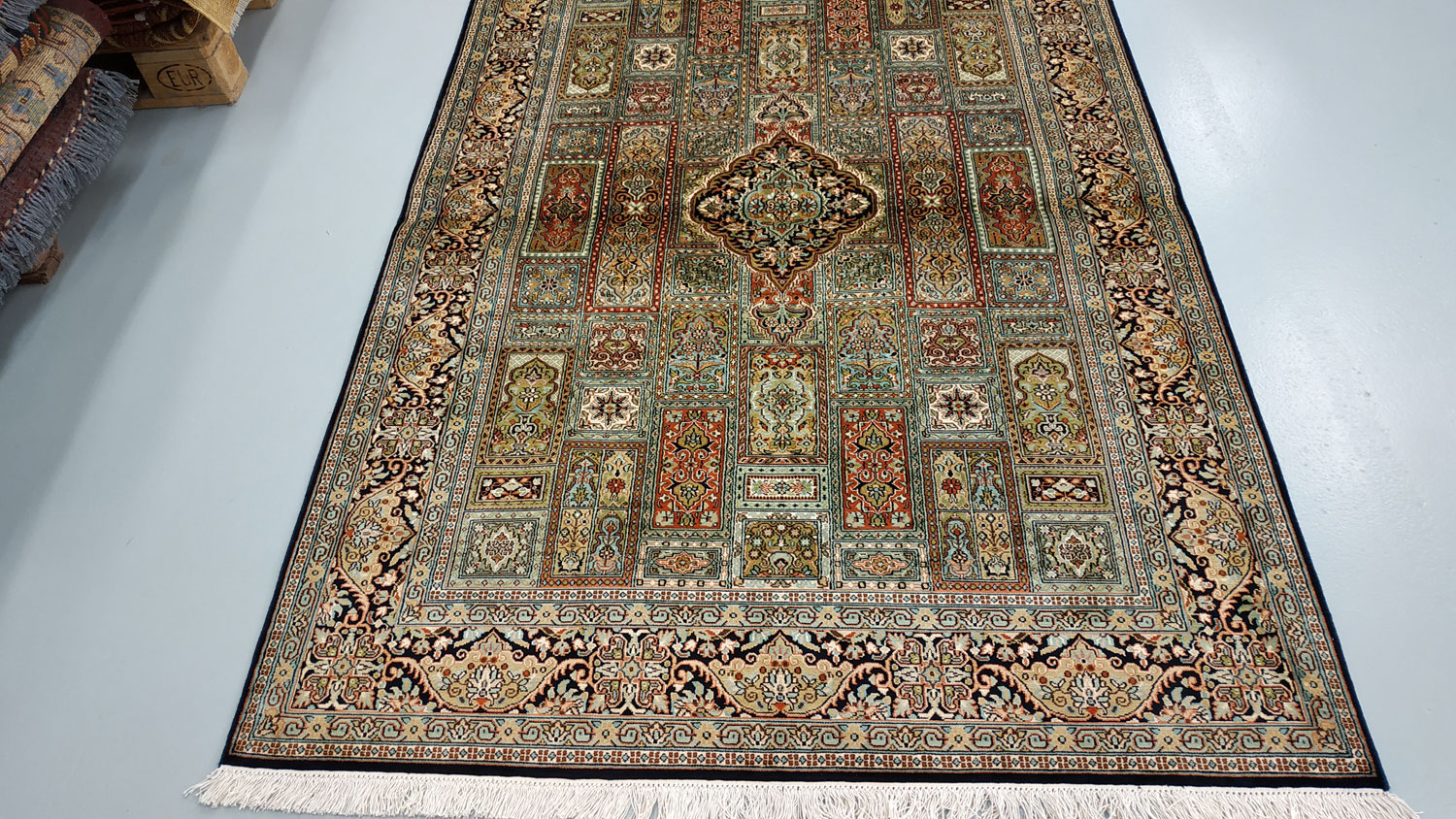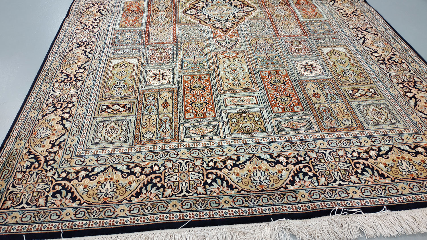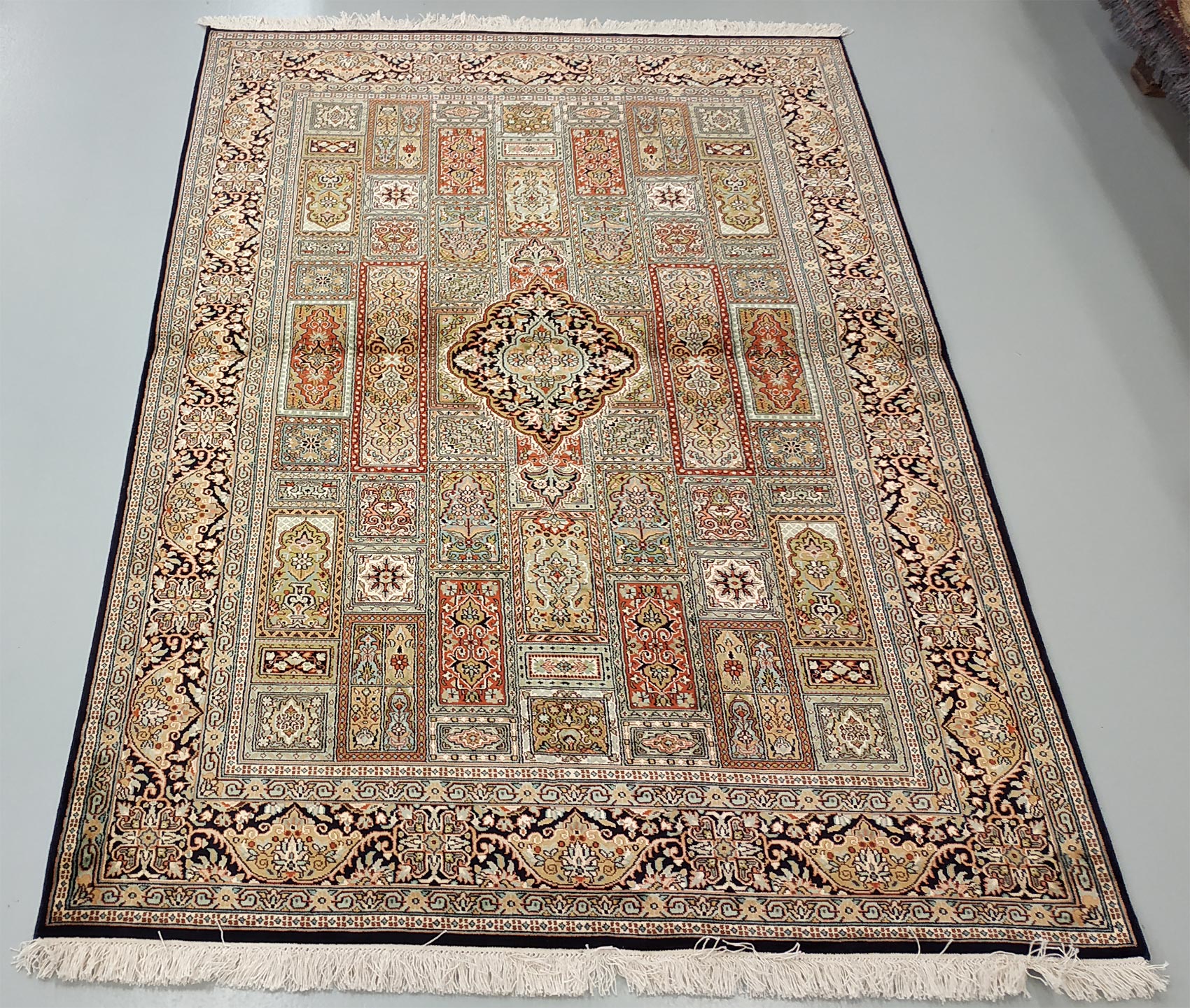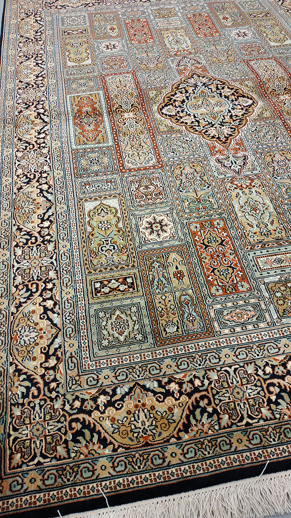 Dimensions : 183 x 122 cm -soie- Pays Inde - Épaisseur : 6 mm - Densité de nouage : 500.000 Nœuds au m² - Surface : 2.23 m² - Poids : 4.47 Kgs - Age : contemporain - Confection : Noué main - Forme : Tapis de chambre - Type : Tapis Oriental