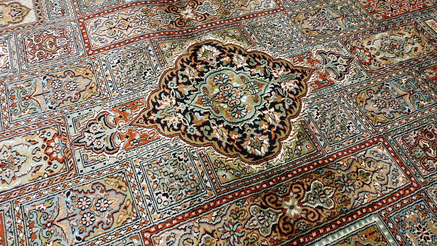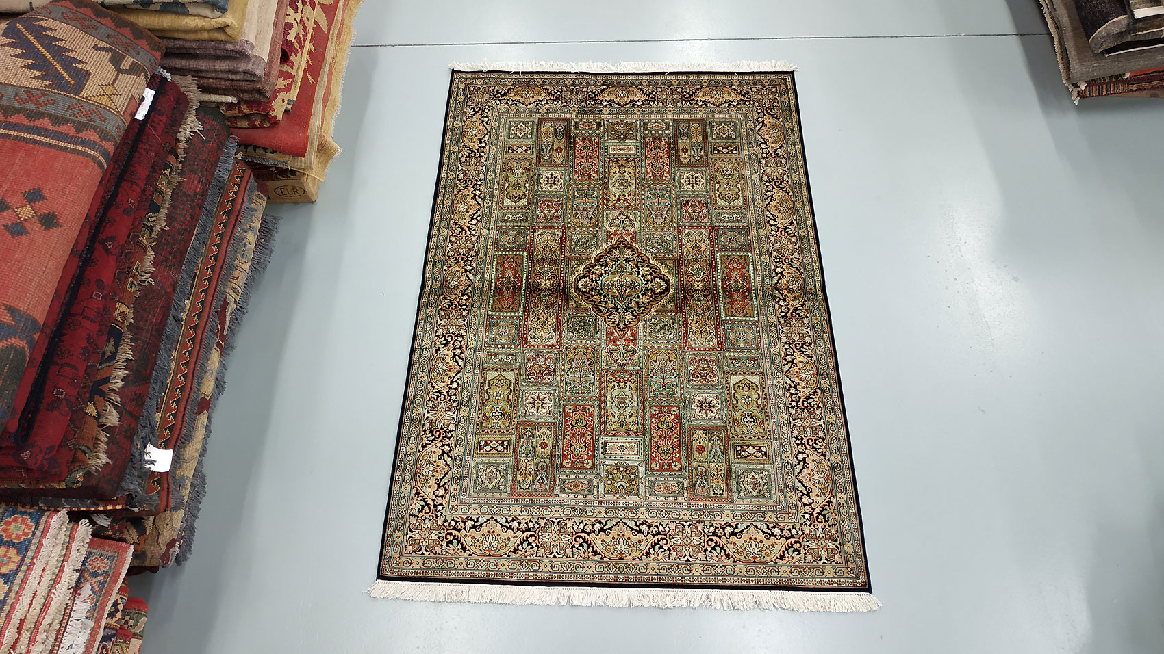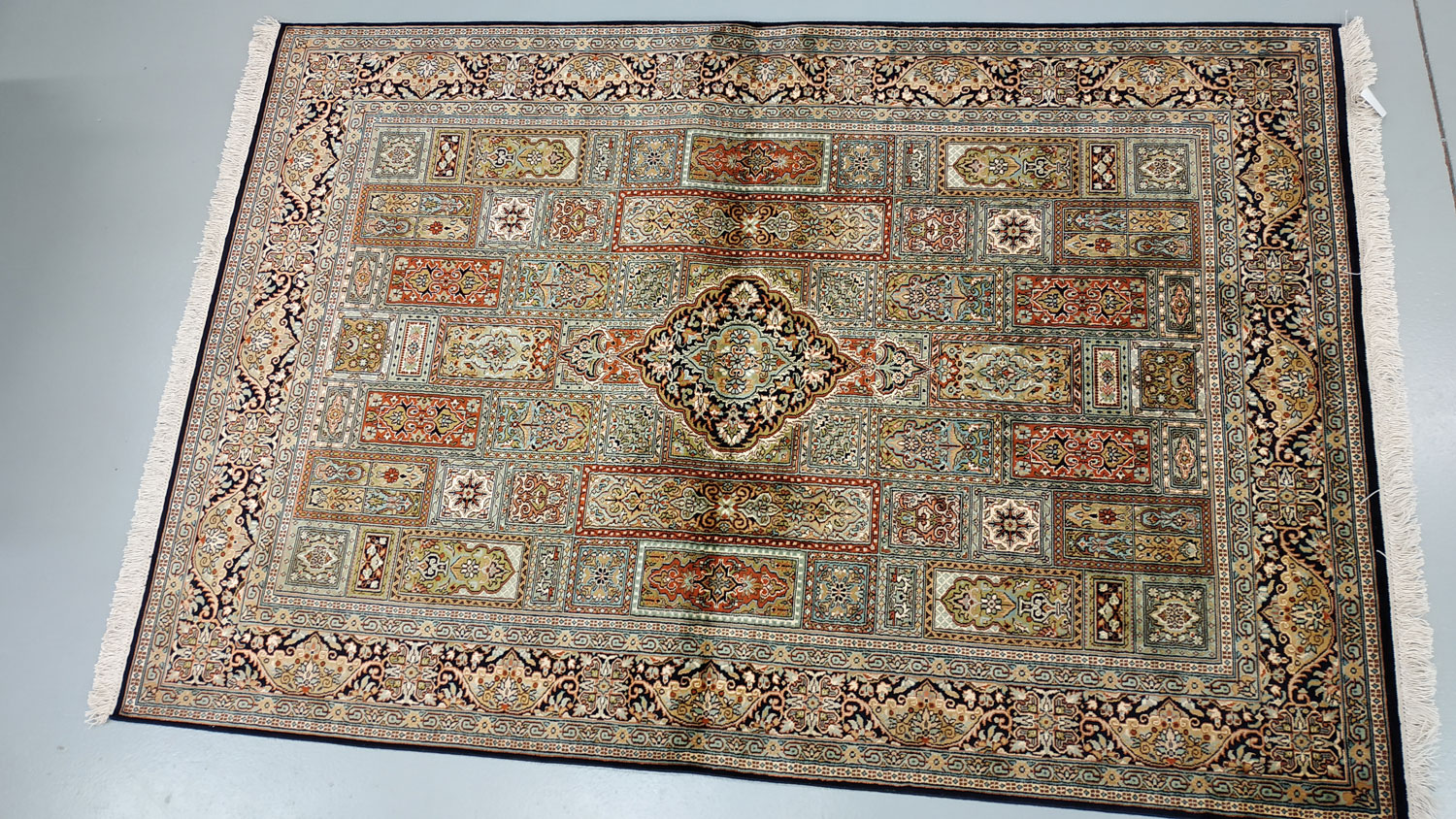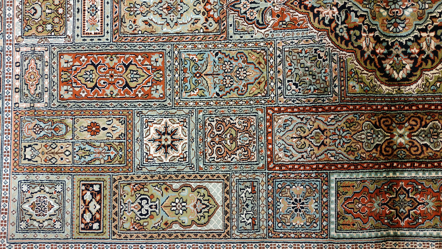 Dimensions : 183 x 122 cm -soie- Pays Inde - Épaisseur : 6 mm - Densité de nouage : 500.000 Nœuds au m² - Surface : 2.23 m² - Poids : 4.47 Kgs - Age : contemporain - Confection : Noué main - Forme : Tapis de chambre - Type : Tapis Oriental